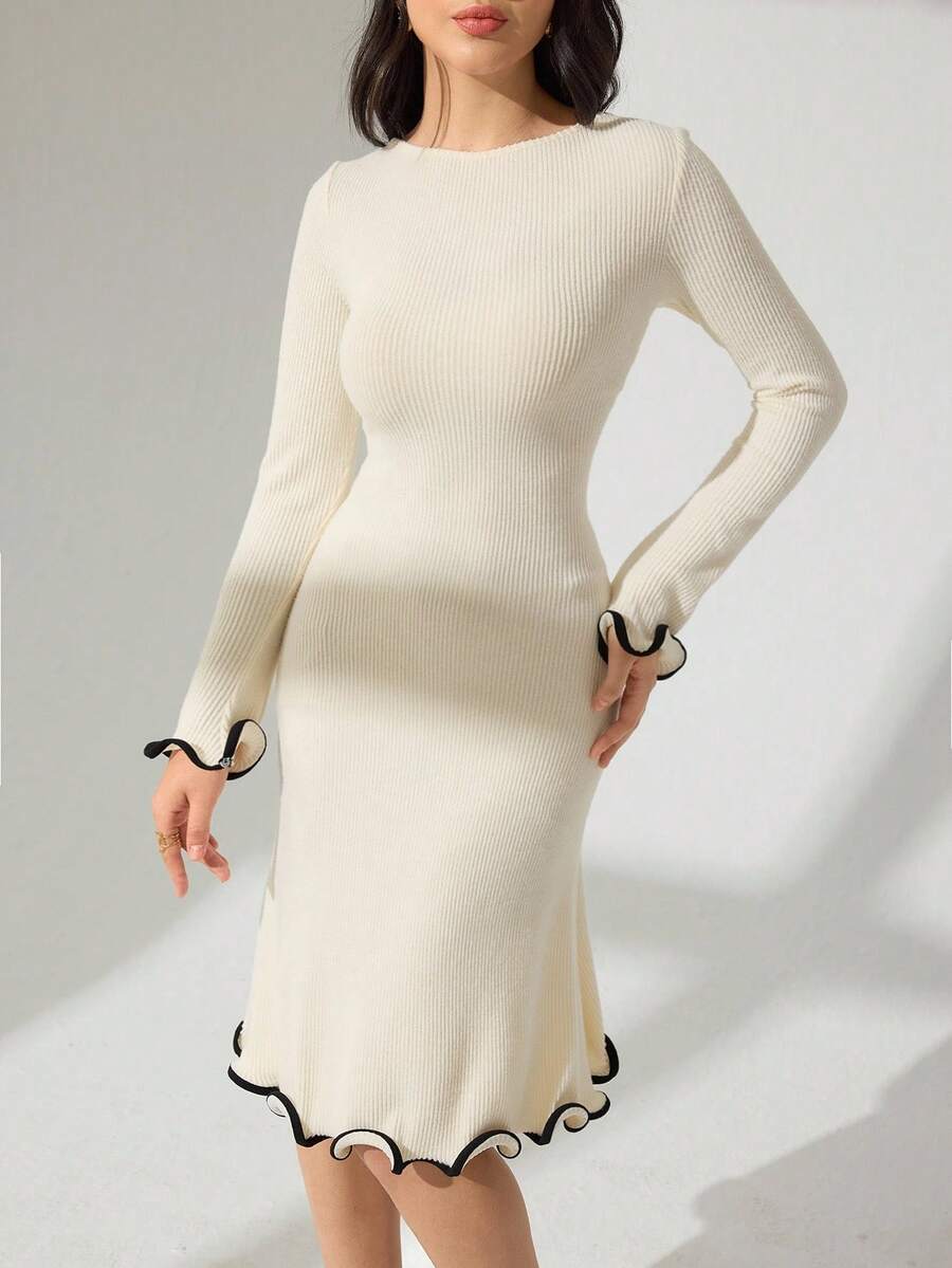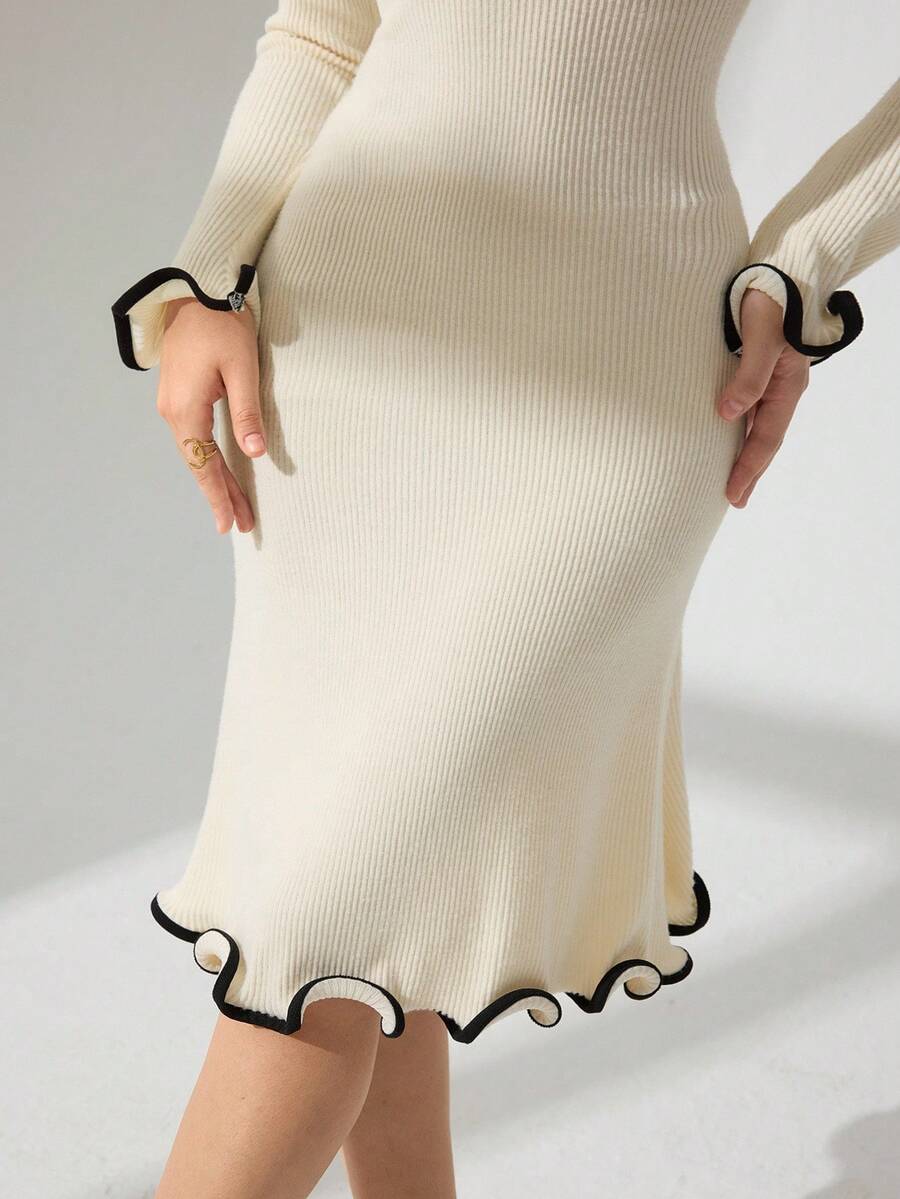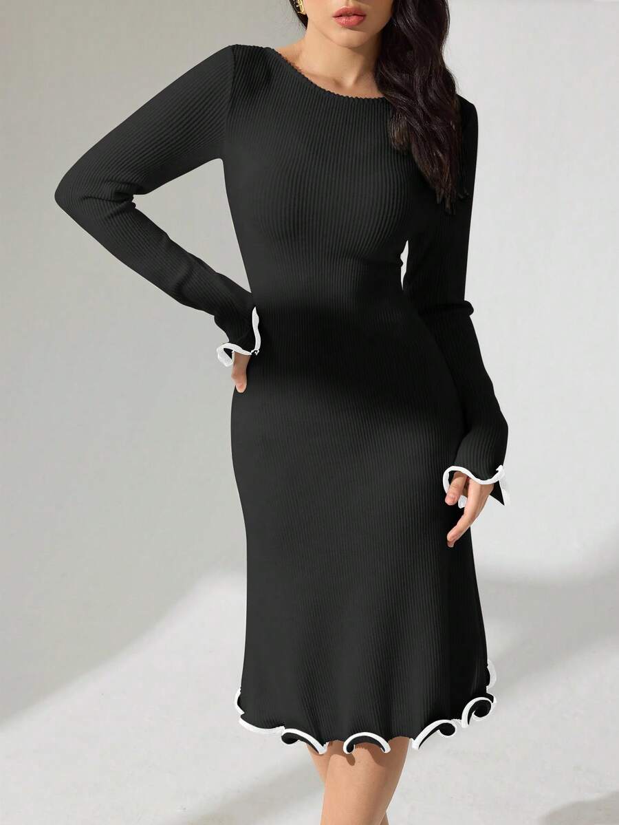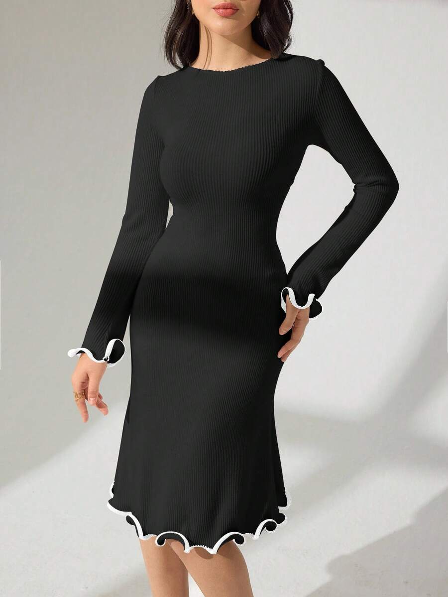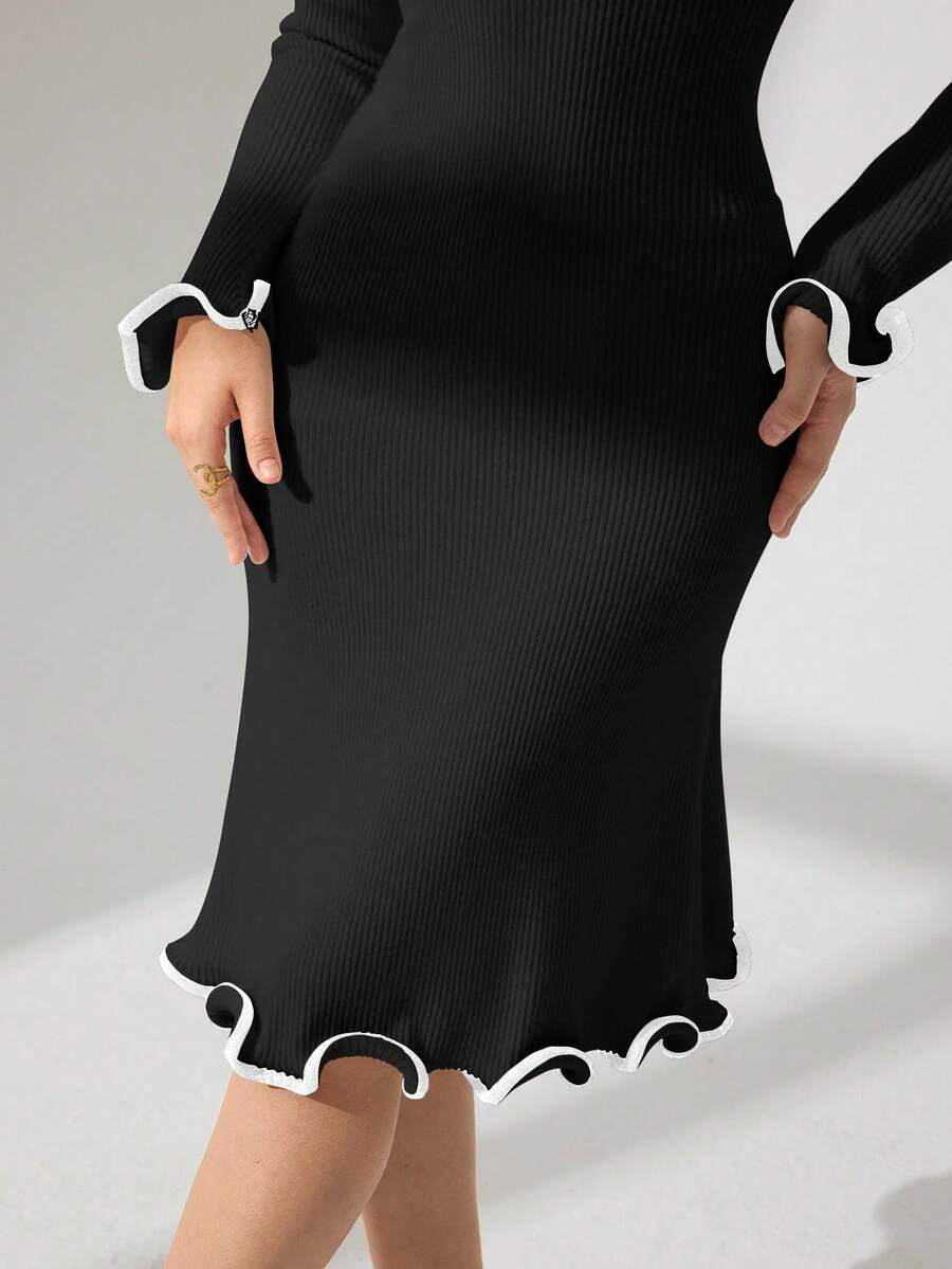 Abito aderente a maniche lunghe in maglia a costine con volant sul fondo