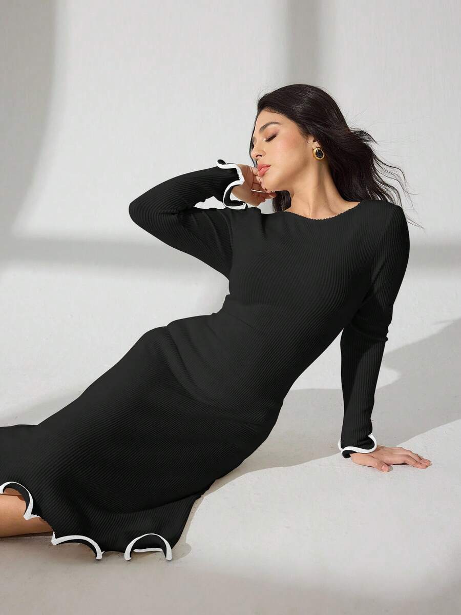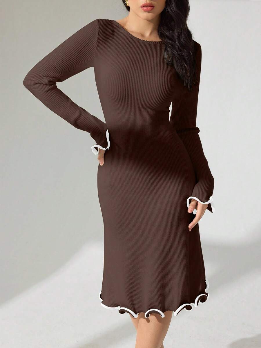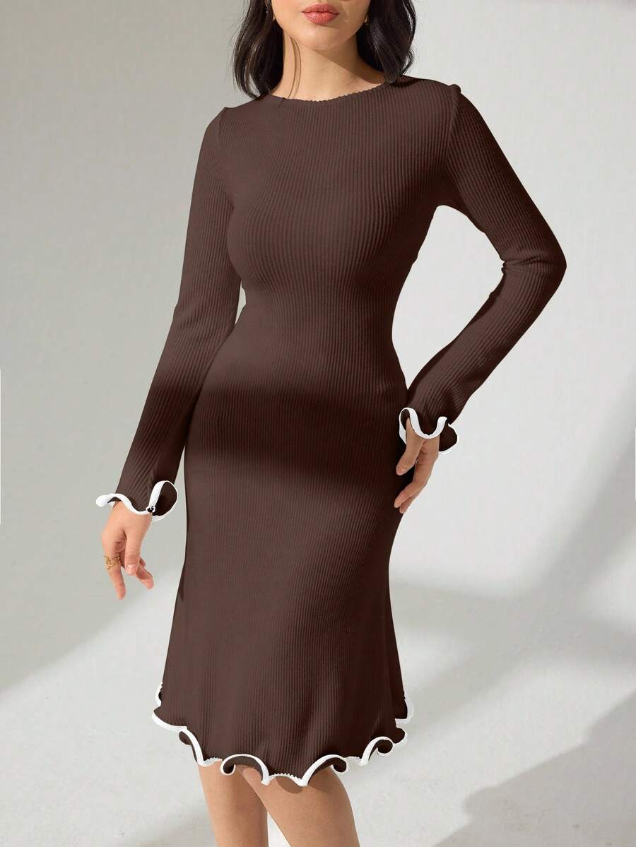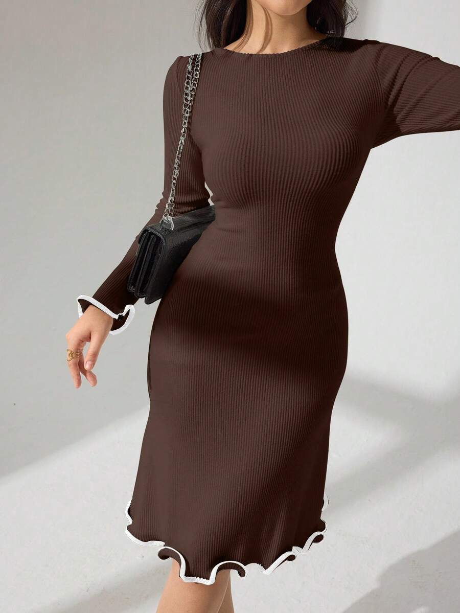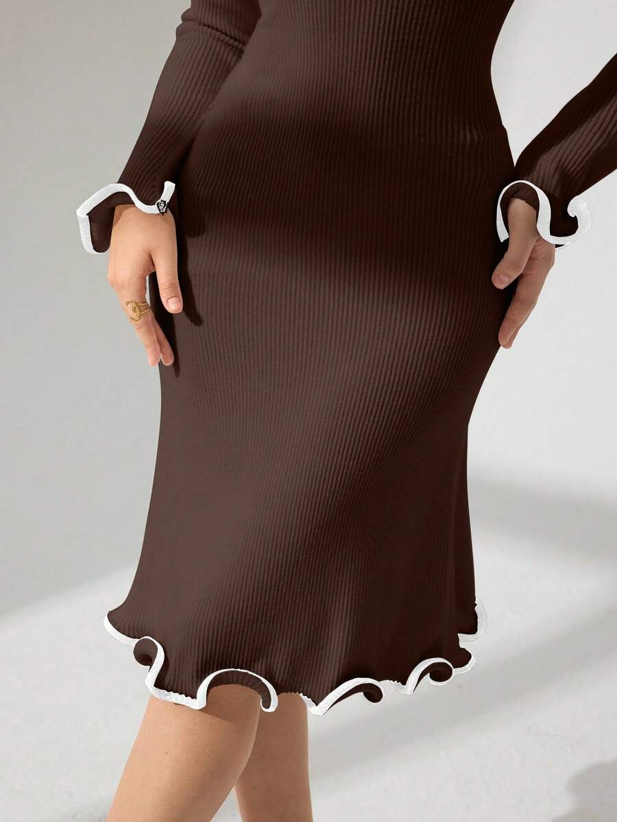 Abito aderente a maniche lunghe in maglia a costine con volant sul fondo