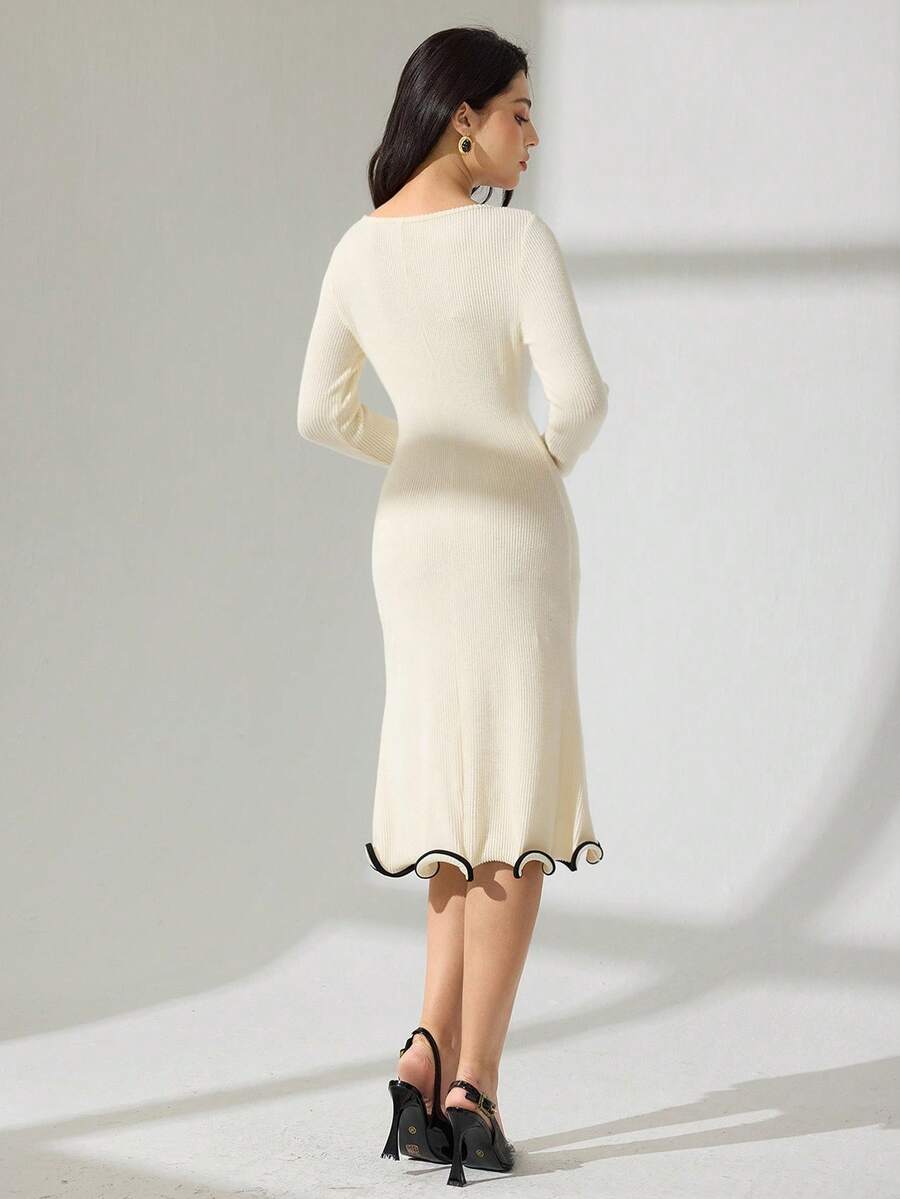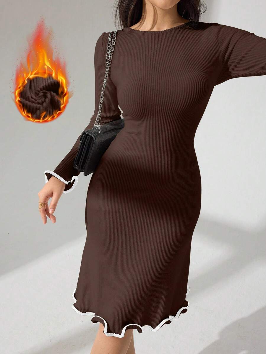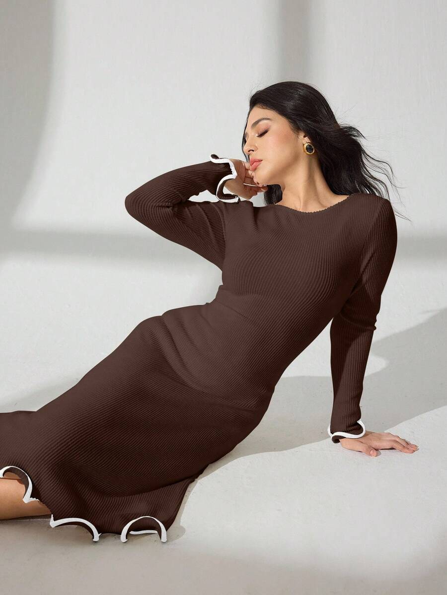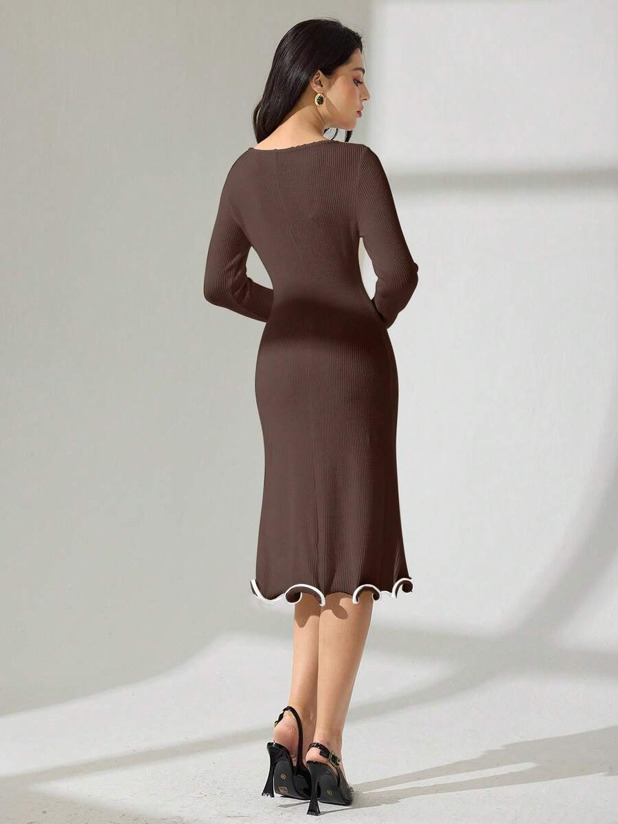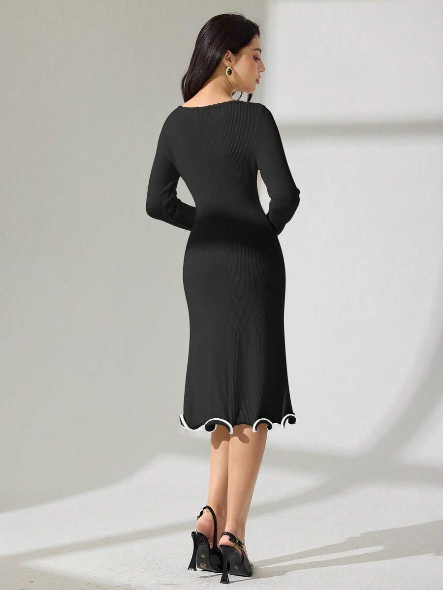 Abito aderente a maniche lunghe in maglia a costine con volant sul fondo