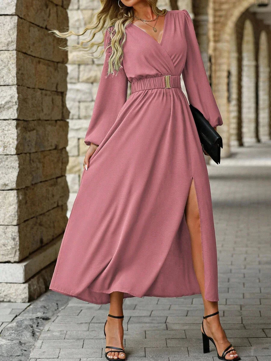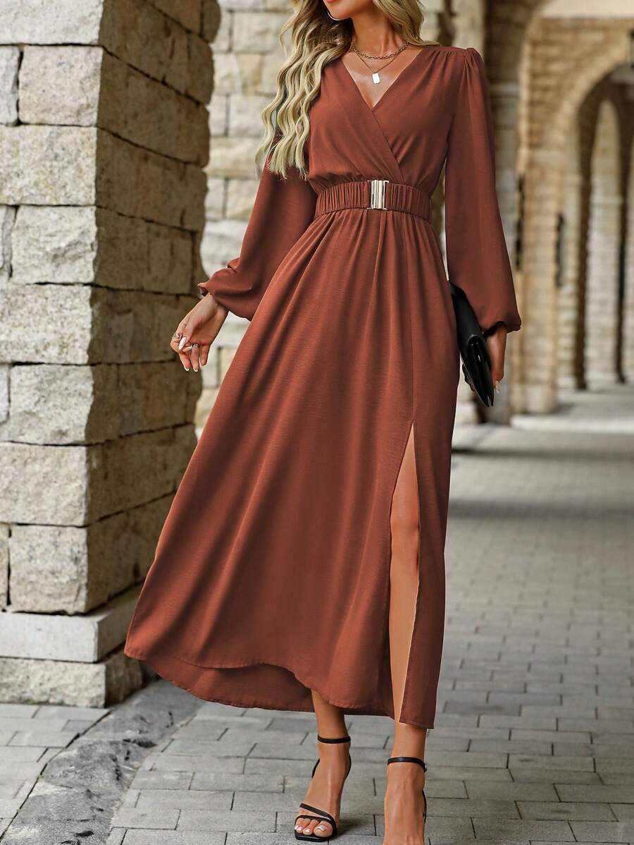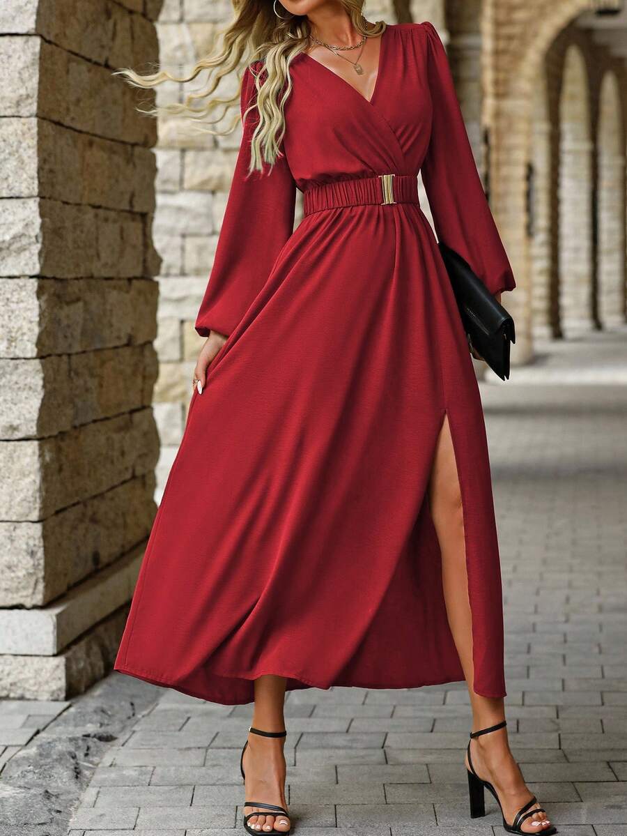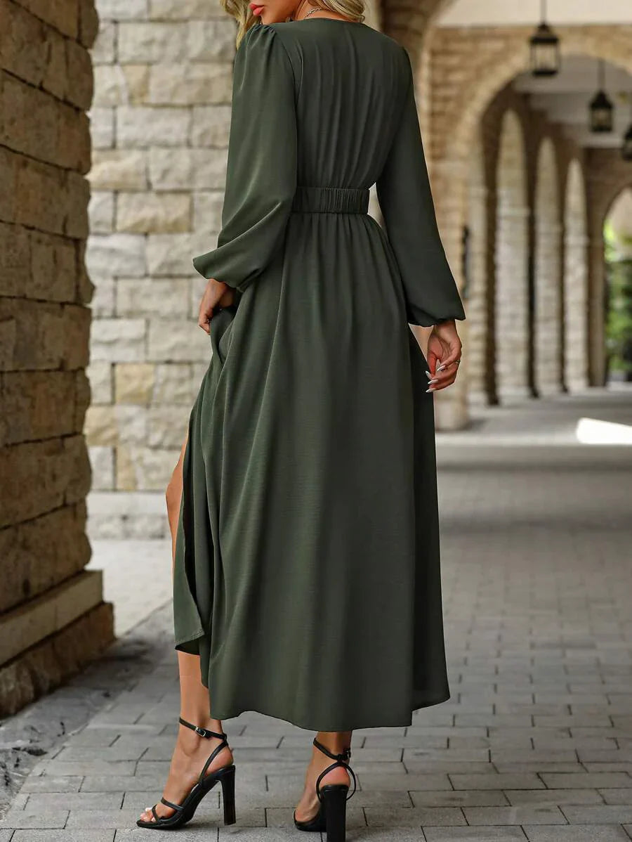 Abito casual da donna a maniche lunghe con scollo a V, abito lungo