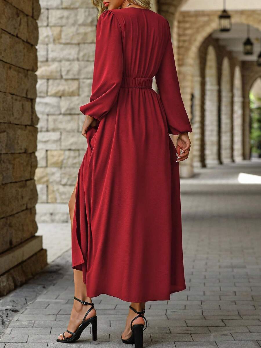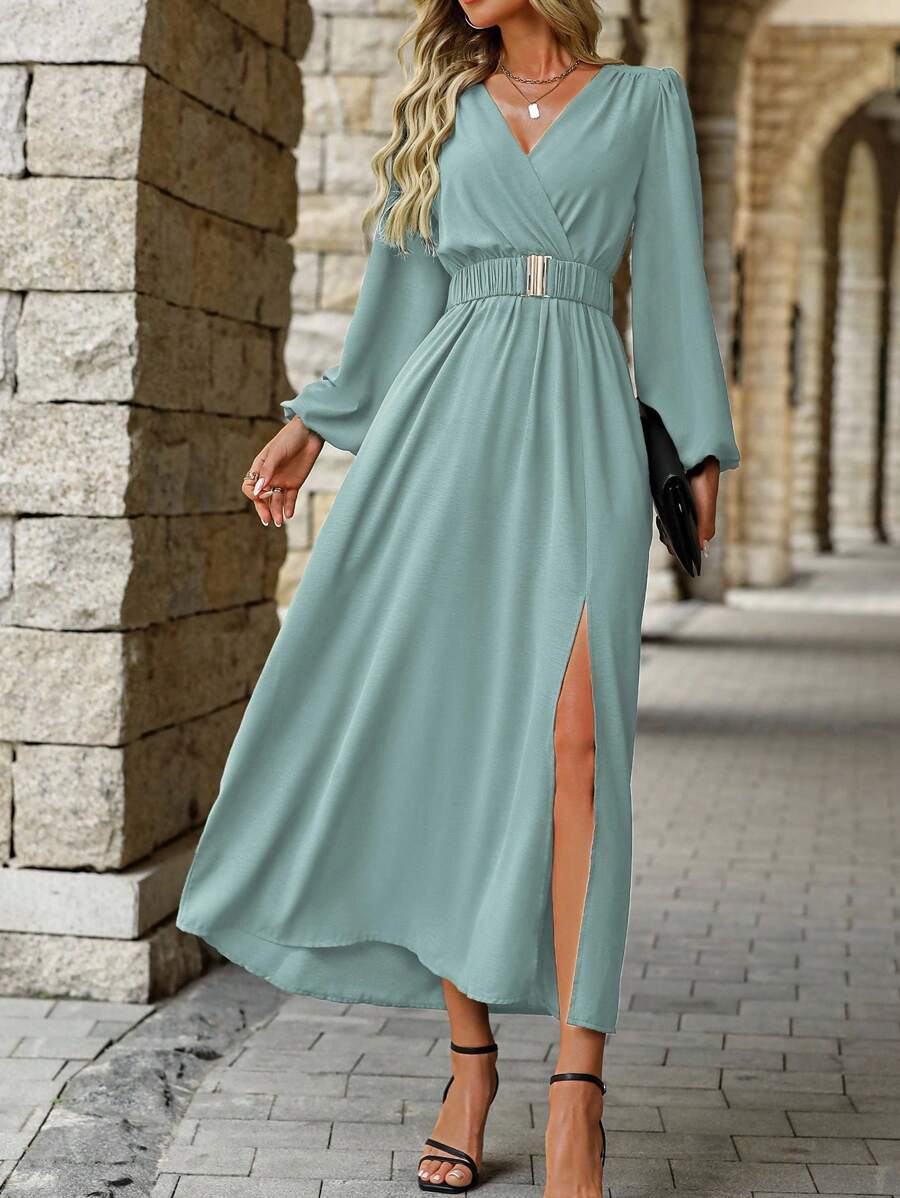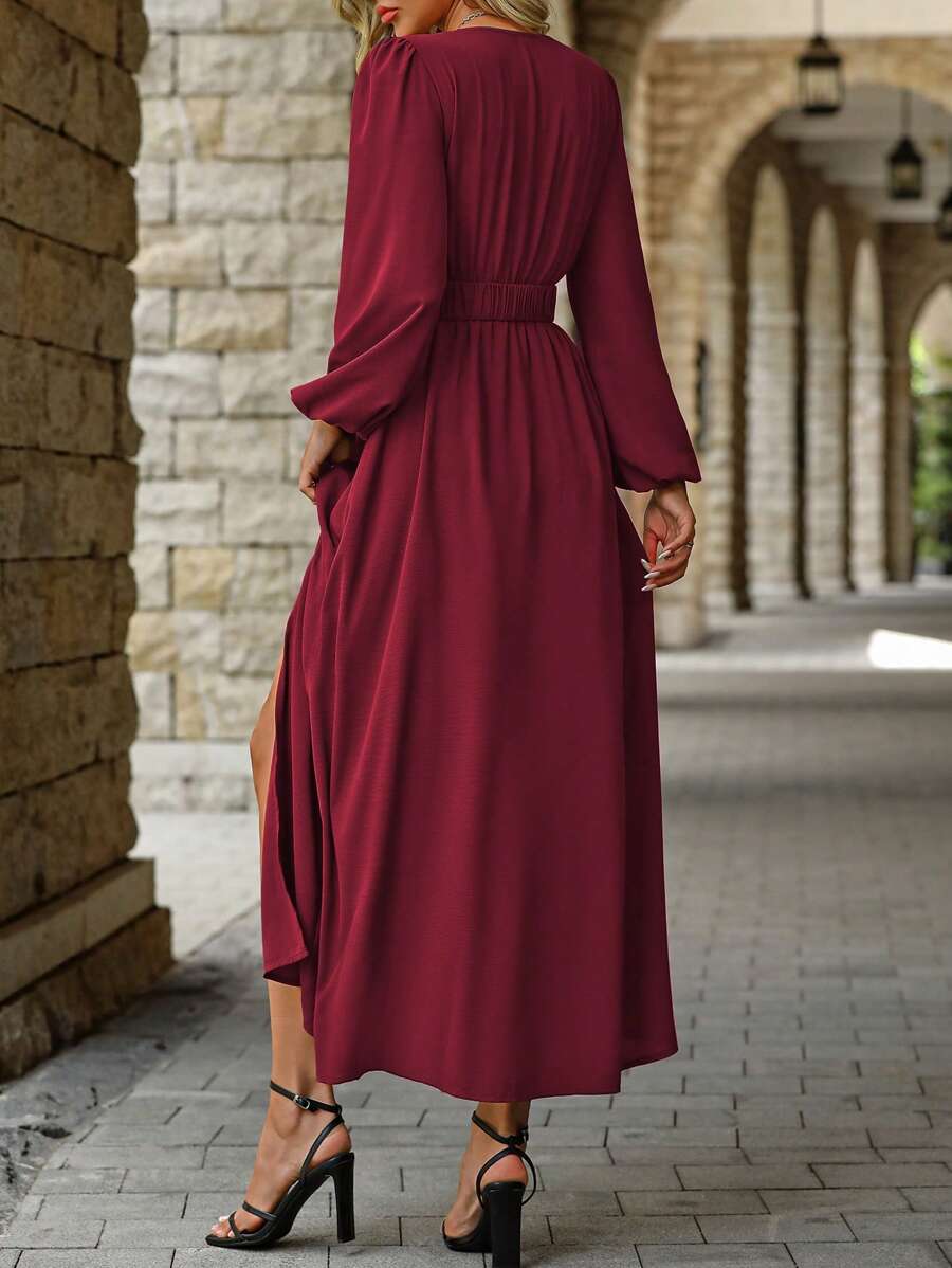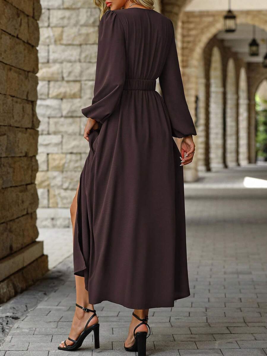 Abito casual da donna a maniche lunghe con scollo a V, abito lungo
