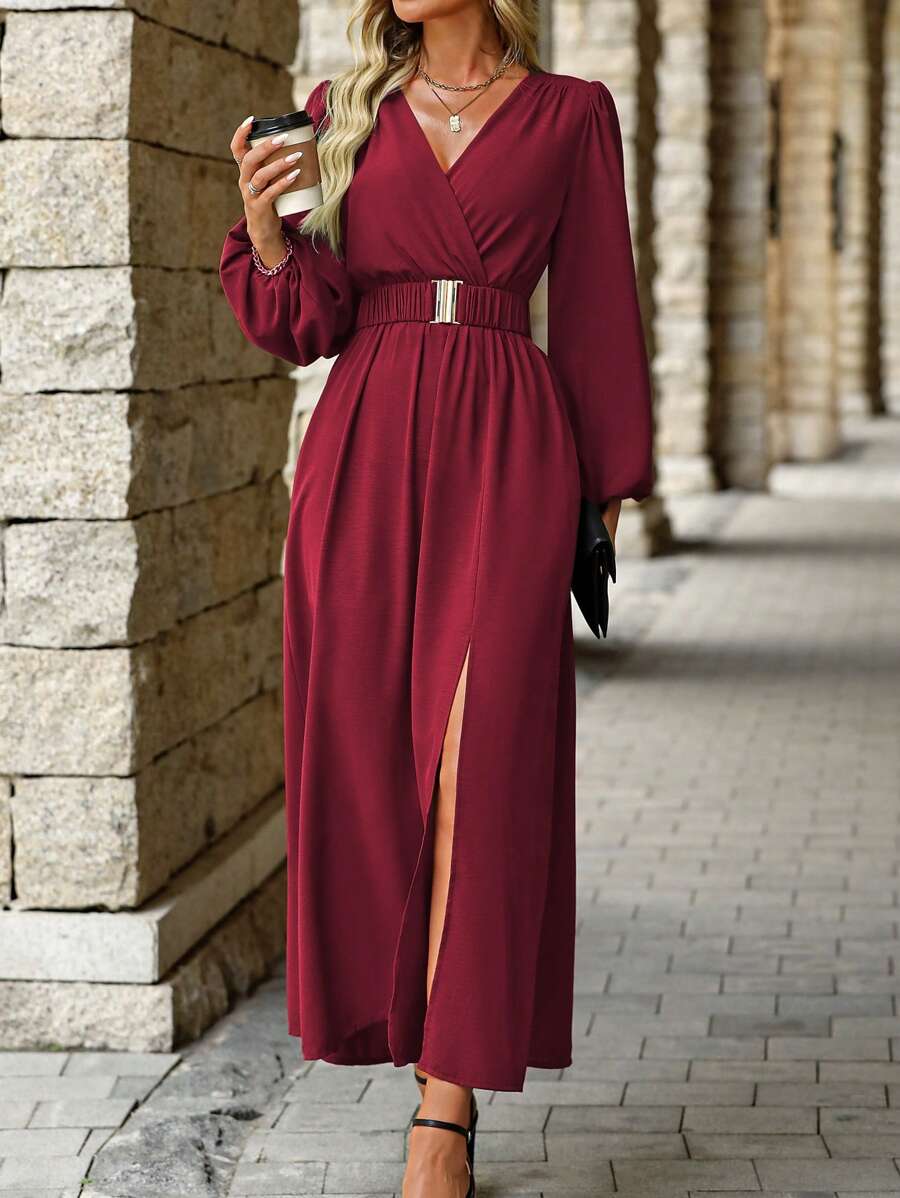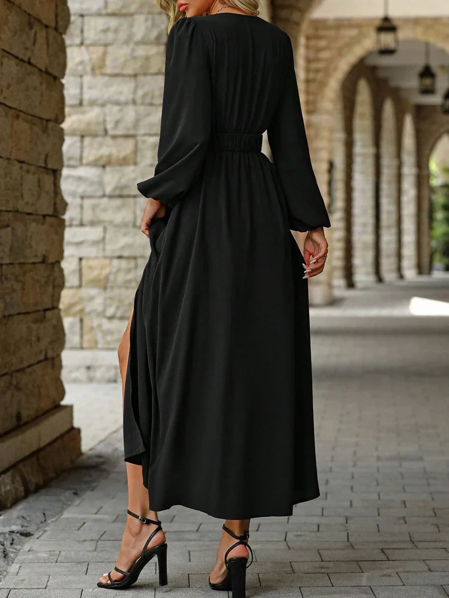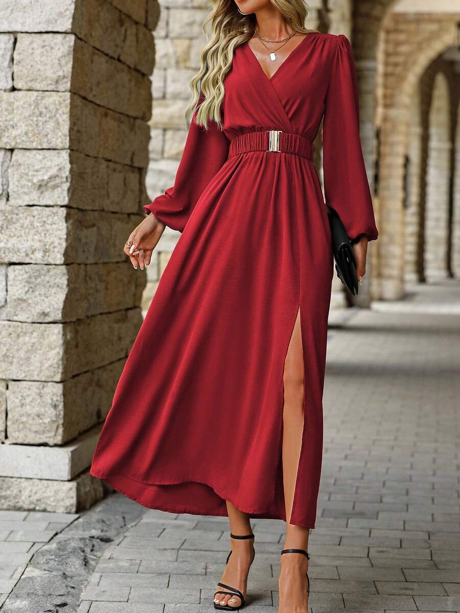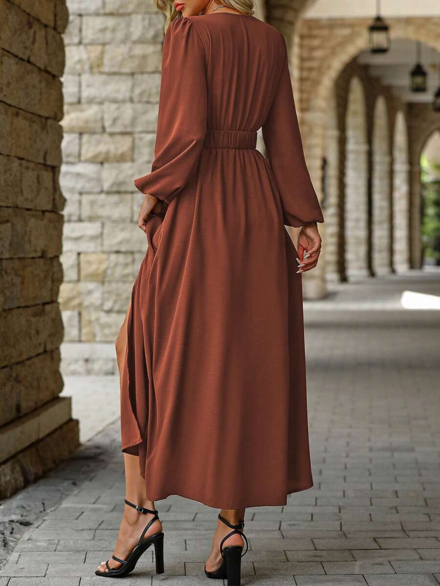 Abito casual da donna a maniche lunghe con scollo a V, abito lungo