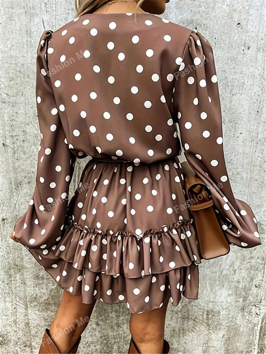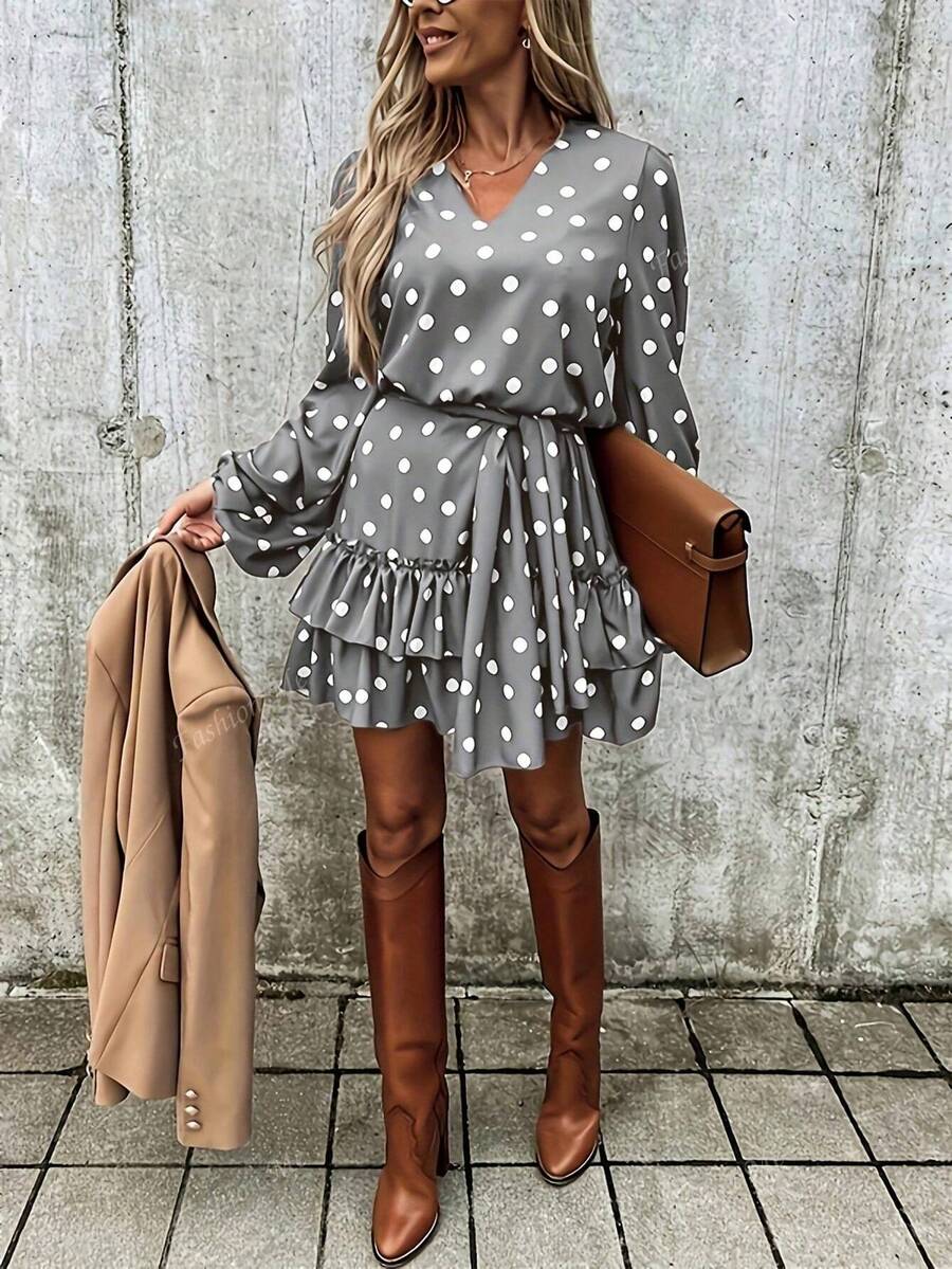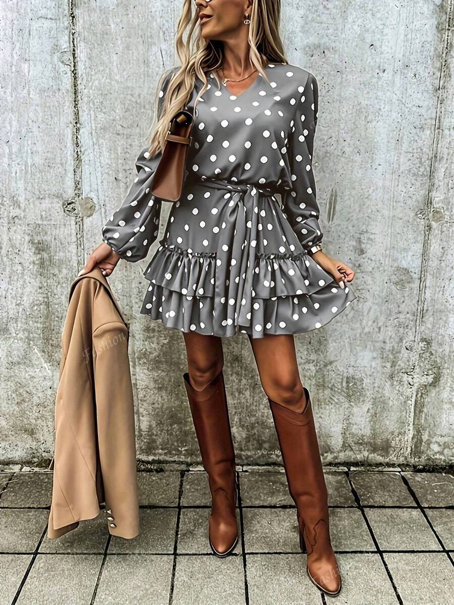 Abito con maniche lunghe, vita annodata, balze e motivo a pois per le donne