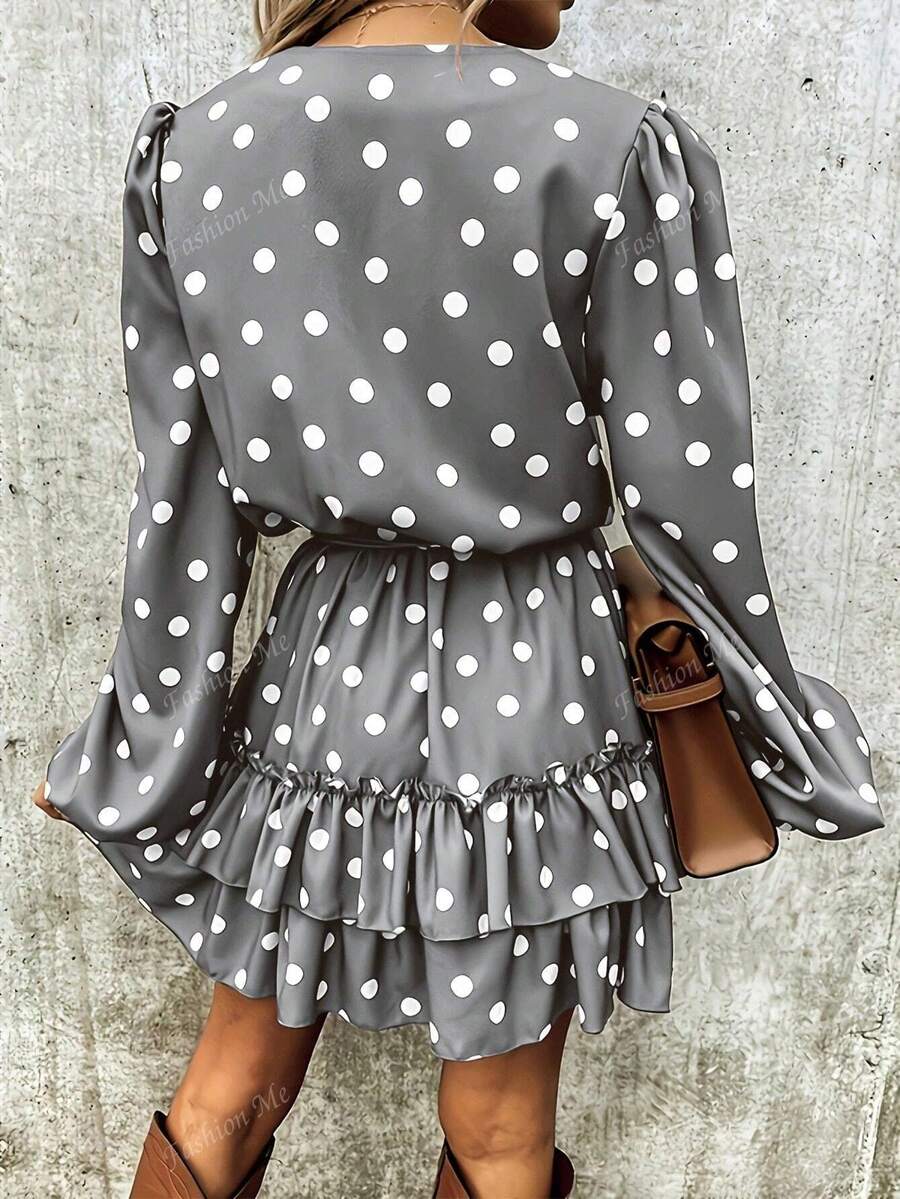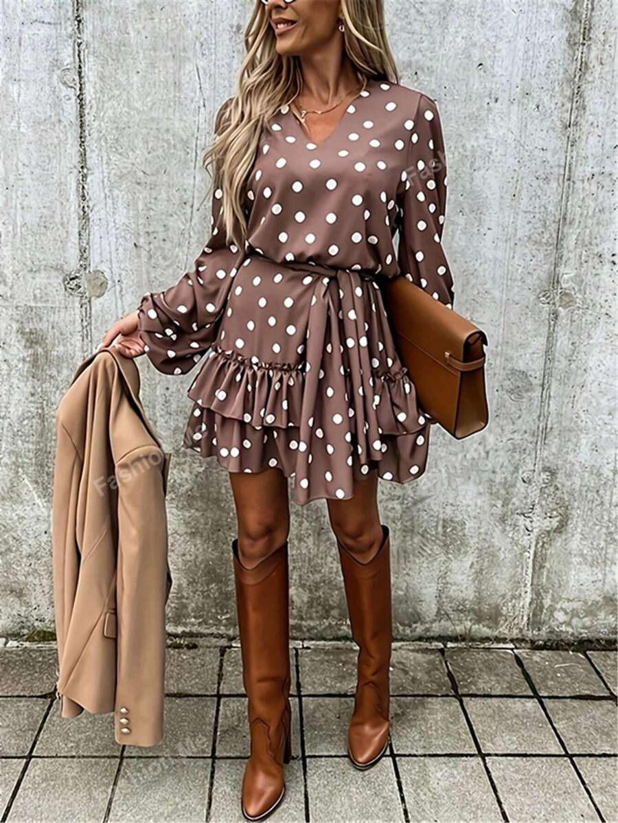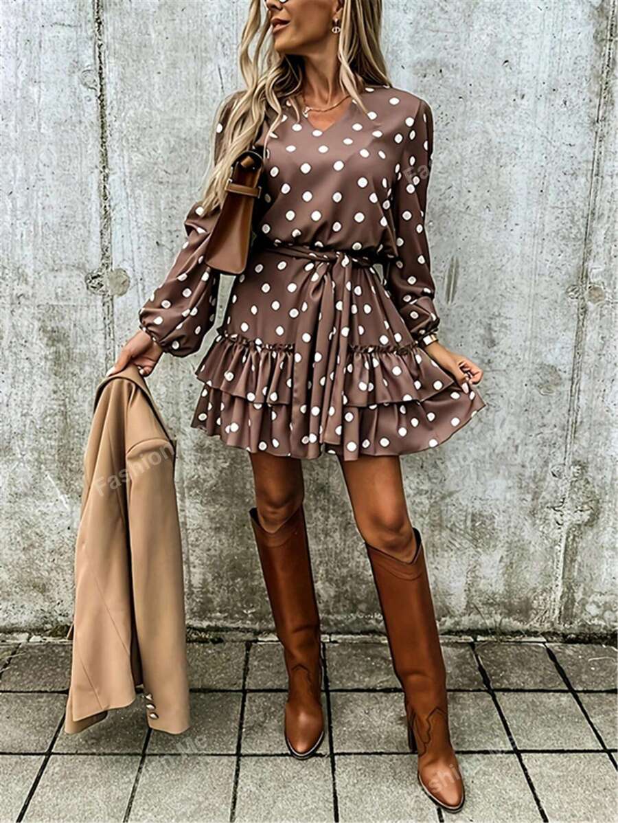 Abito con maniche lunghe, vita annodata, balze e motivo a pois per le donne