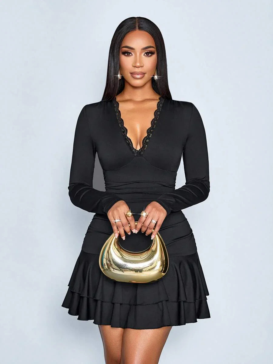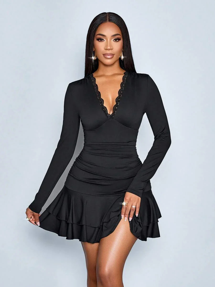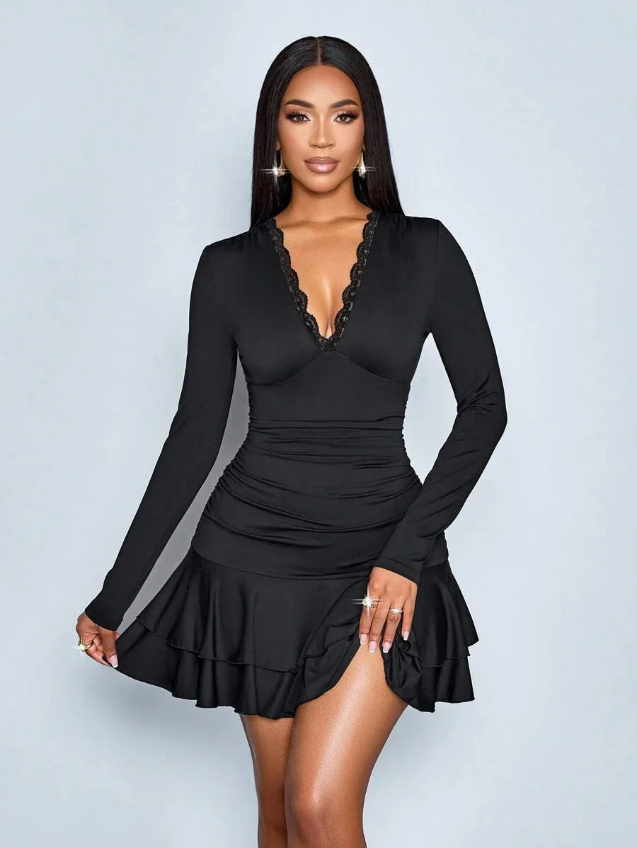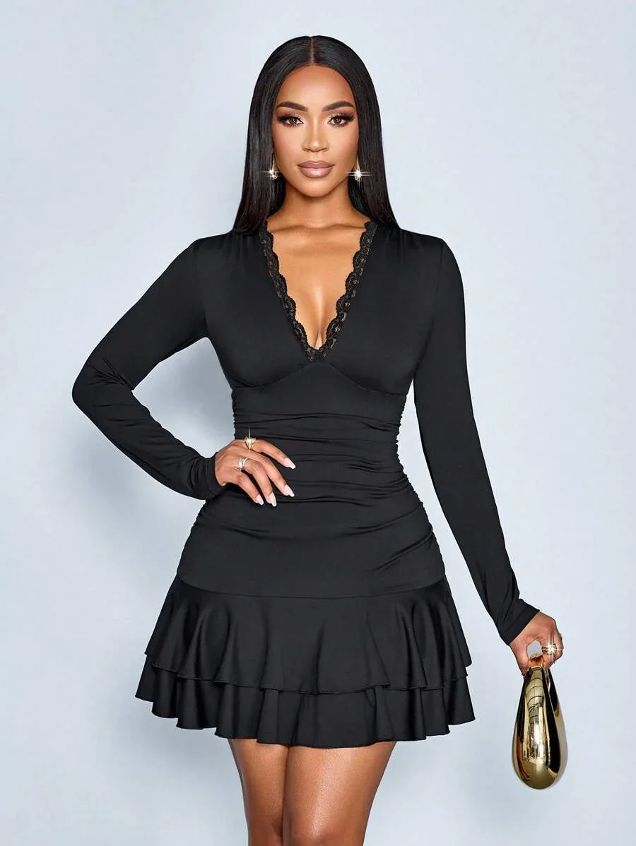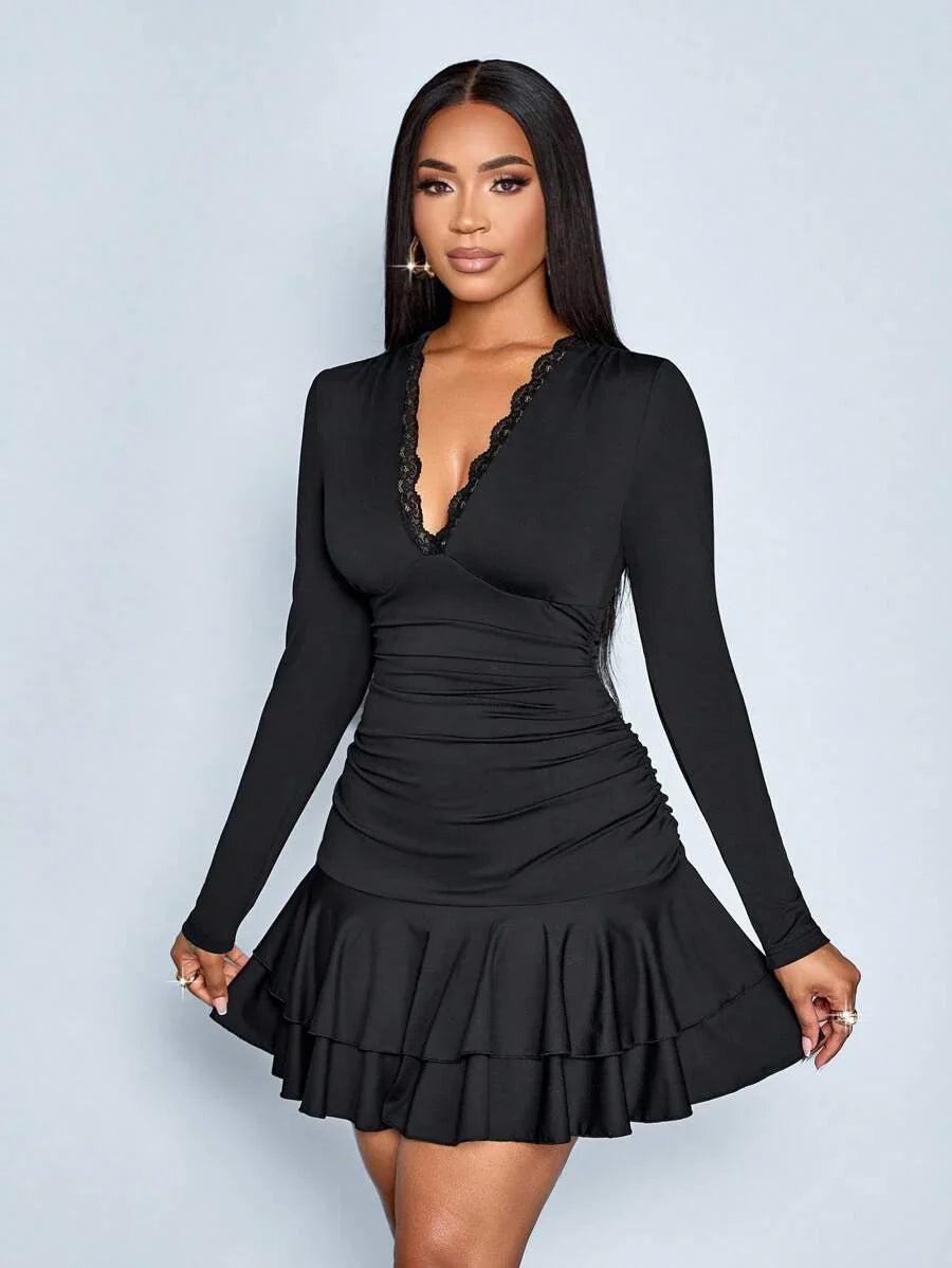 Abito corto da donna in maglia nera, casual, con maniche lunghe, scollo a V profondo, pizzo
