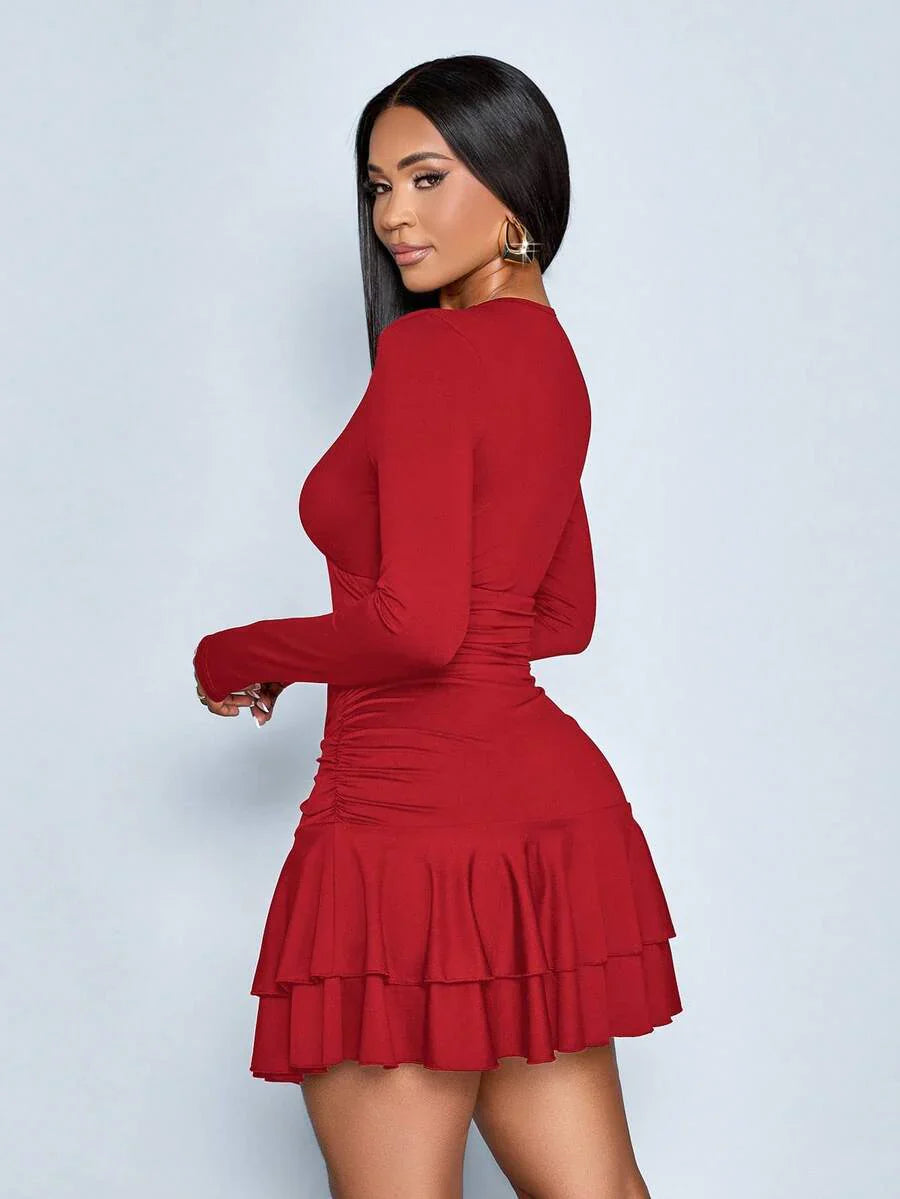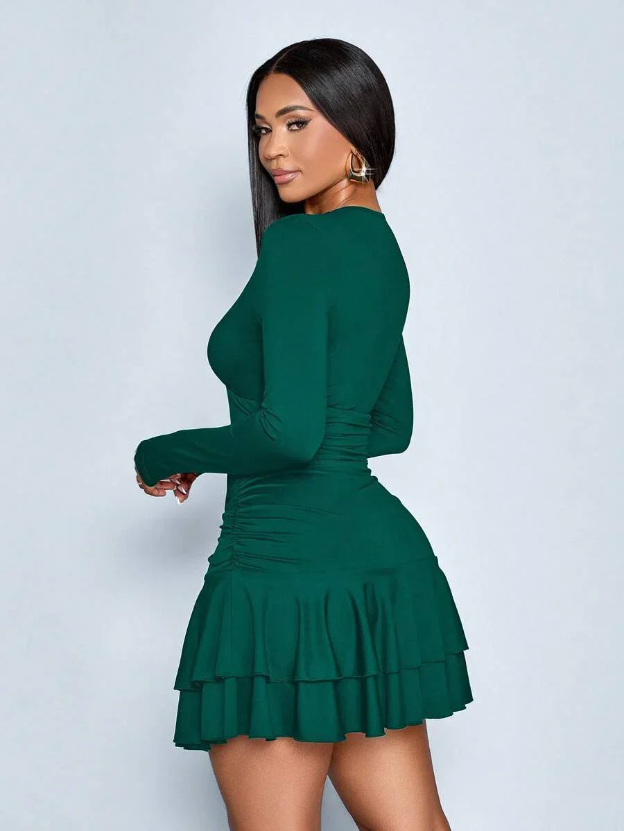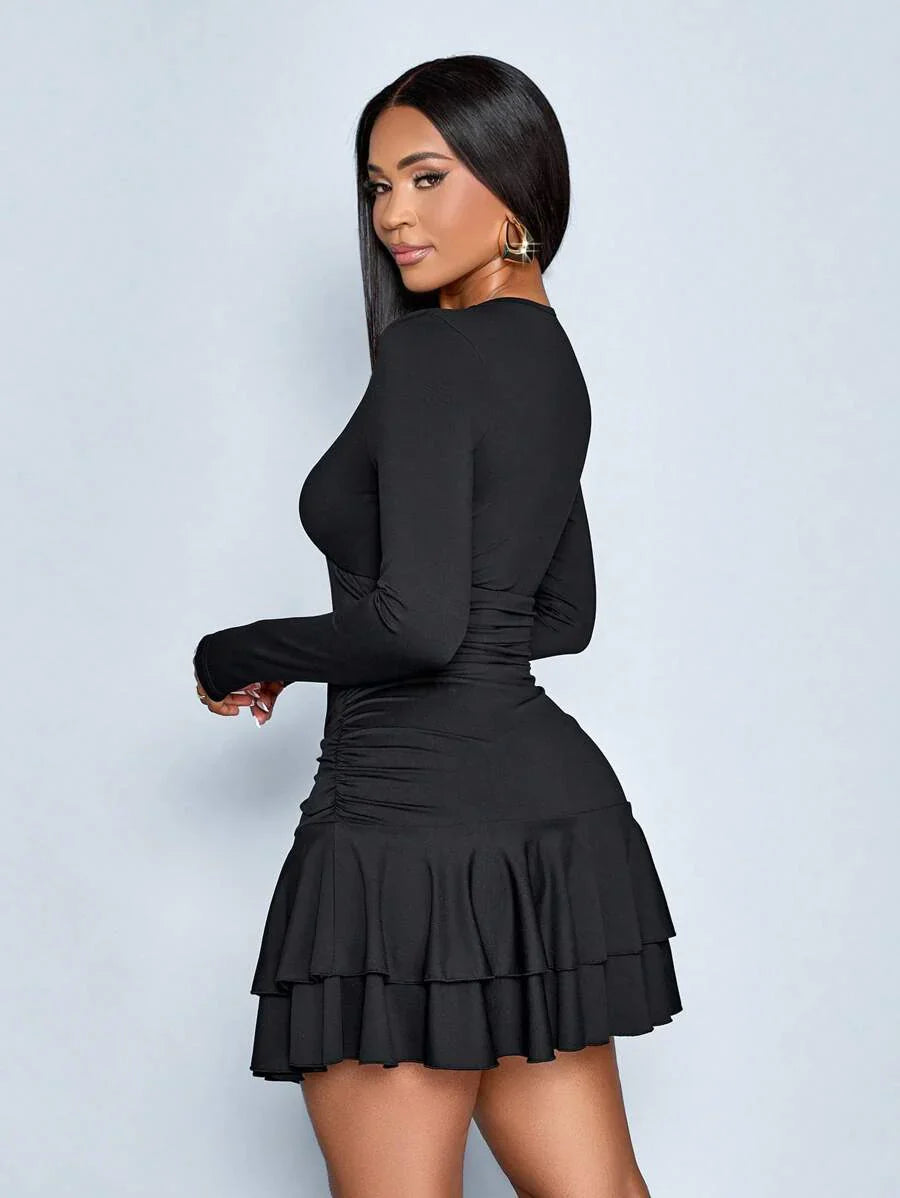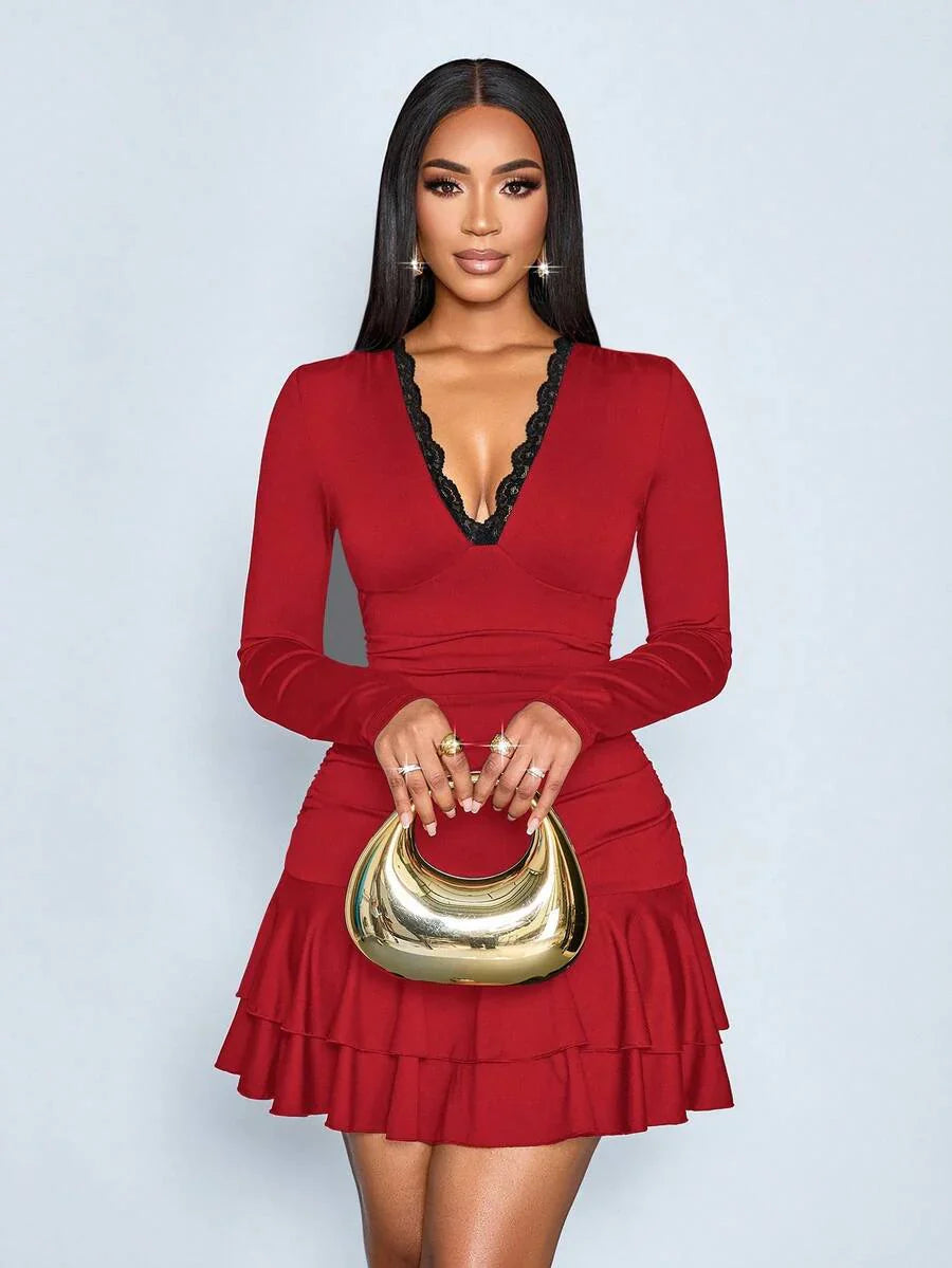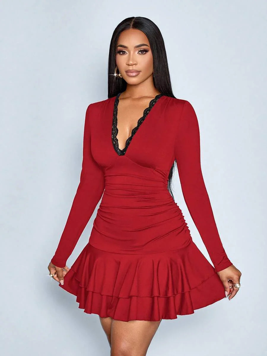 Abito corto da donna in maglia nera, casual, con maniche lunghe, scollo a V profondo, pizzo
