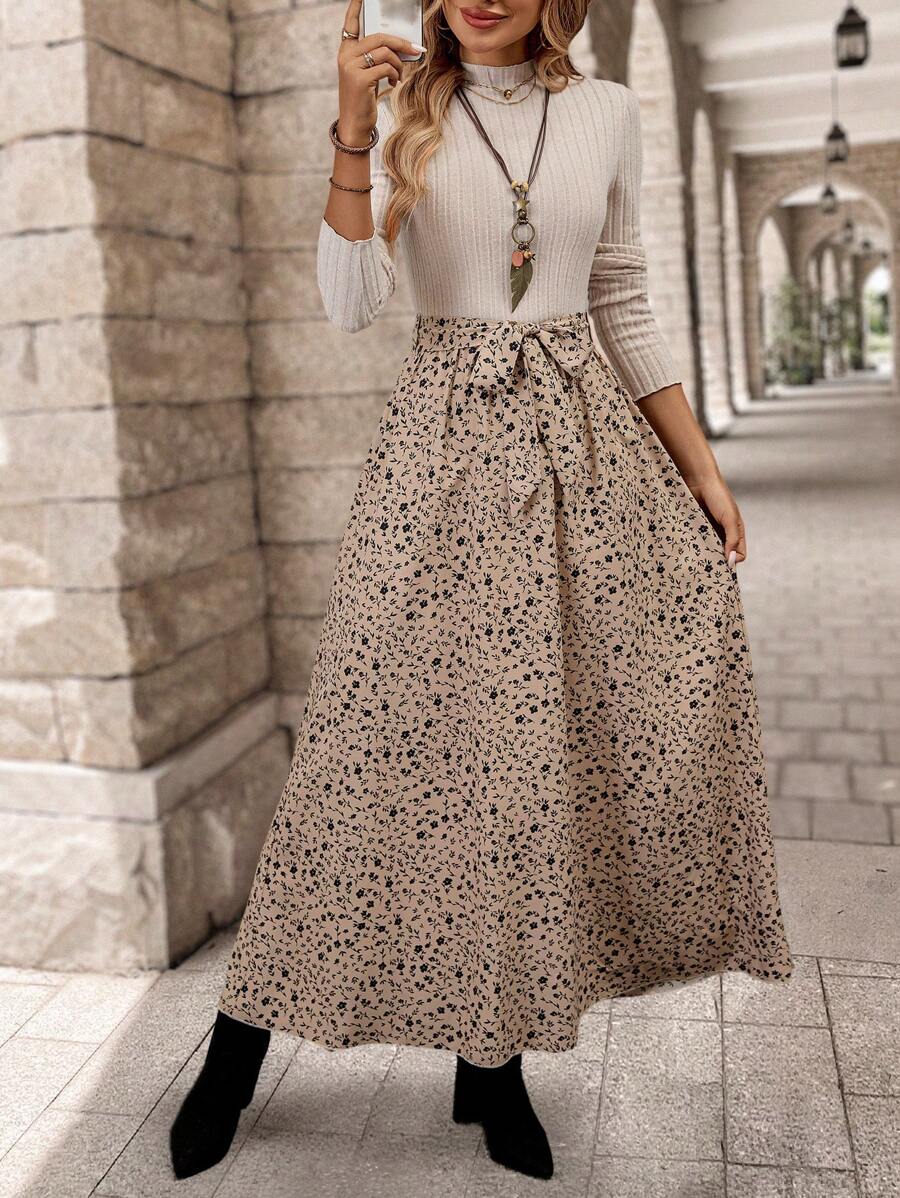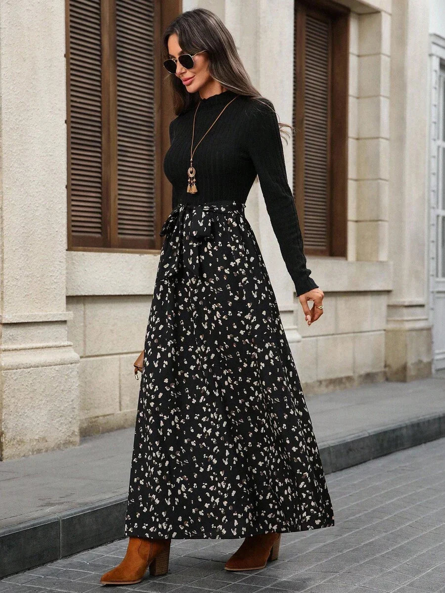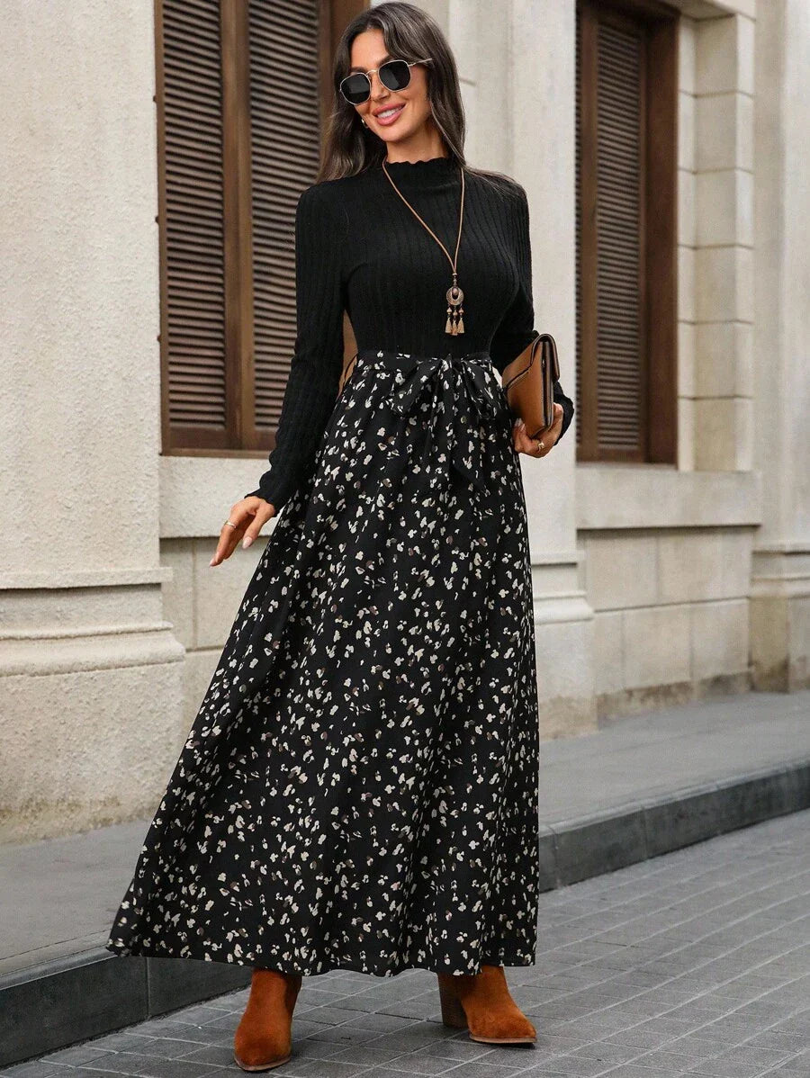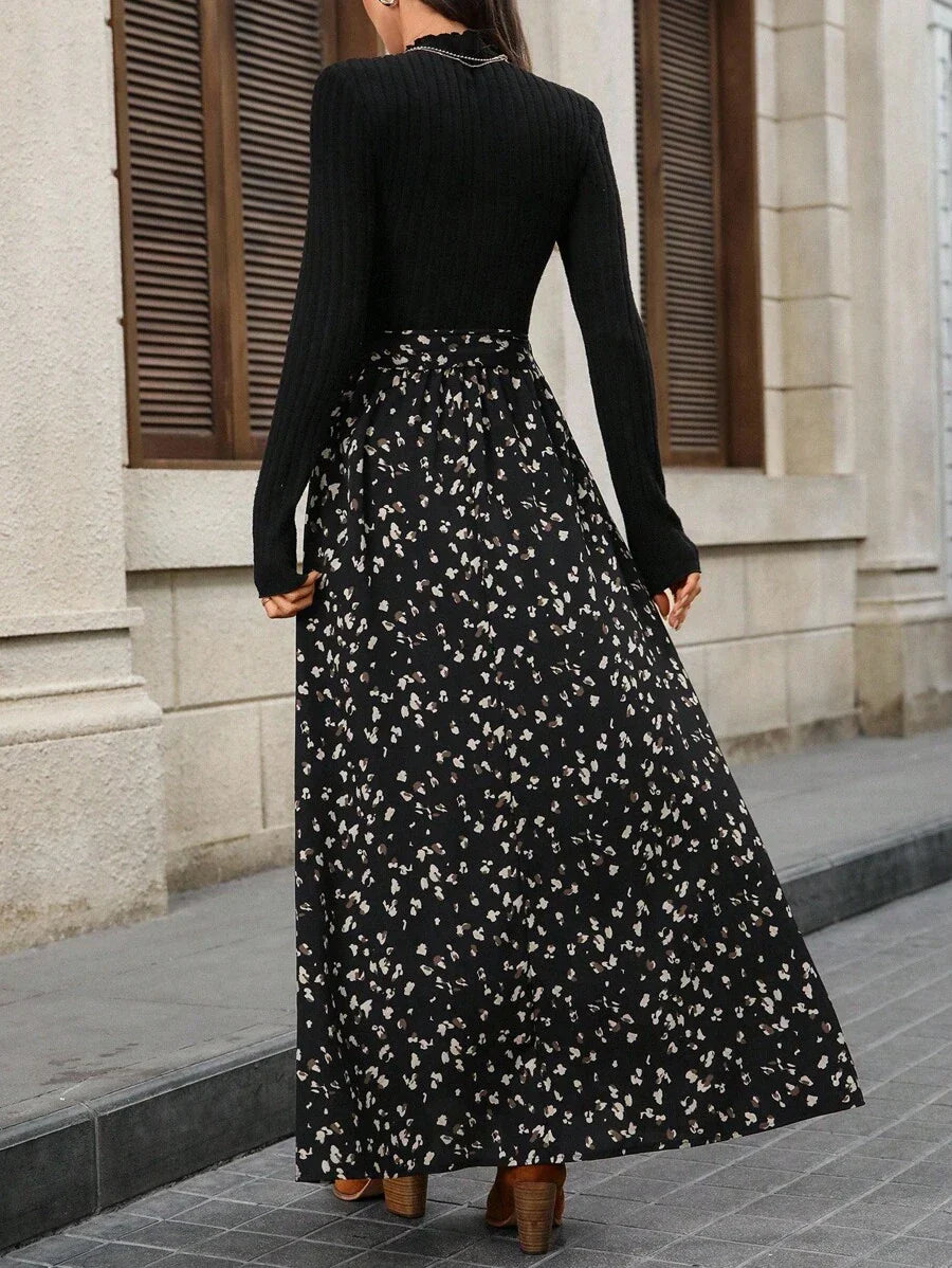 Abito elegante da donna a maniche lunghe con colletto alla coreana e stampa floreale