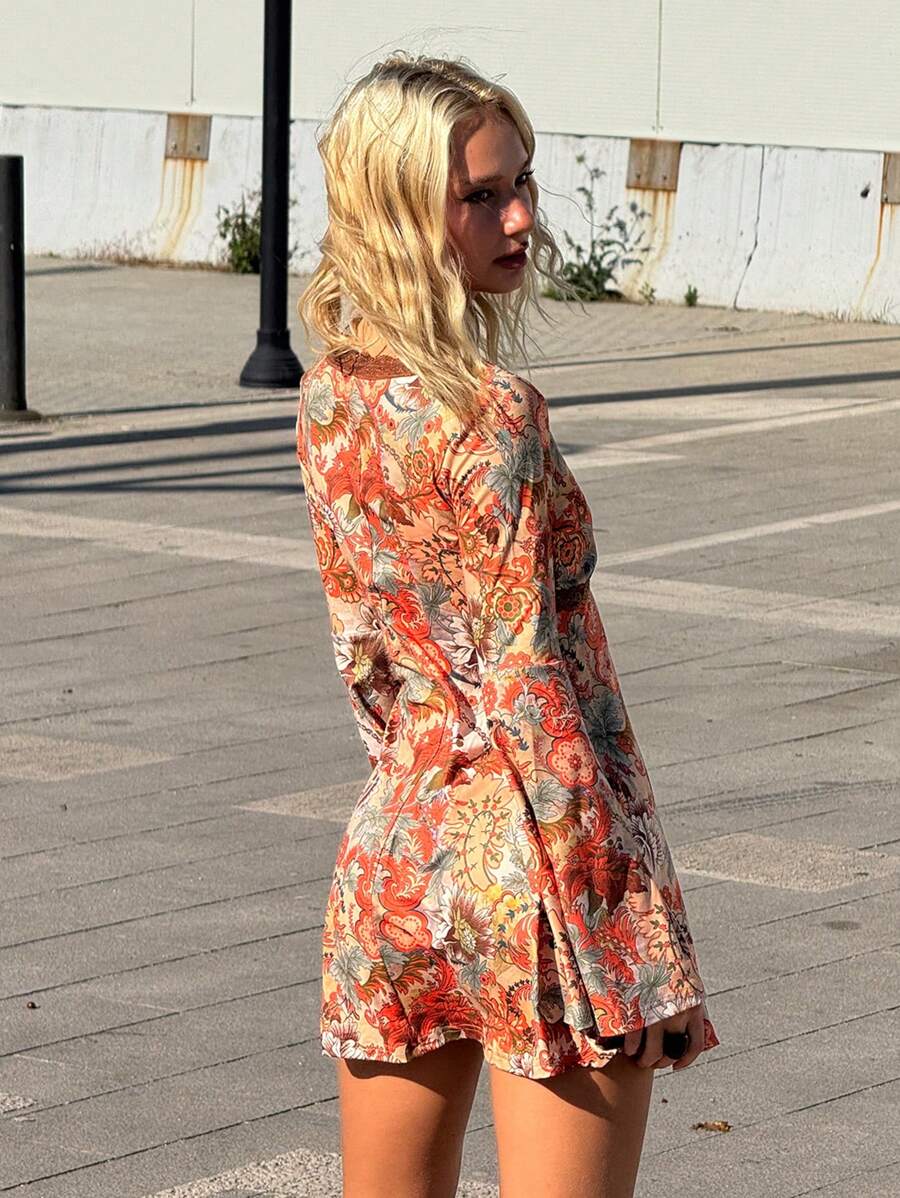 Abito lungo a maniche lunghe con scollo a V, con stampa integrale e inserti in pizzo
