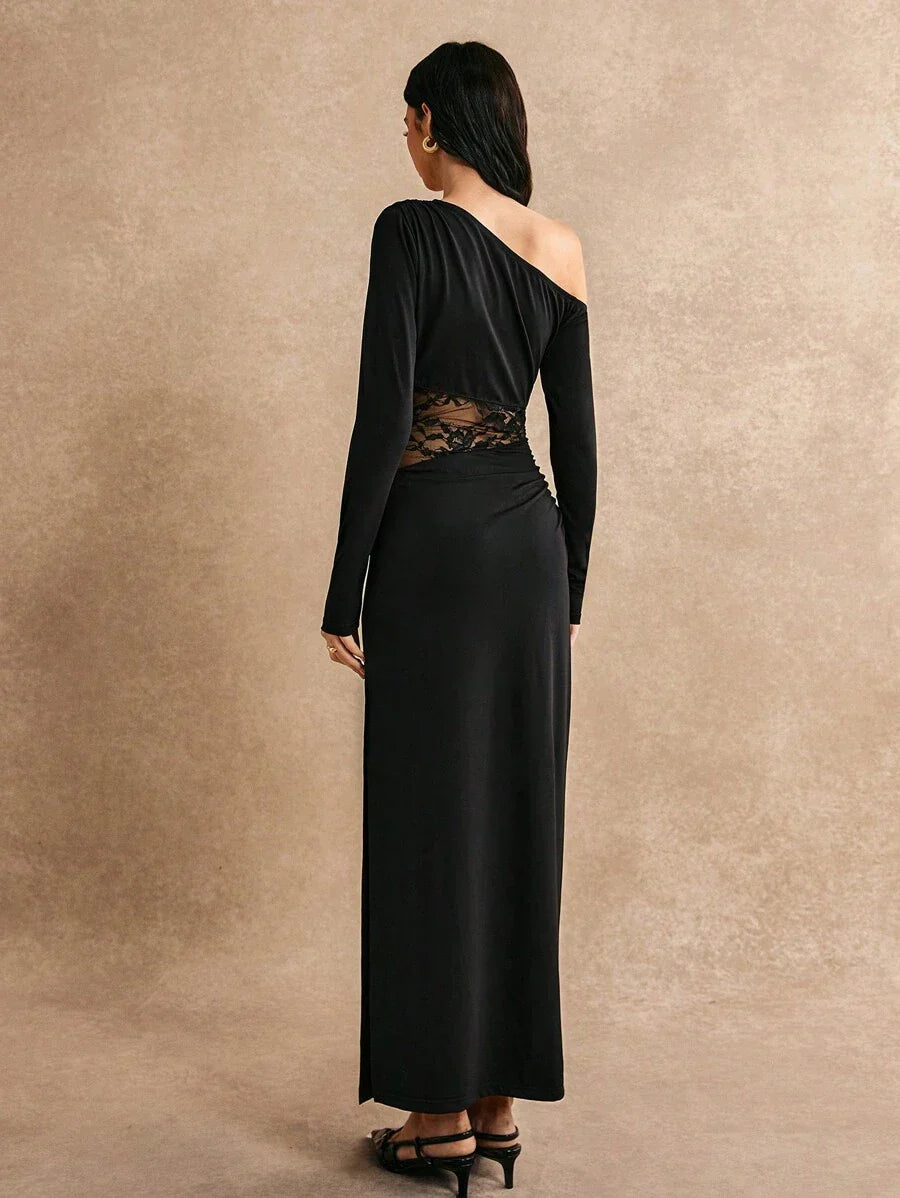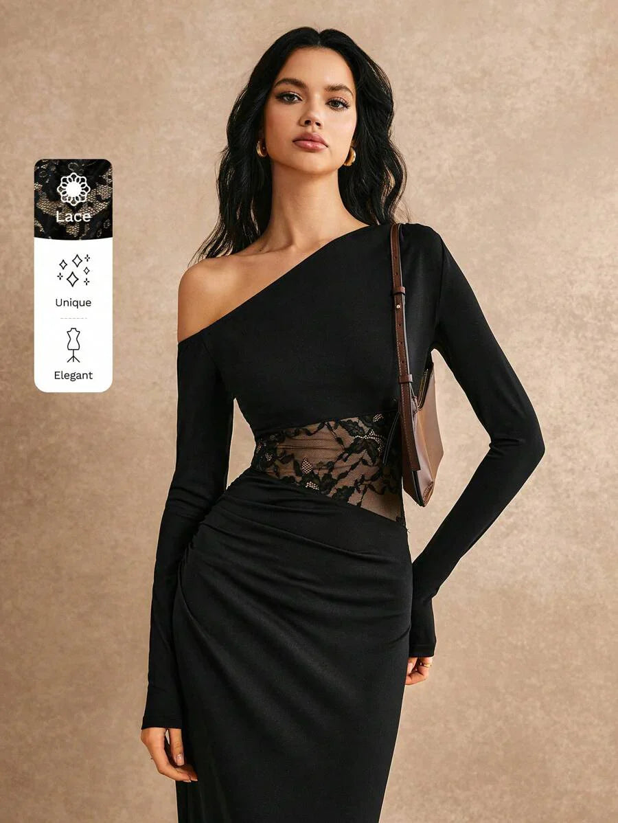 Abito di colore solido con colletto asimmetrico e inserti in pizzo