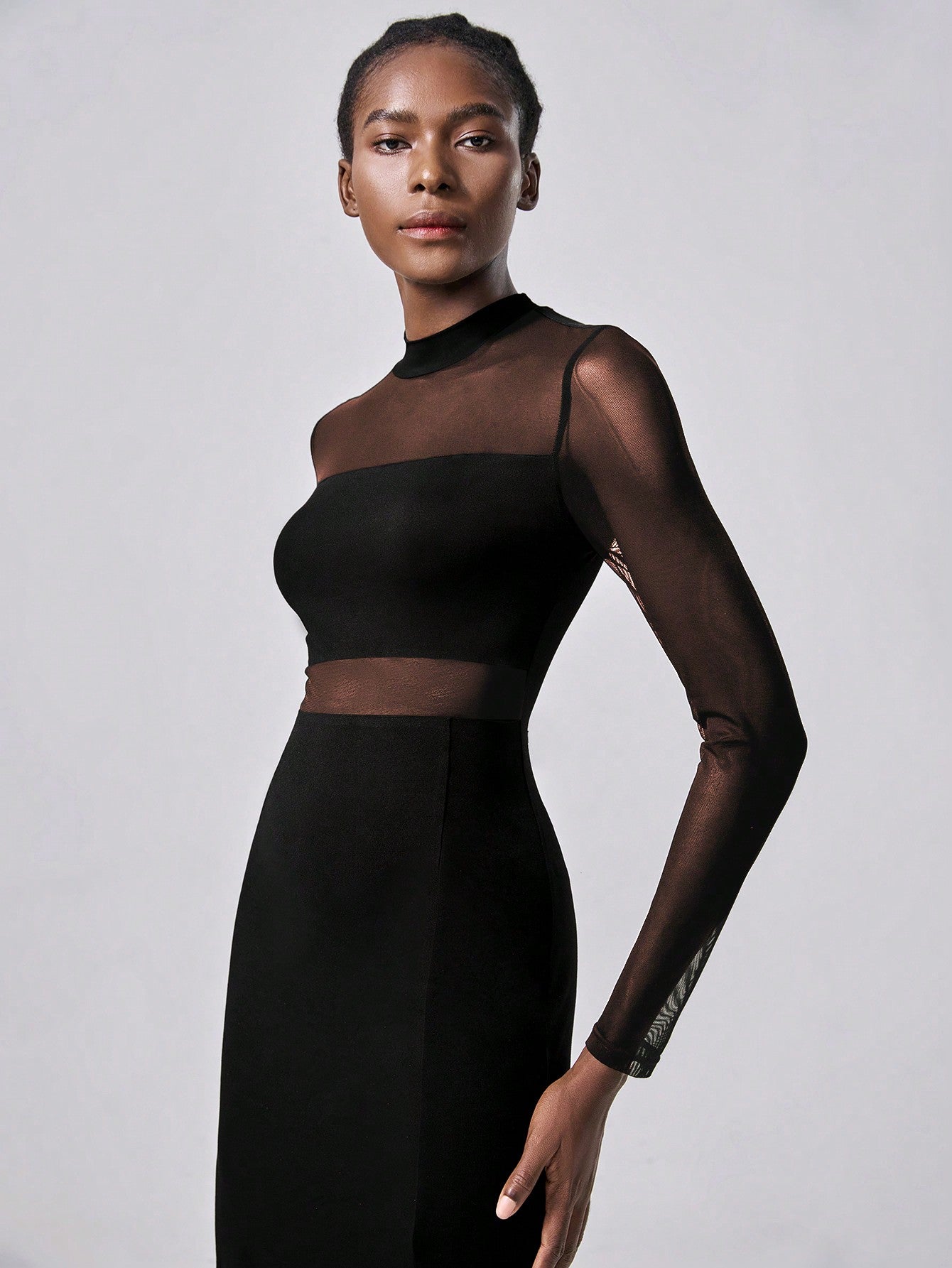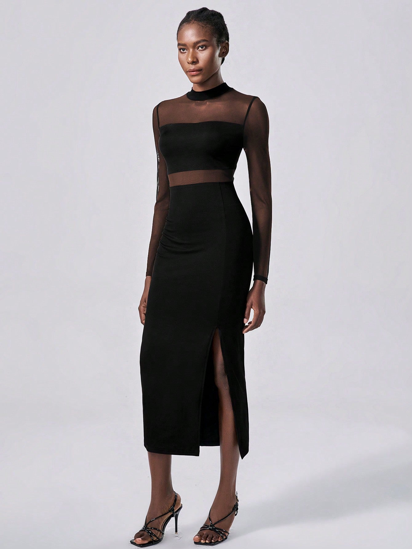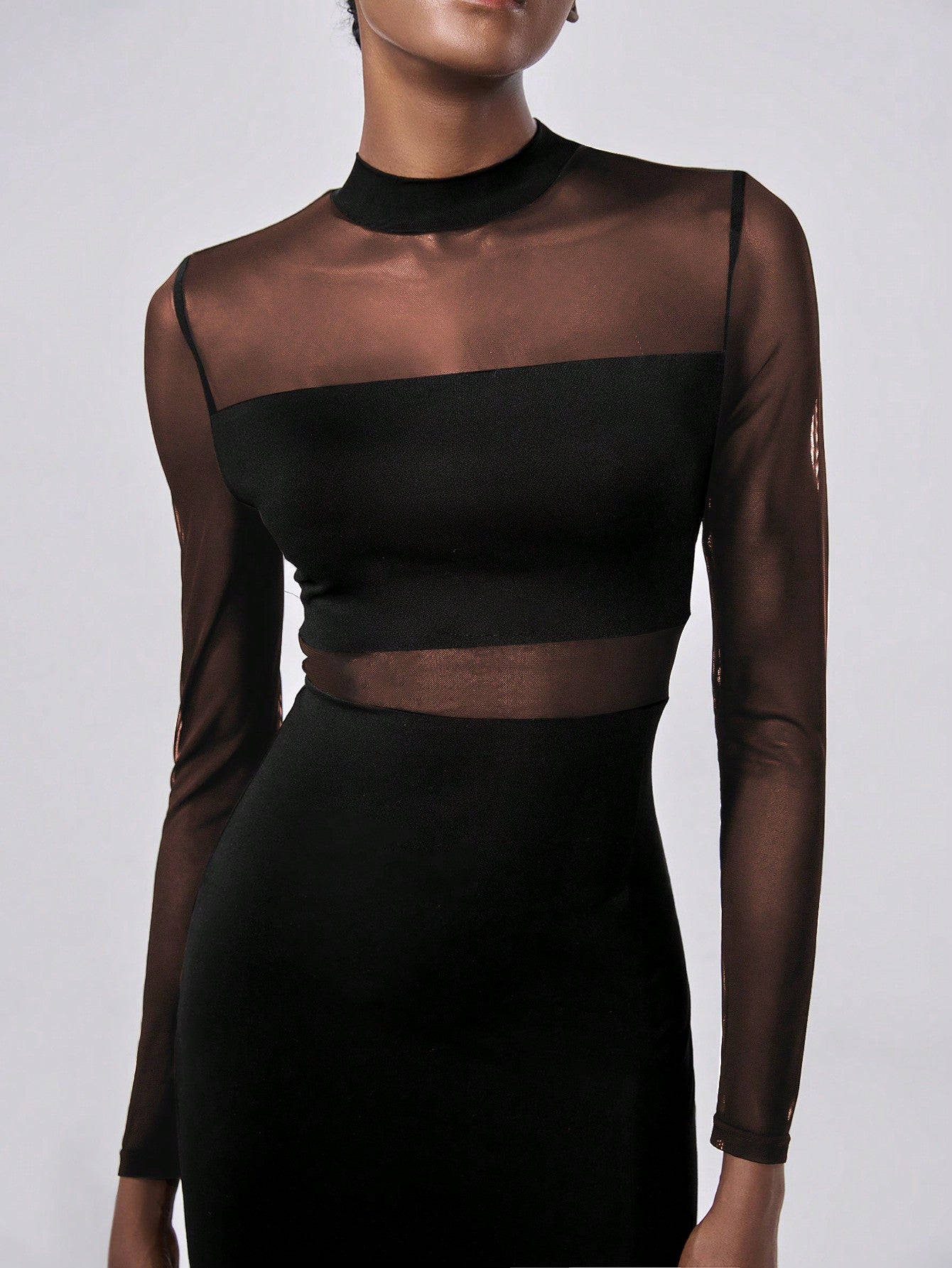 Abito elegante in in rete trasparente, abito nero in maglia semi-trasparente per donna, maxi outfit da donna