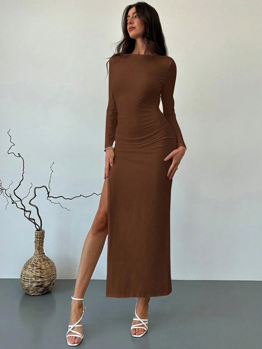 Abito lungo attillato da donna con spacco alto, manica lunga e senza schienale, con decorazioni metalliche