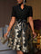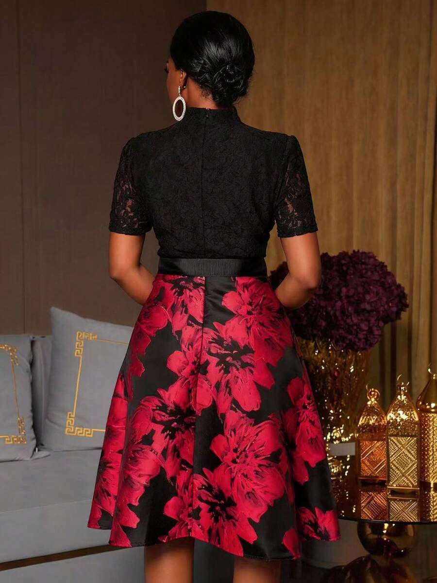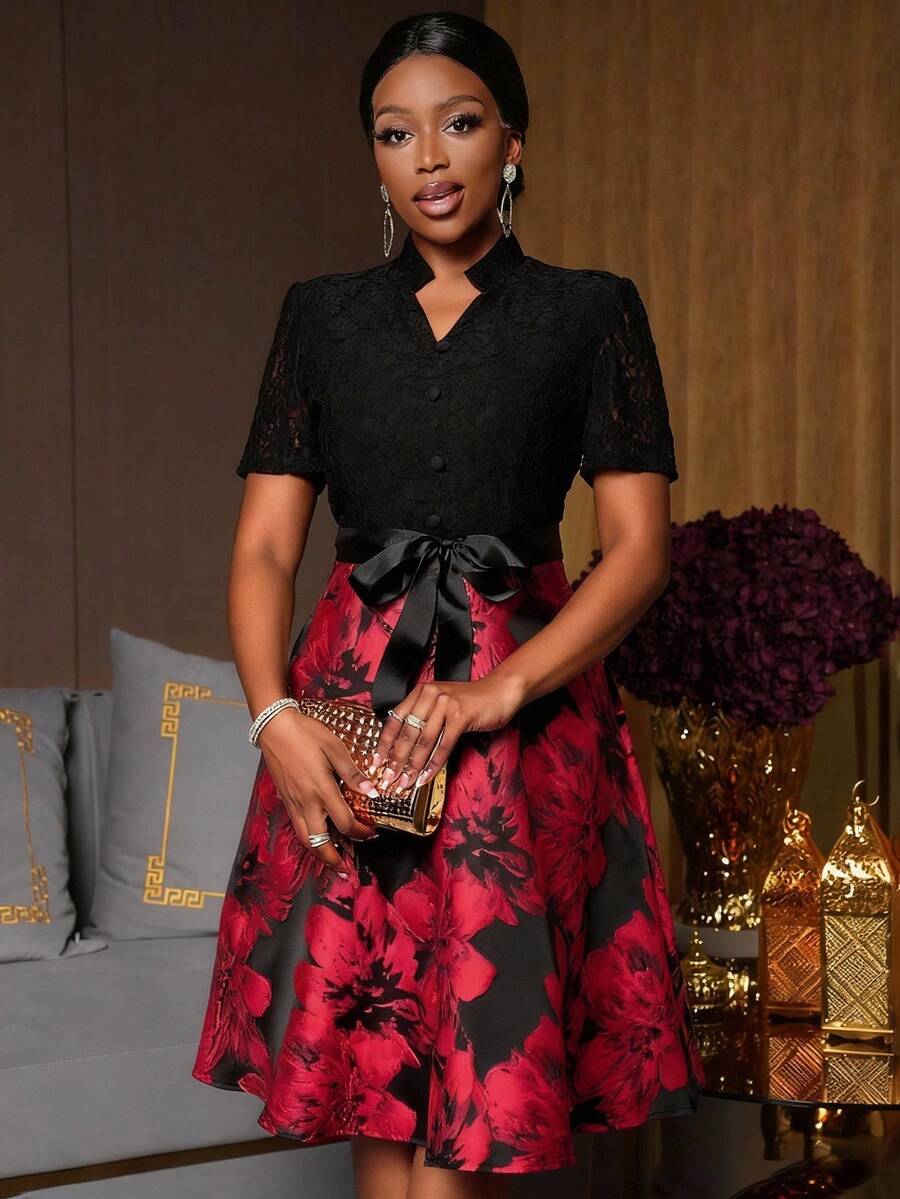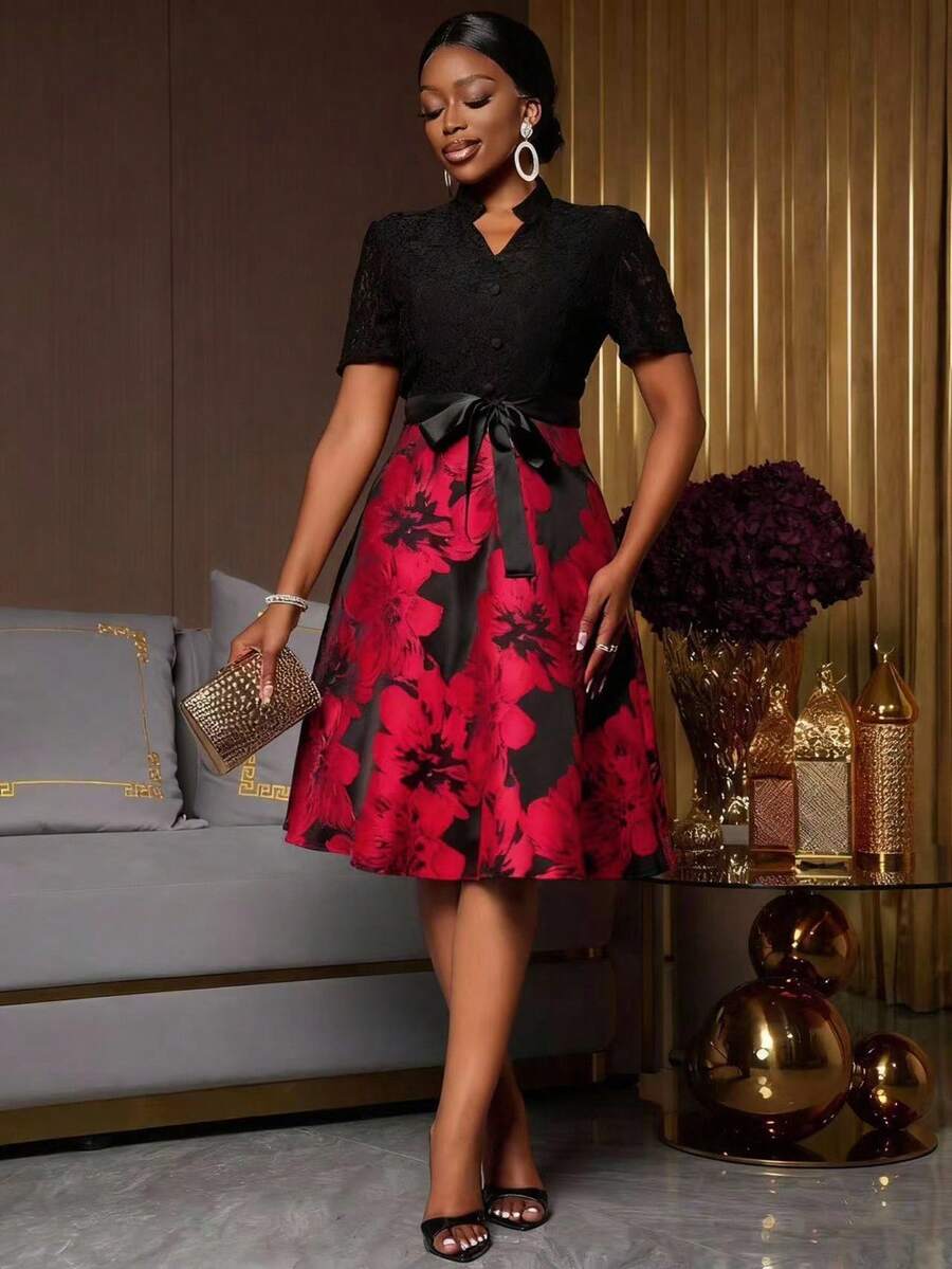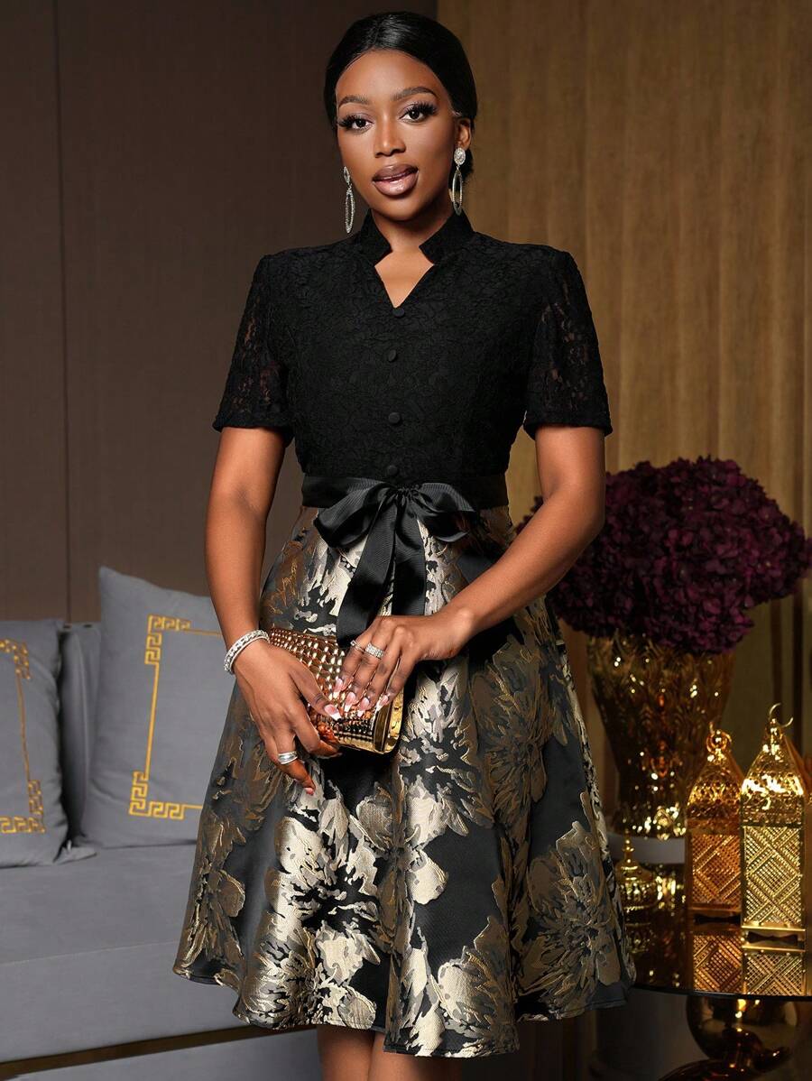Abito midi elegante da donna con scollo a V, cintura e motivo a incastro in pizzo jacquard