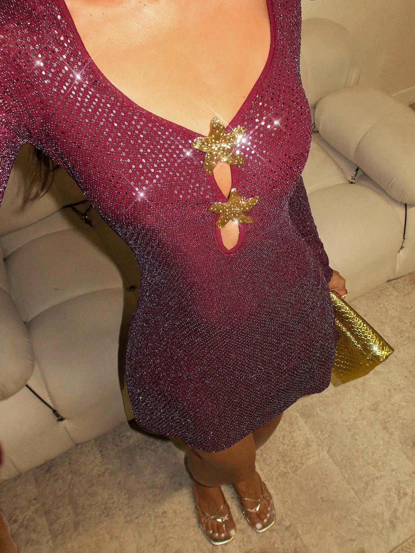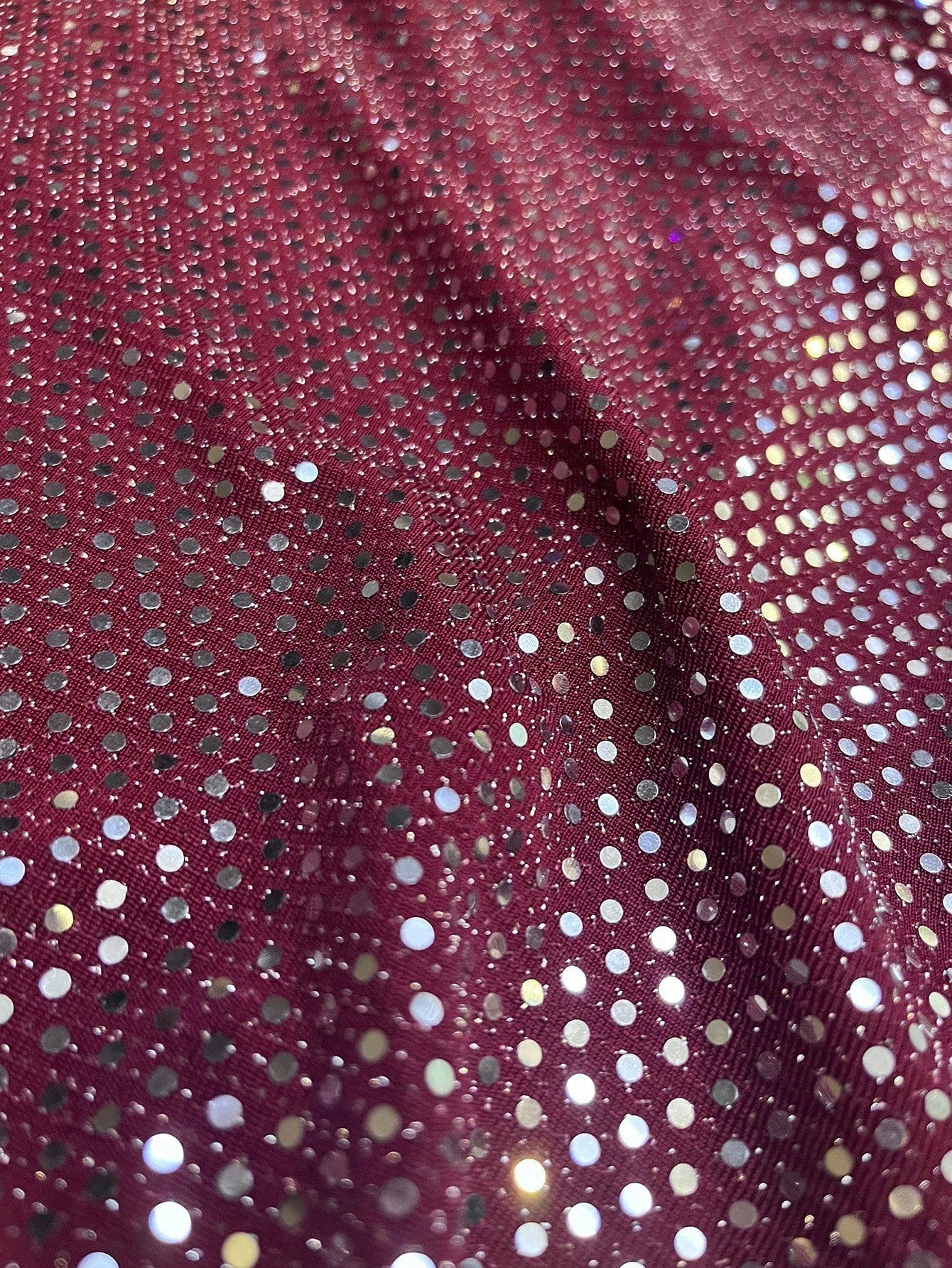Elegante abito da donna in maglia con paillettes rosso vino, girocollo