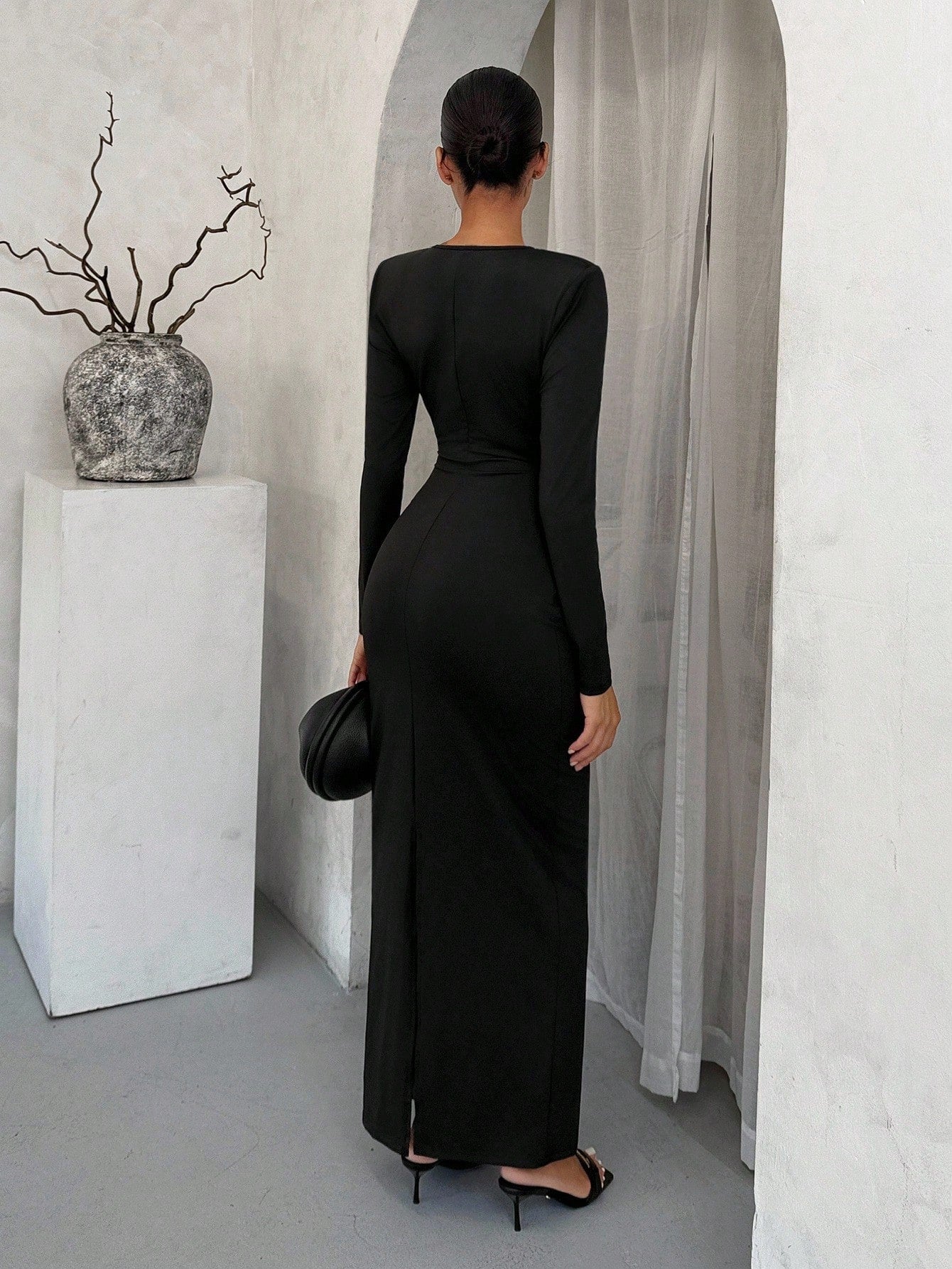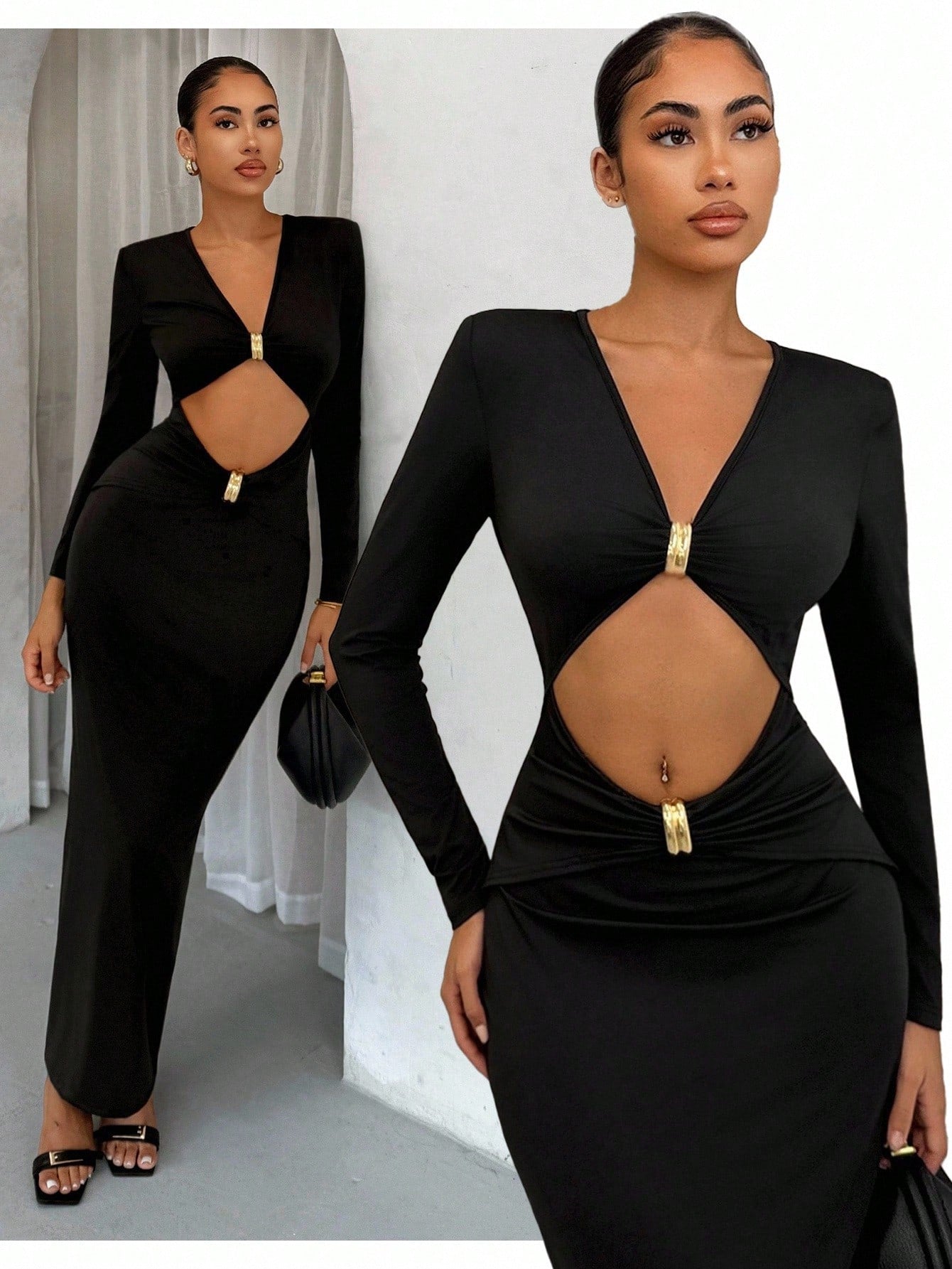 Elegante e sexy abito nero con decorazioni in metallo traforato