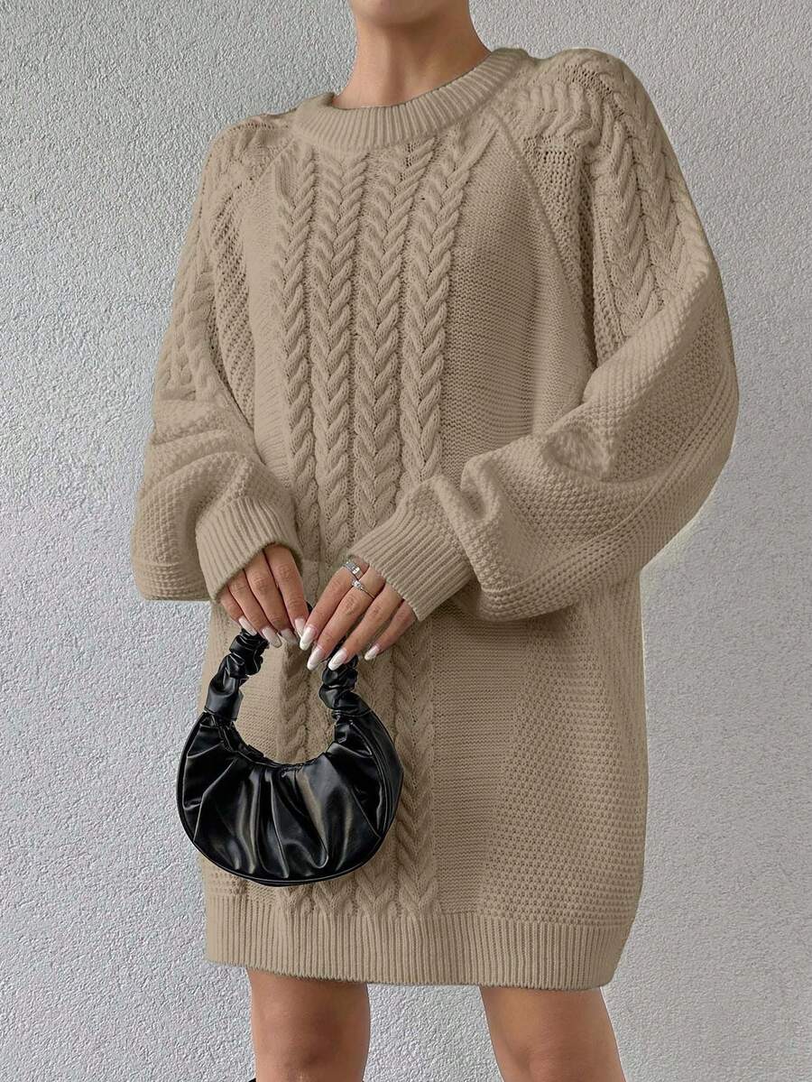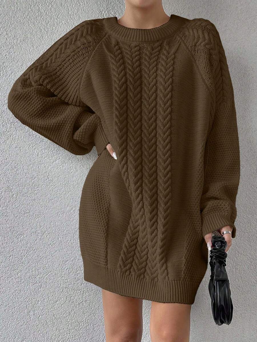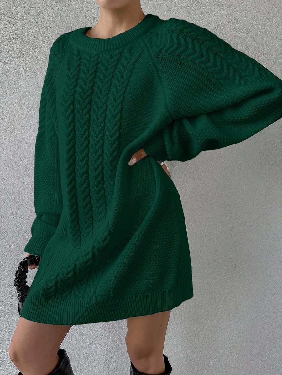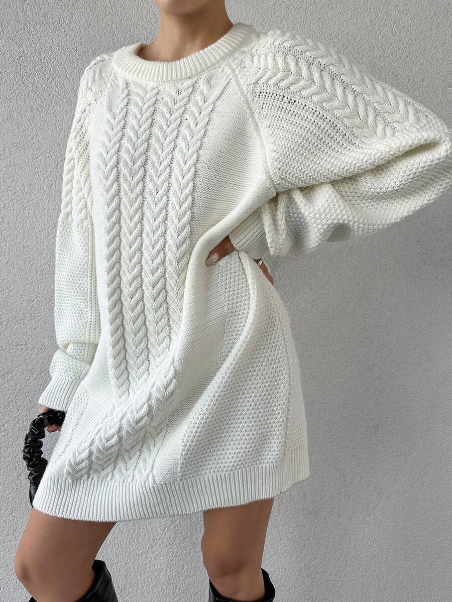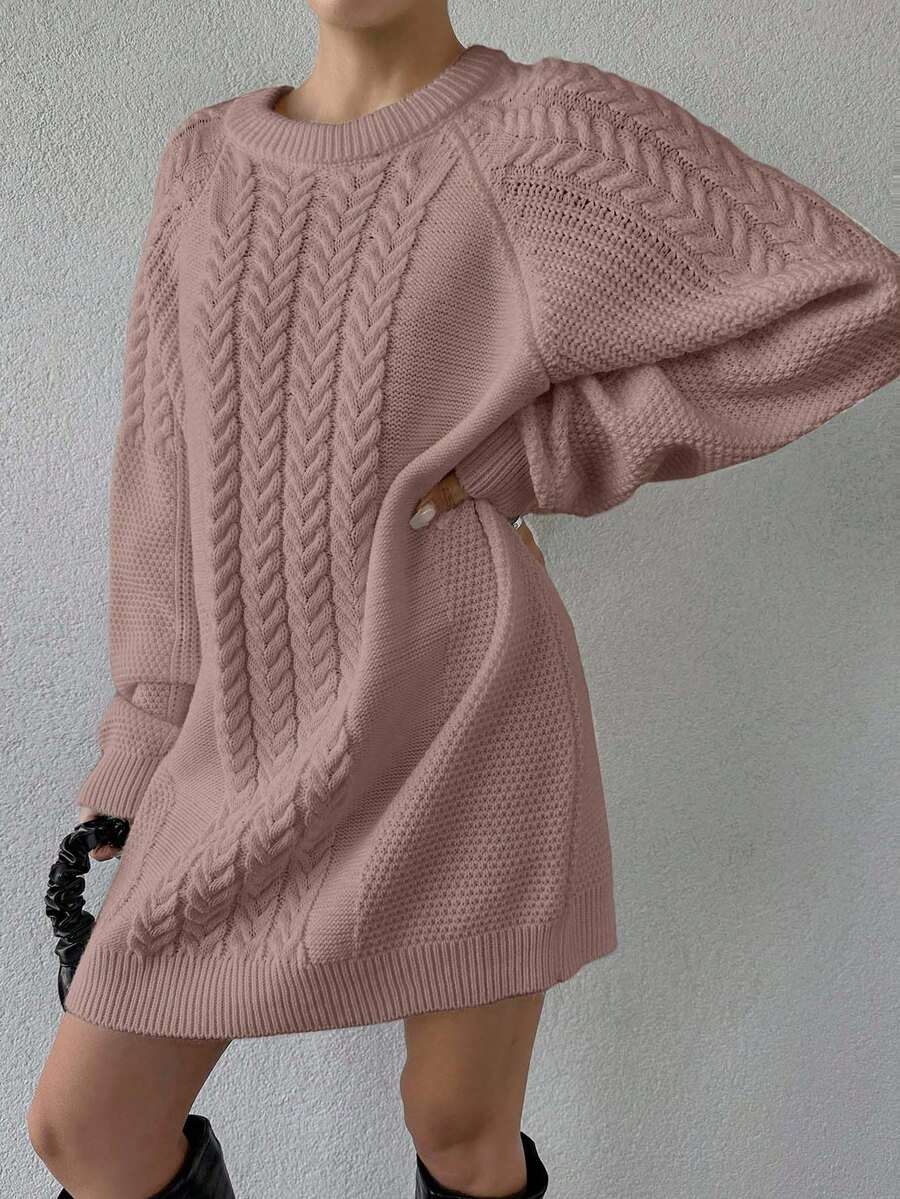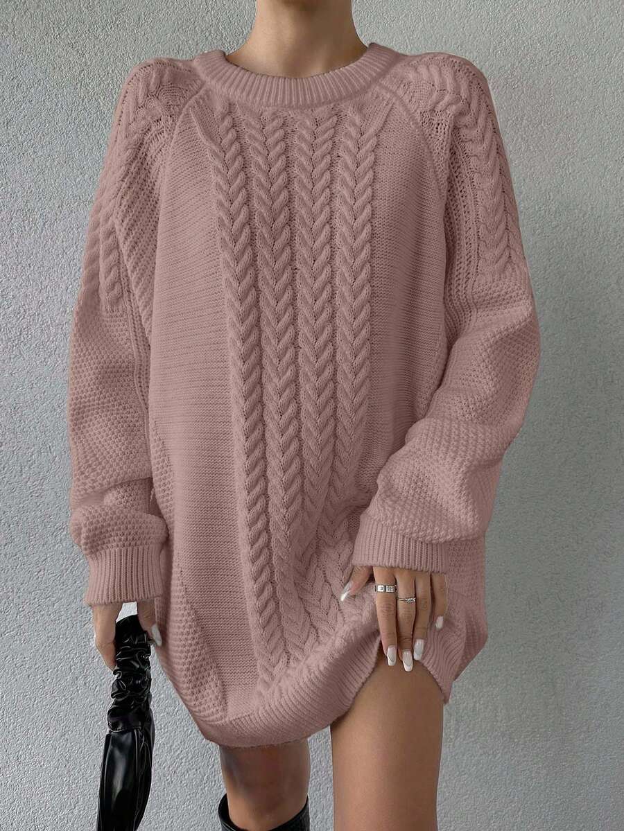 Abito casual e ampio in maglia con motivo a trecce, collo tondo, maniche raglan, maniche lunghe