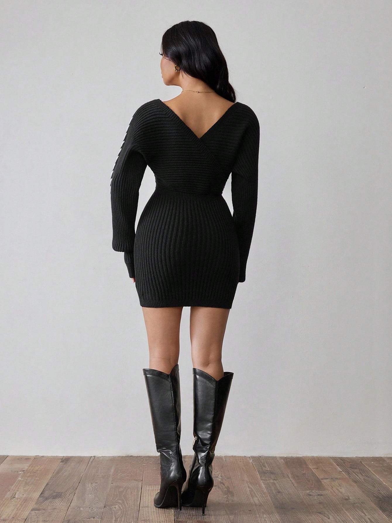Abito elegante in maglia a maniche a pipistrello con scollo a V incrociato aderente da donna