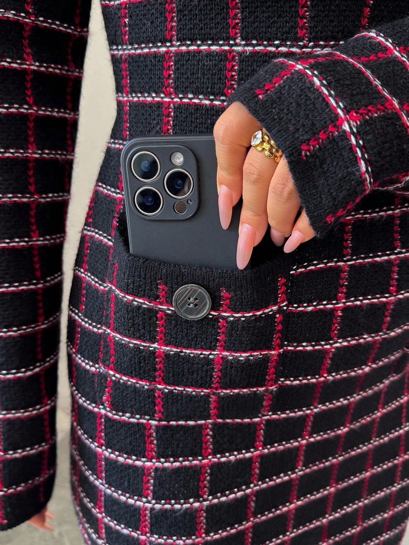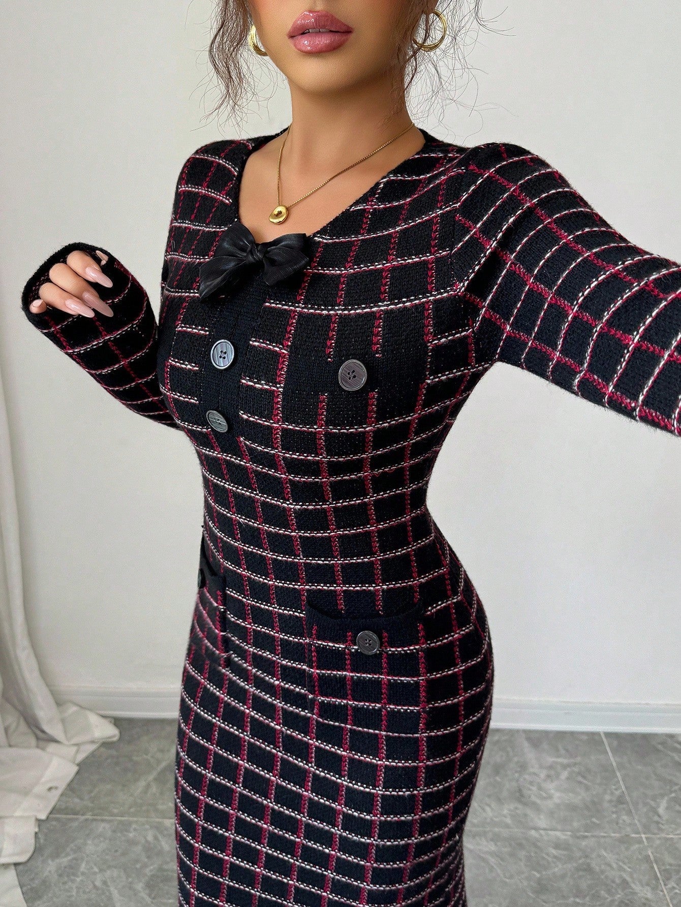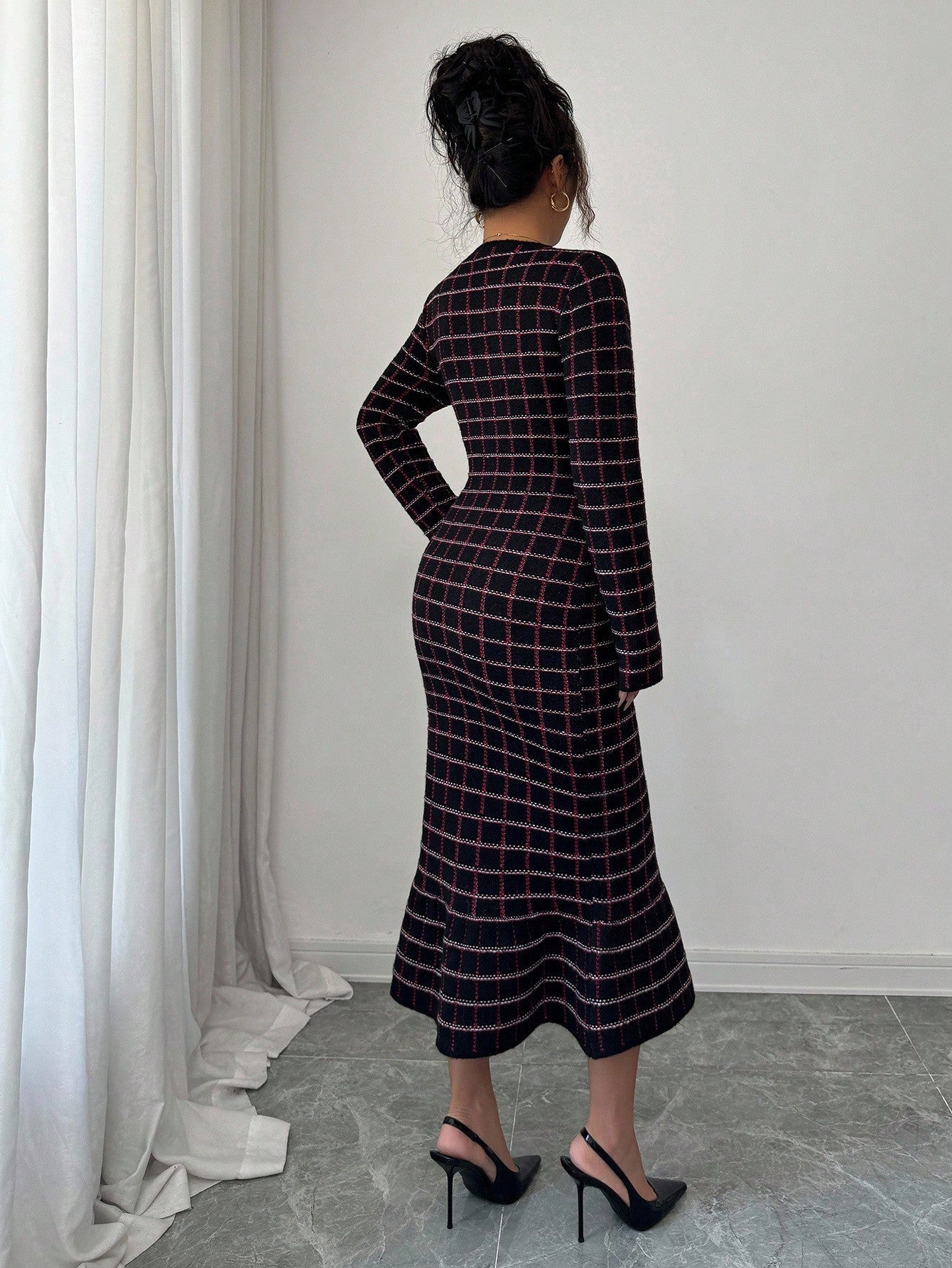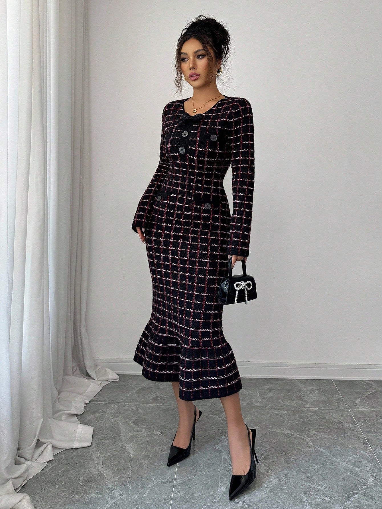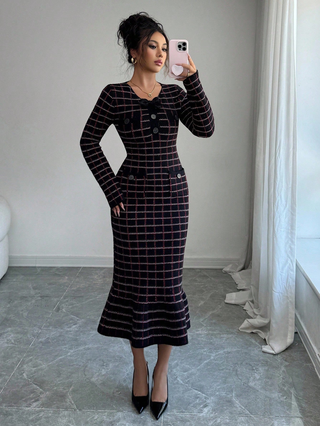 Abito maglione da donna con fiocco in vita e orlo a coda di pesce, stile quadri