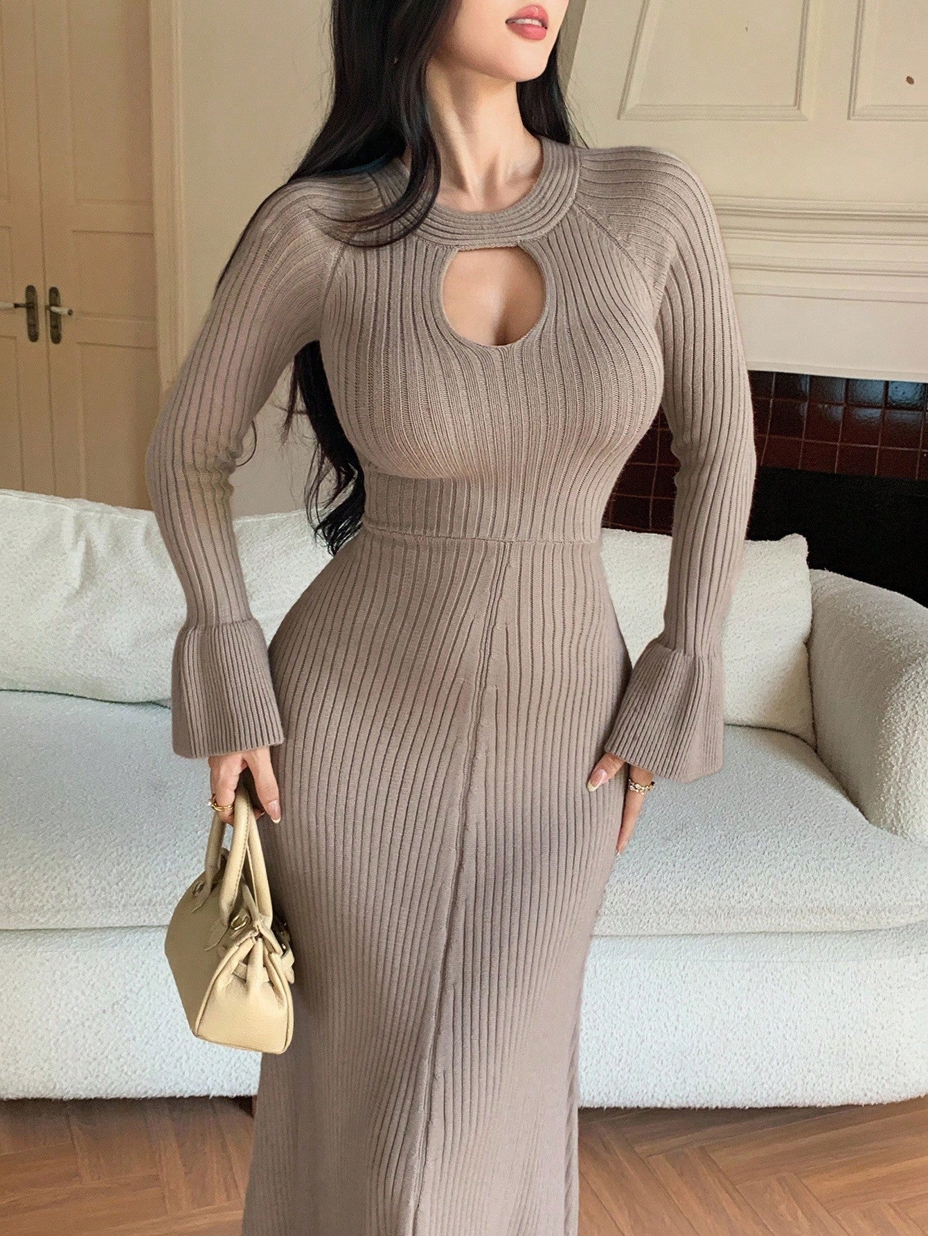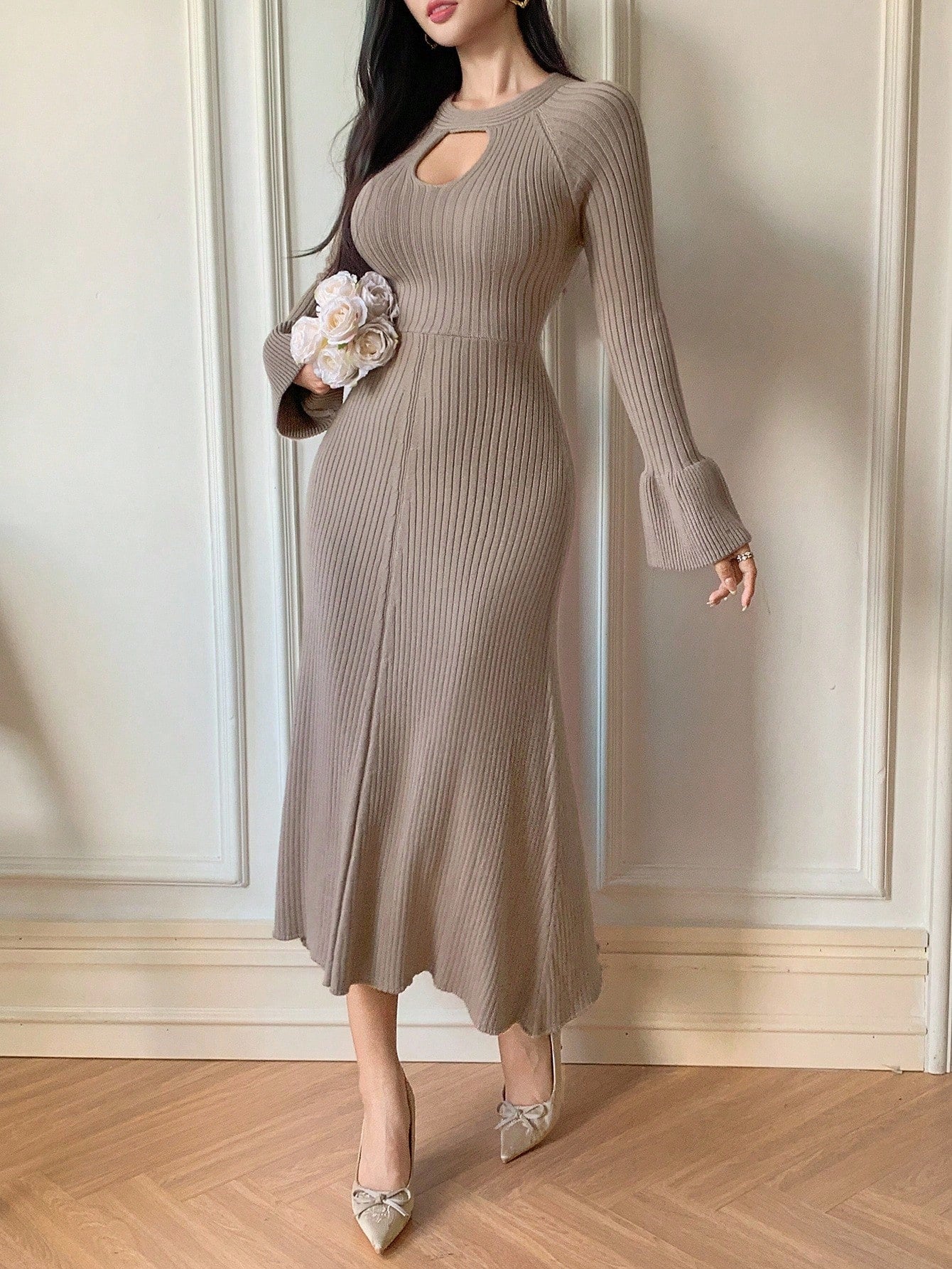 Abito maglione donna elegante a maniche a sbuffo, tinta unita, autunnale