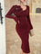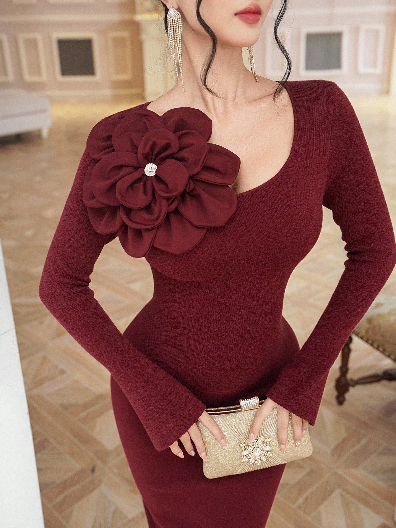 Abito maglione donna elegante a maniche a tromba con fiori 3D, colore unito, autunnale