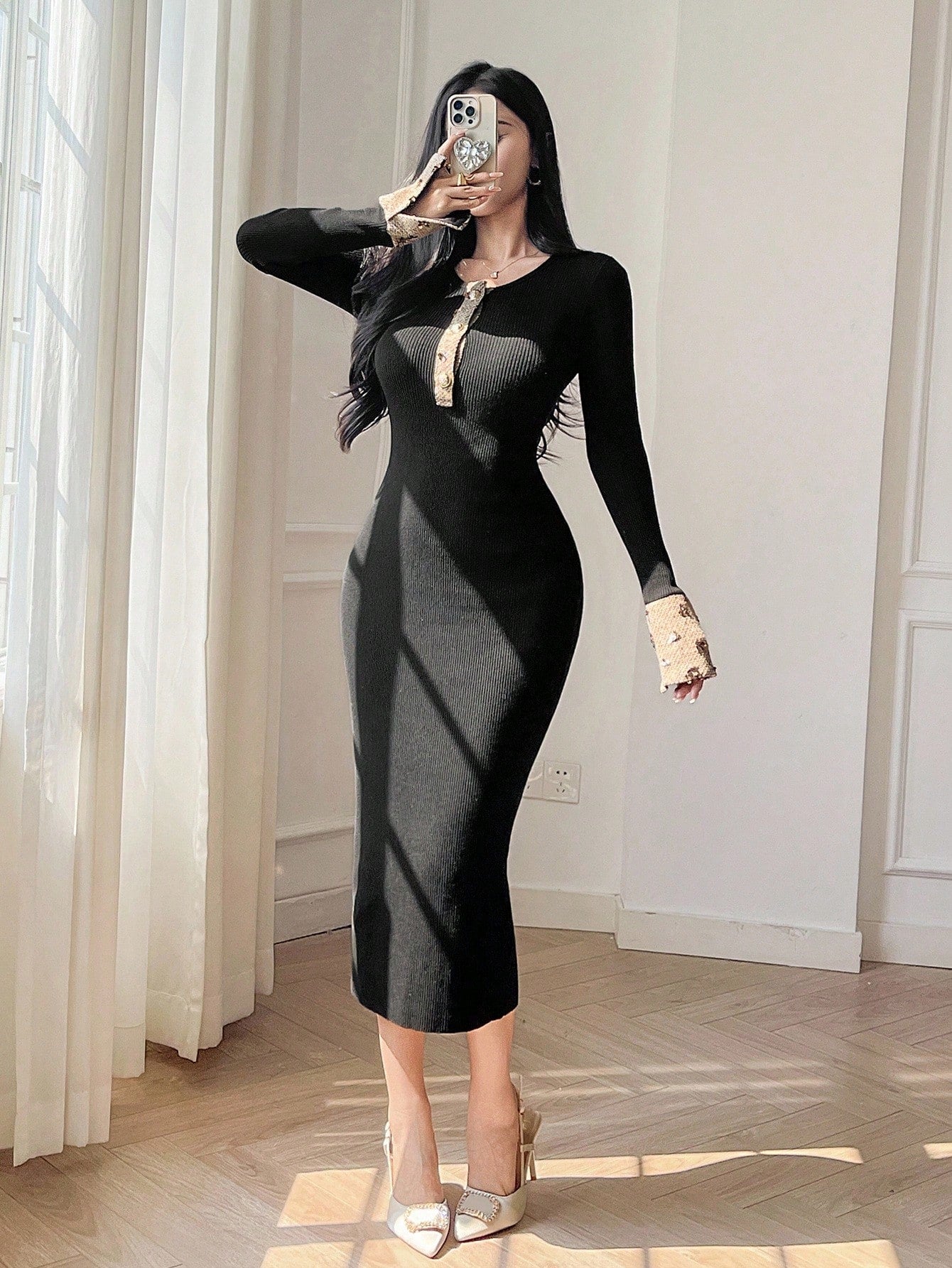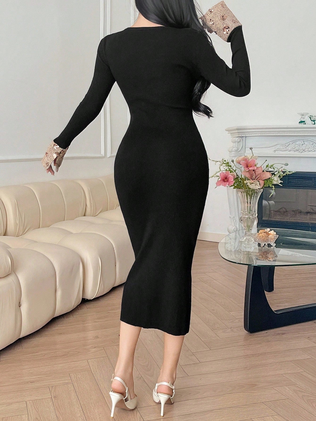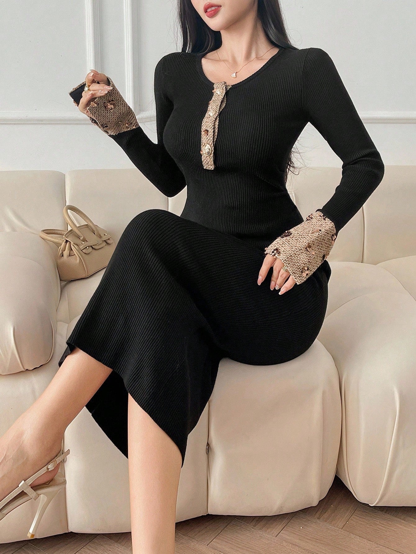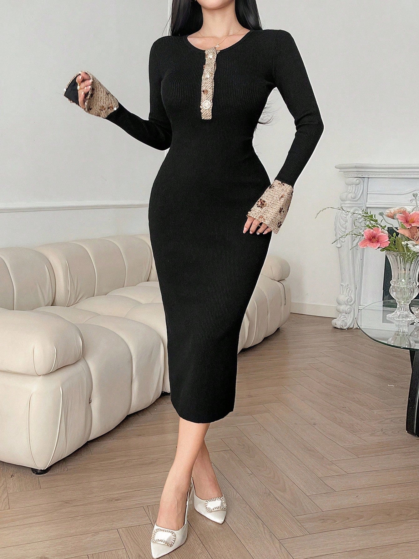 Abito maglione lavorato a maglia a maniche lunghe aderente con scollo