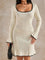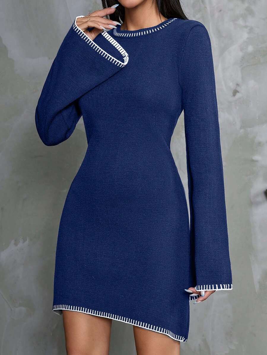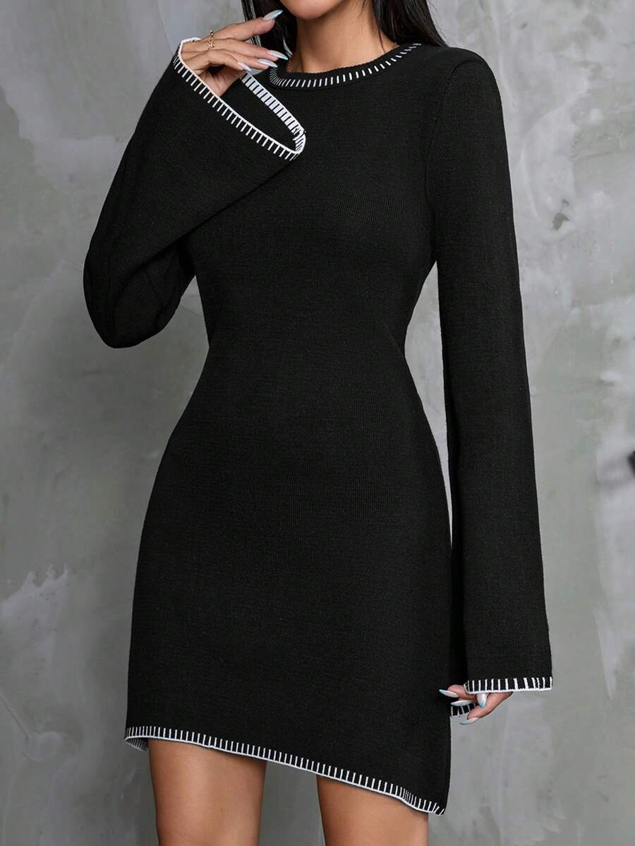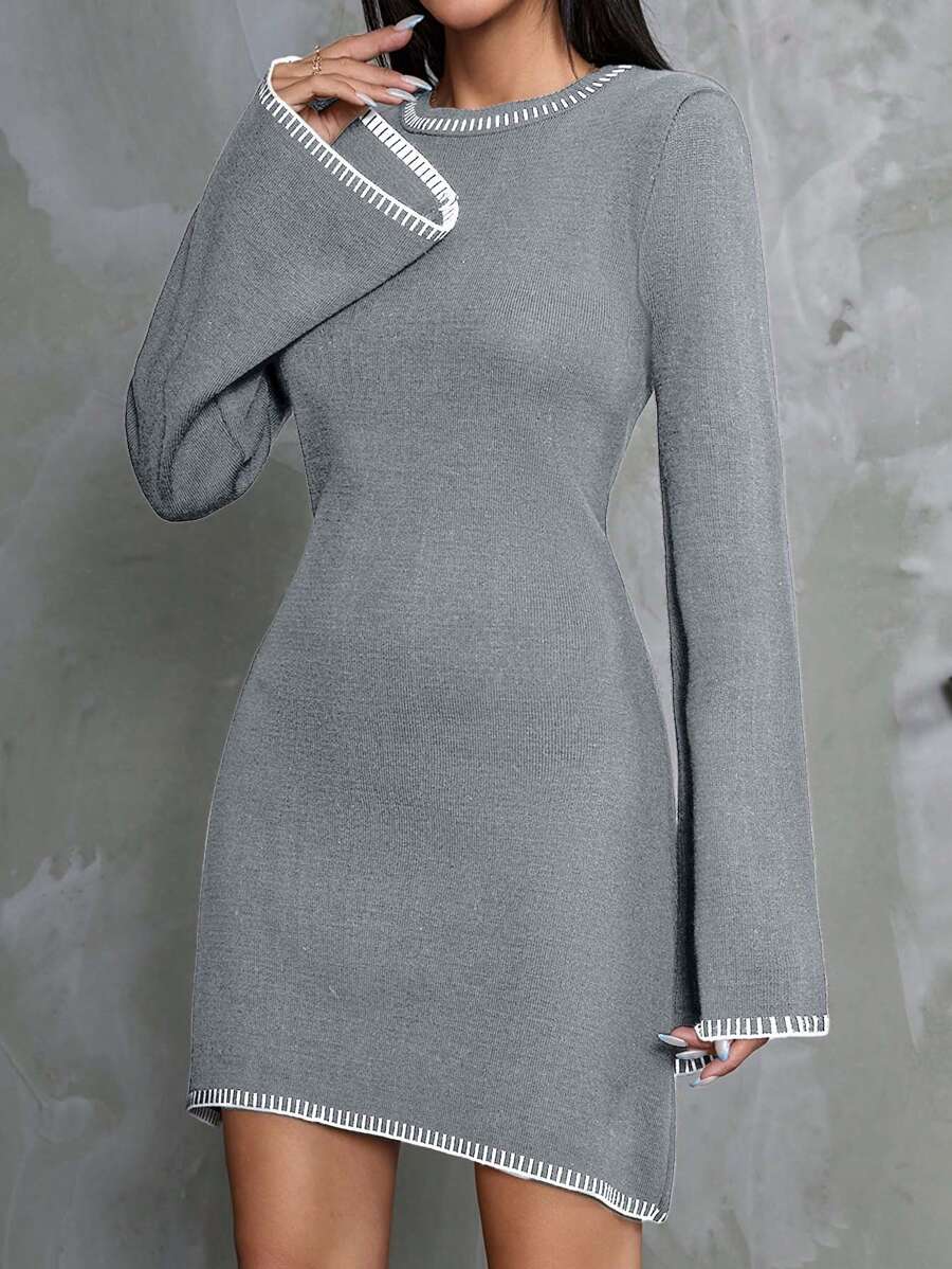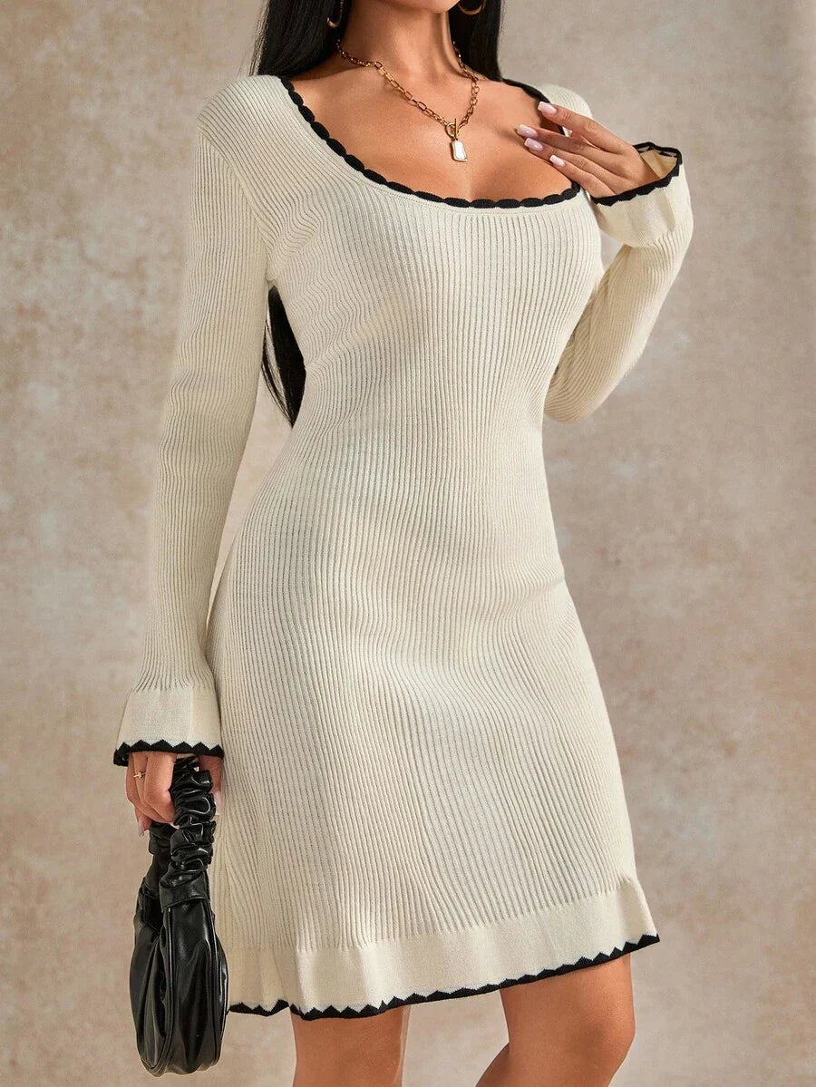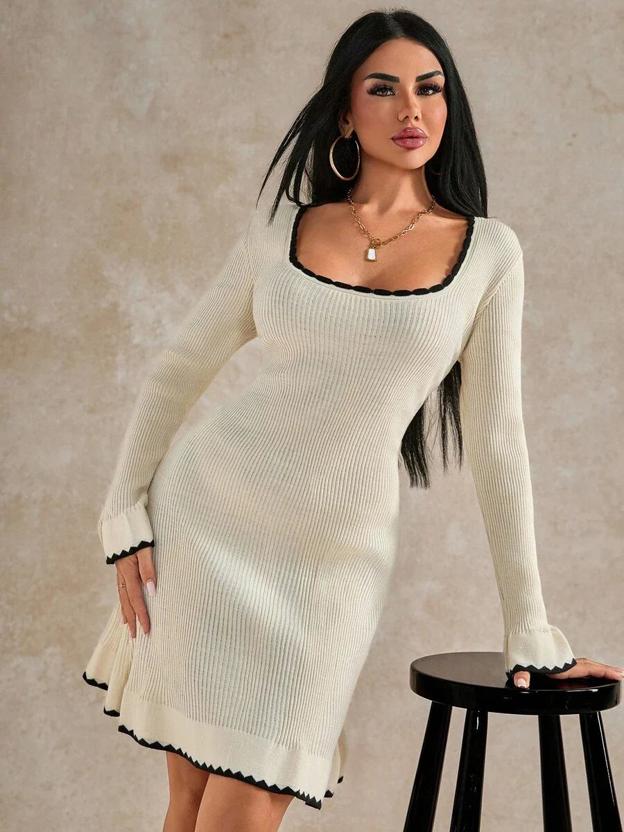 Abito mini in maglia a costine con scollo quadrato e dettagli a punto, tinta unita