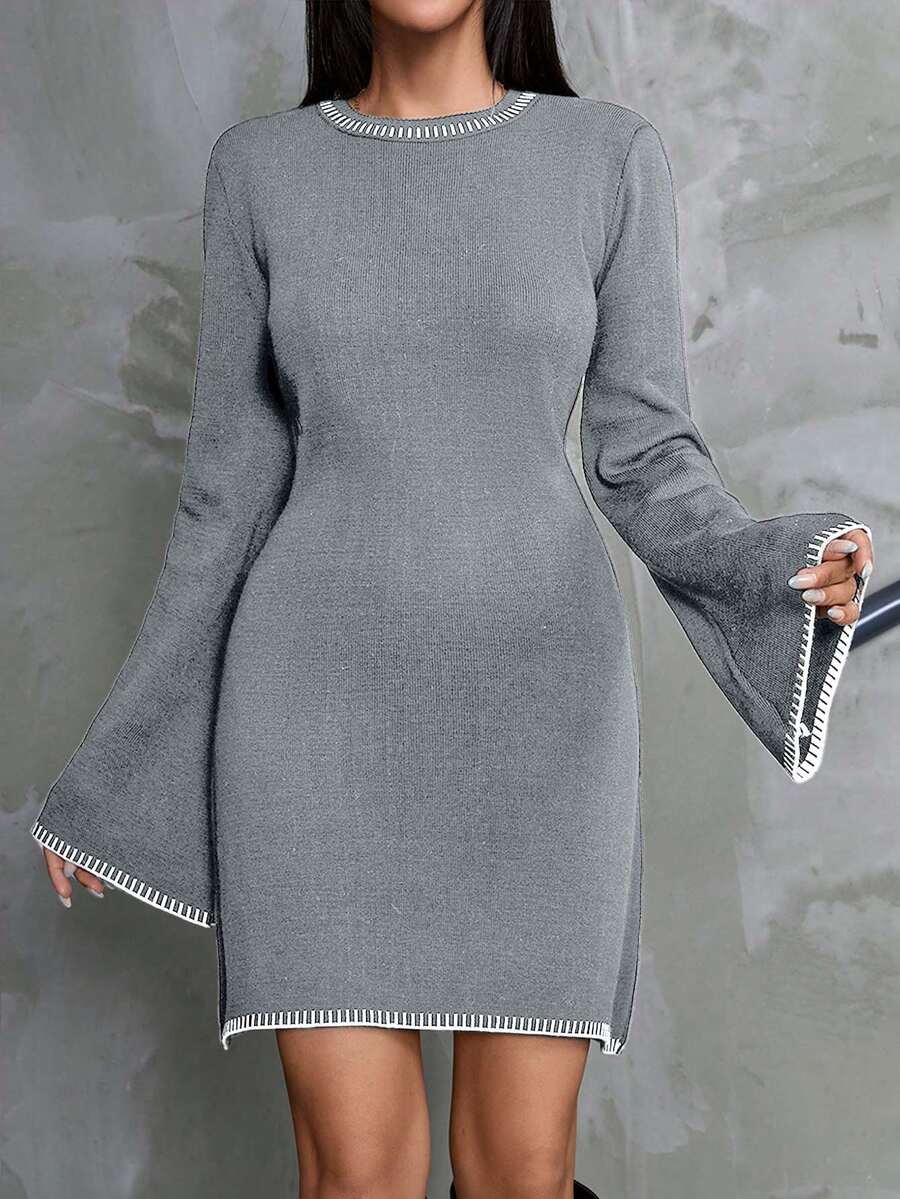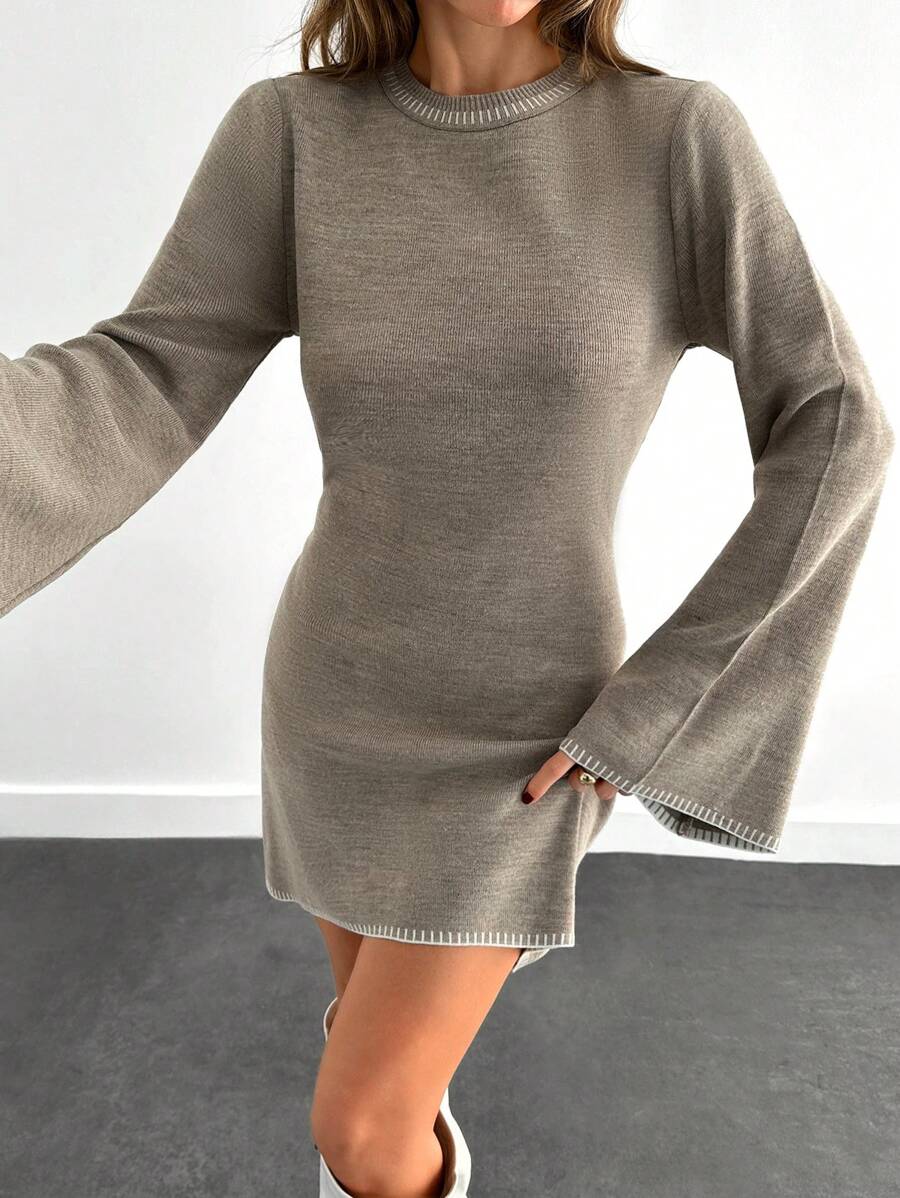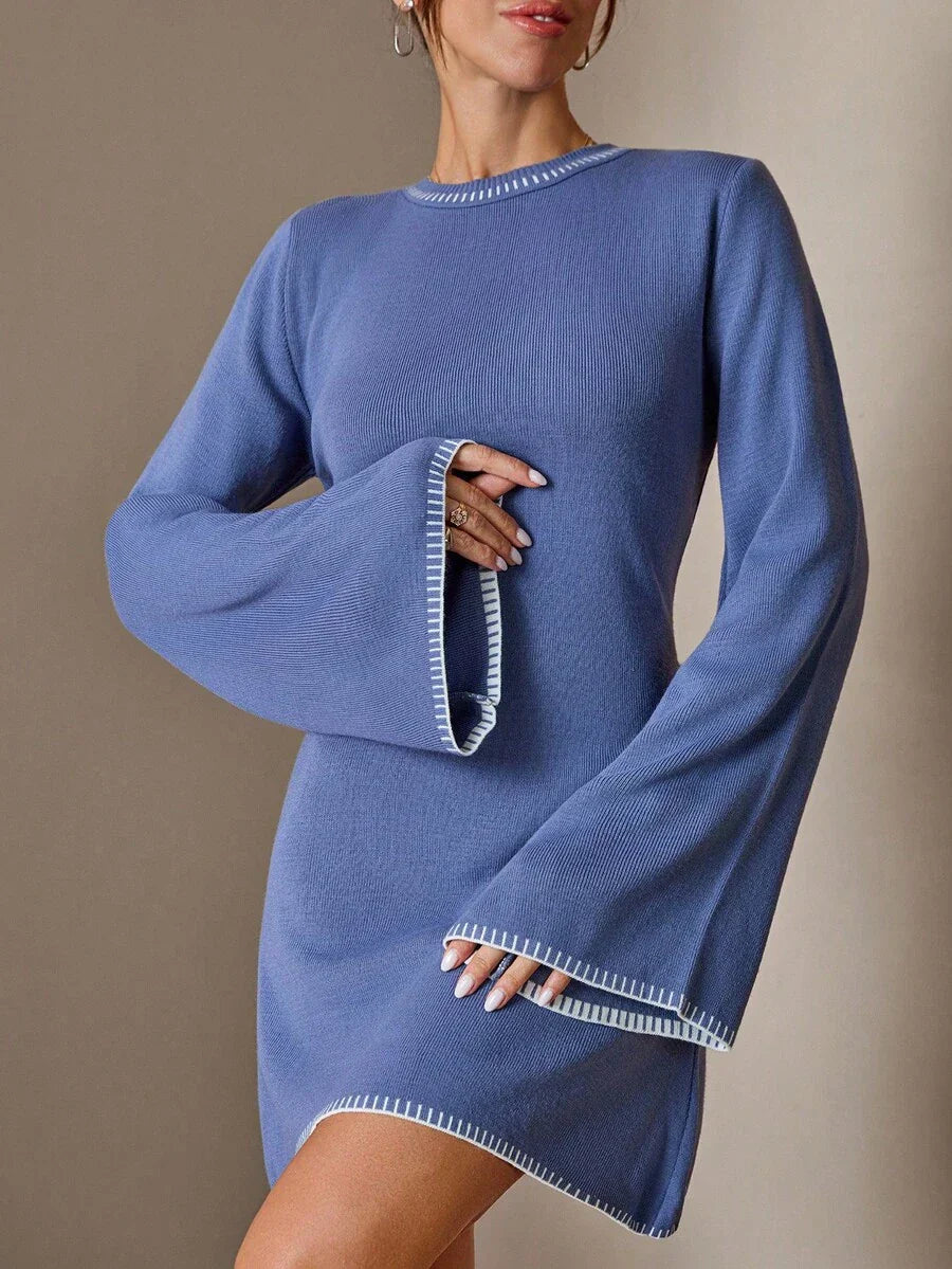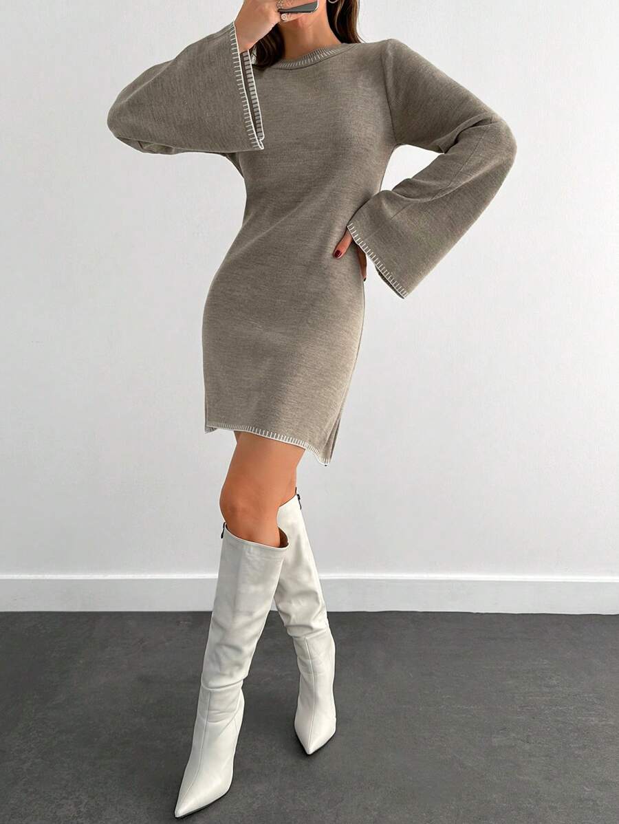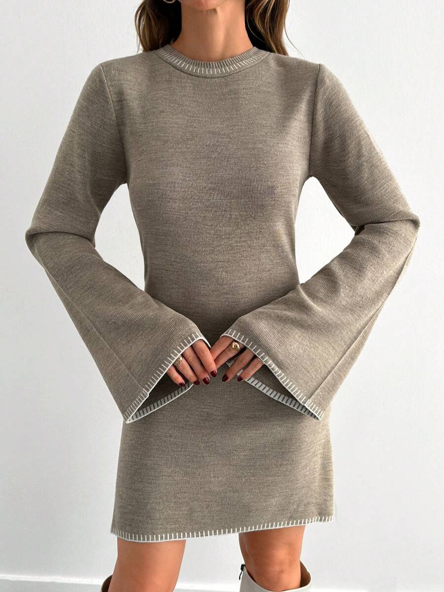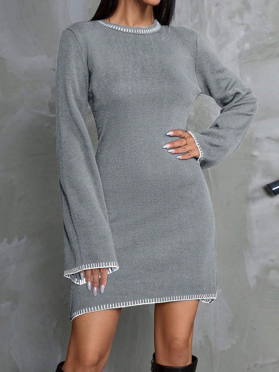 Abito mini in maglia a costine con scollo quadrato e dettagli a punto, tinta unita