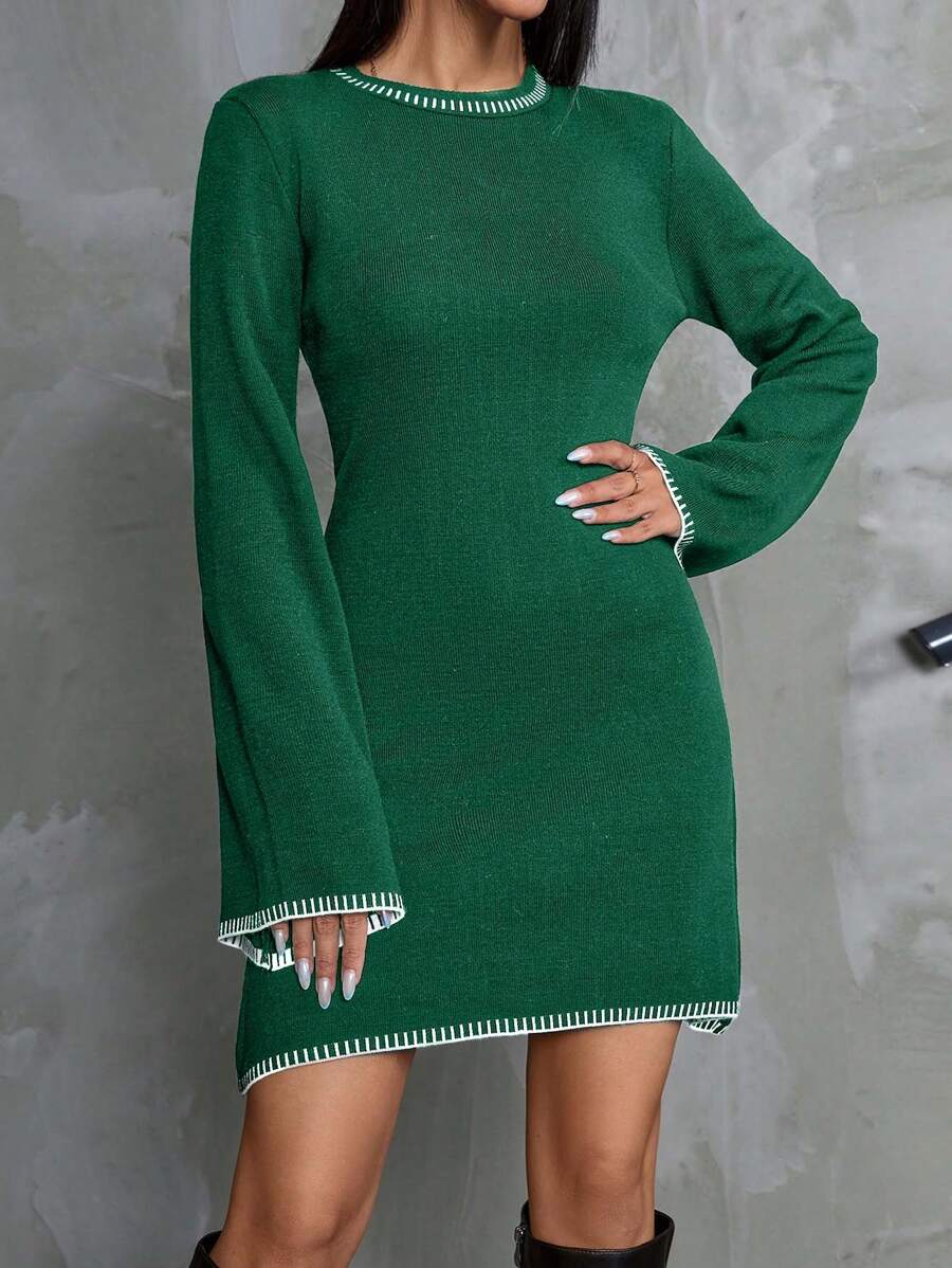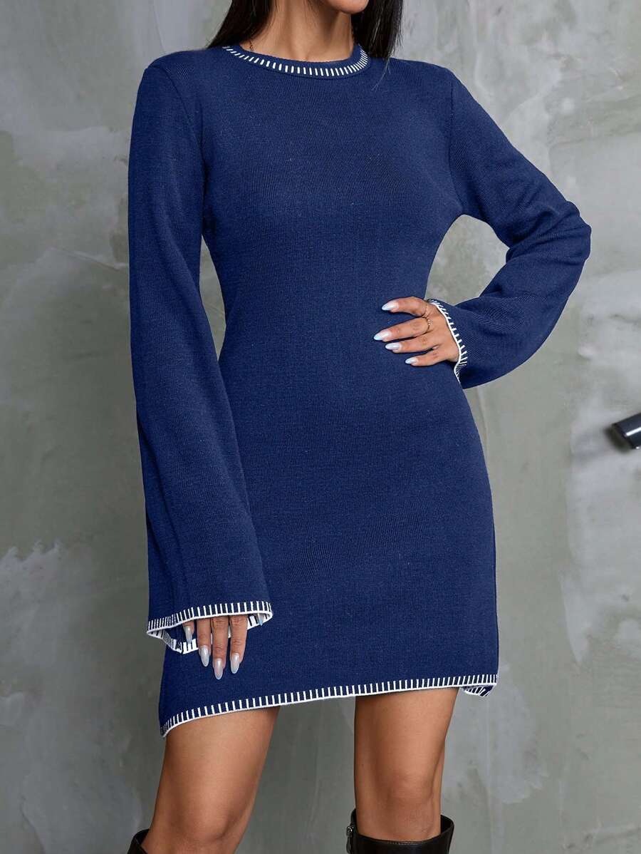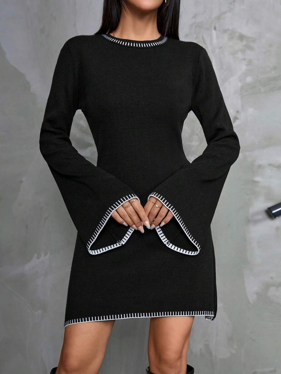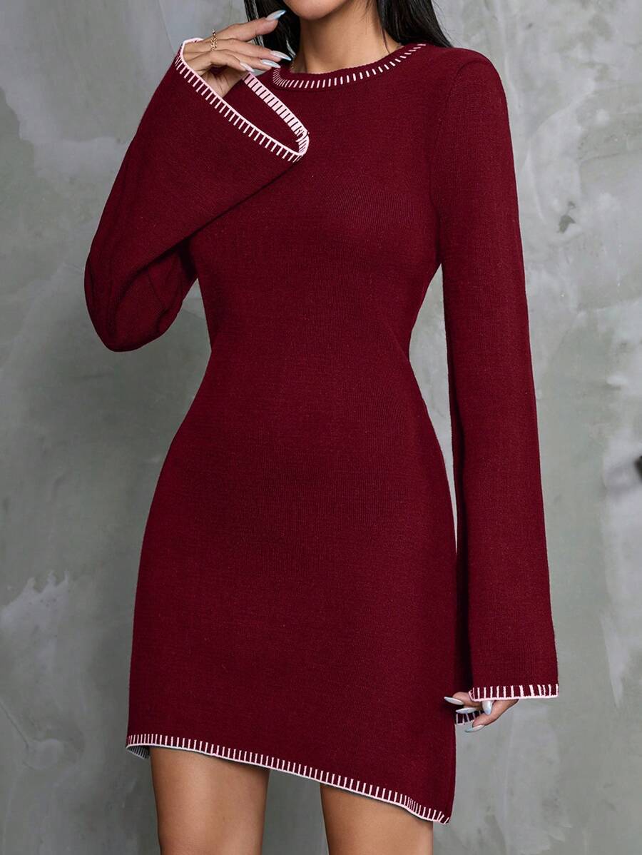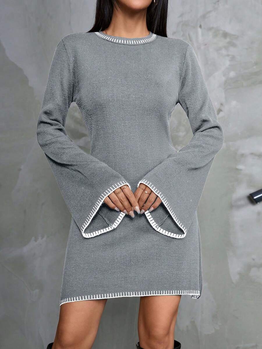 Abito mini in maglia a costine con scollo quadrato e dettagli a punto, tinta unita