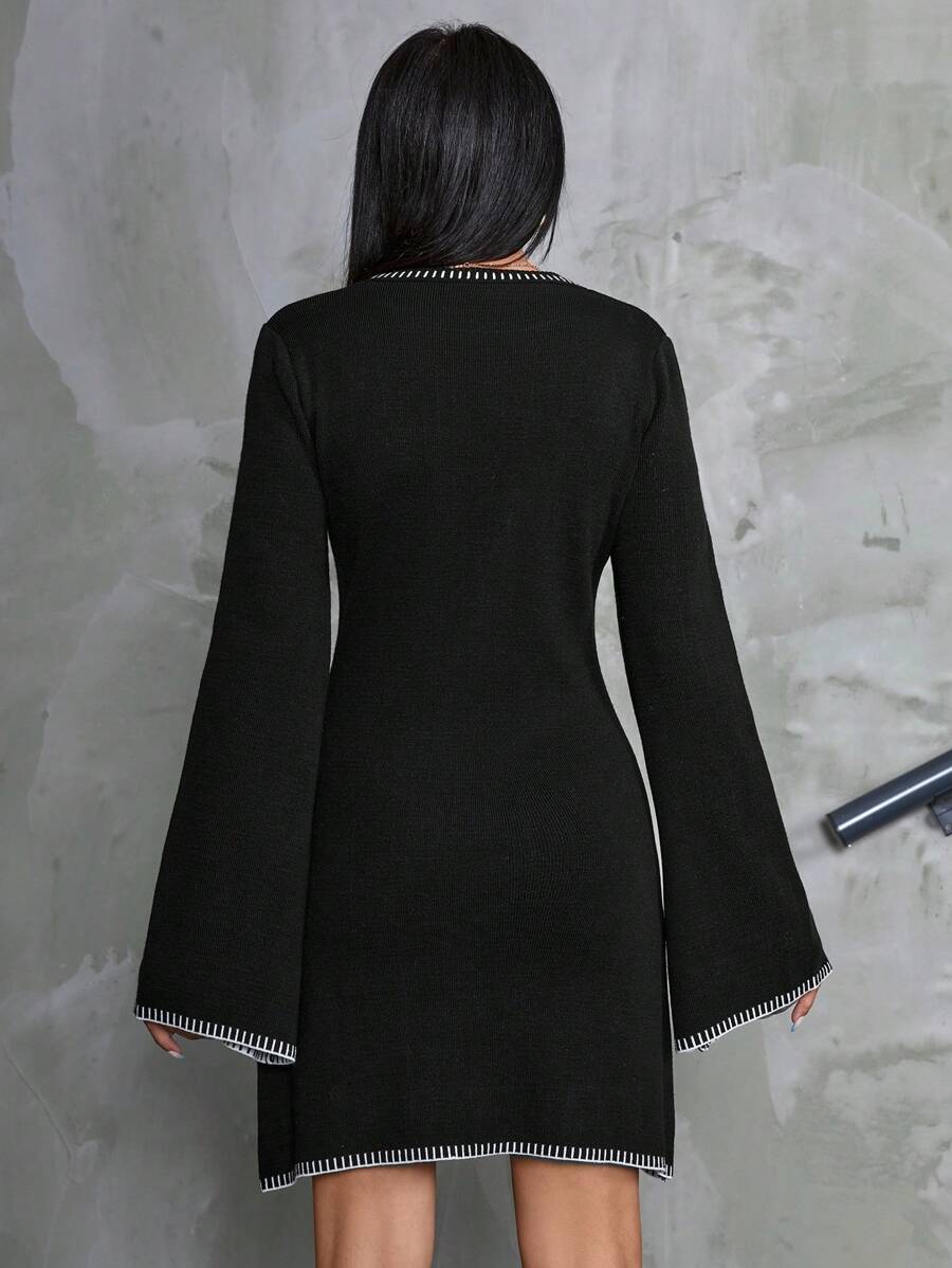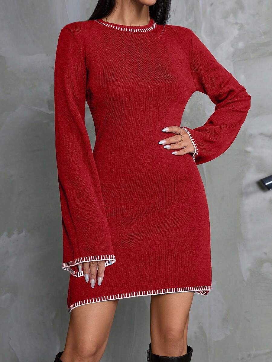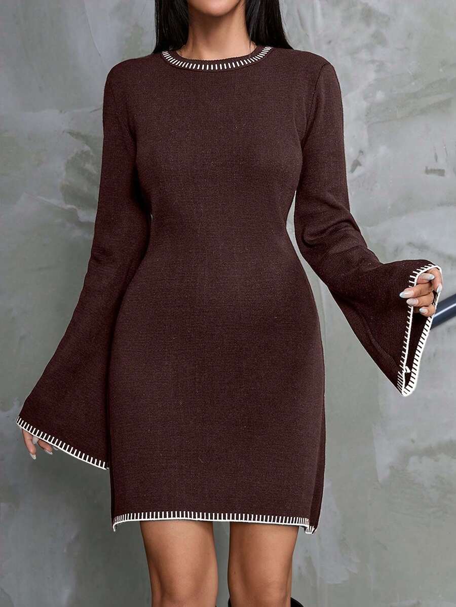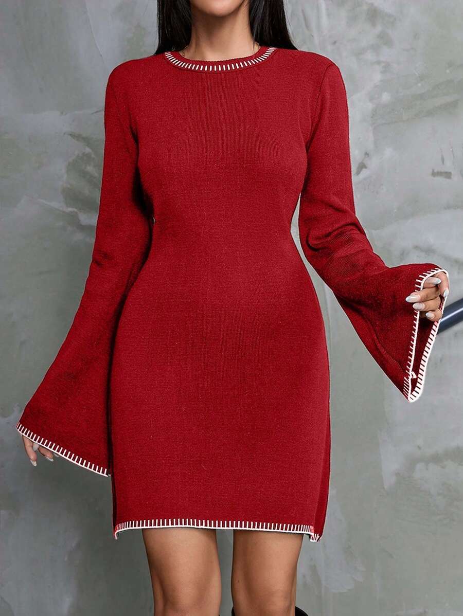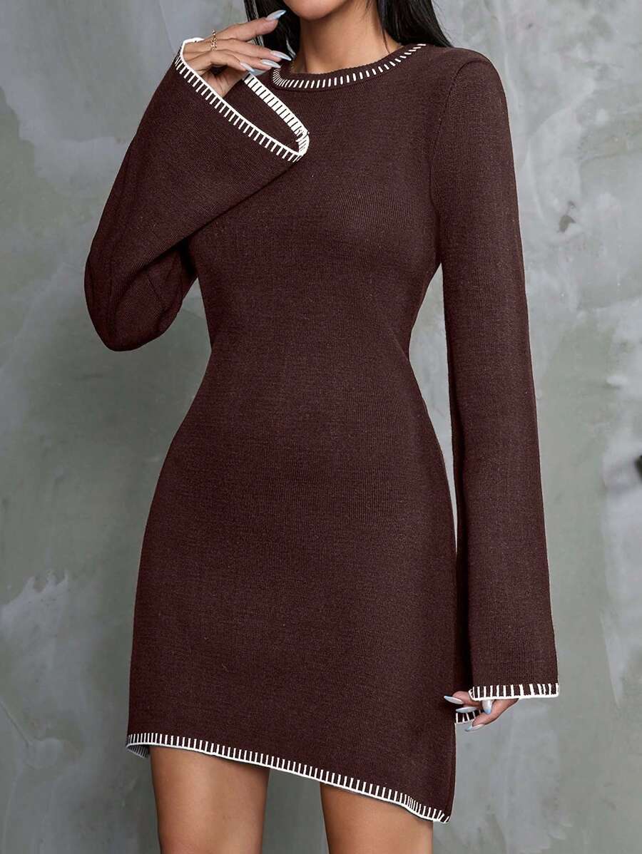 Abito mini in maglia a costine con scollo quadrato e dettagli a punto, tinta unita
