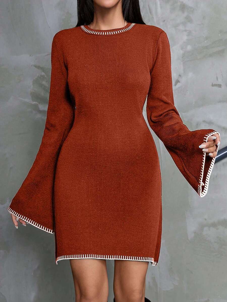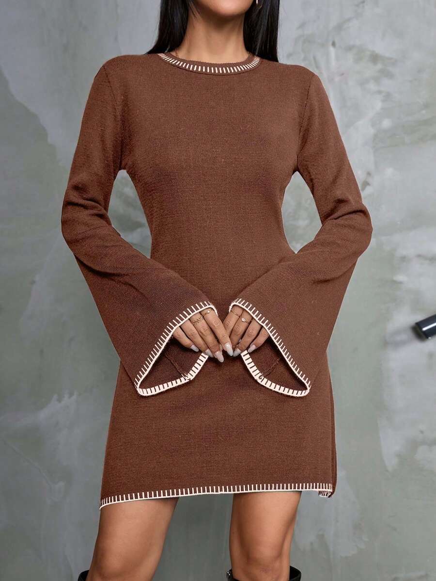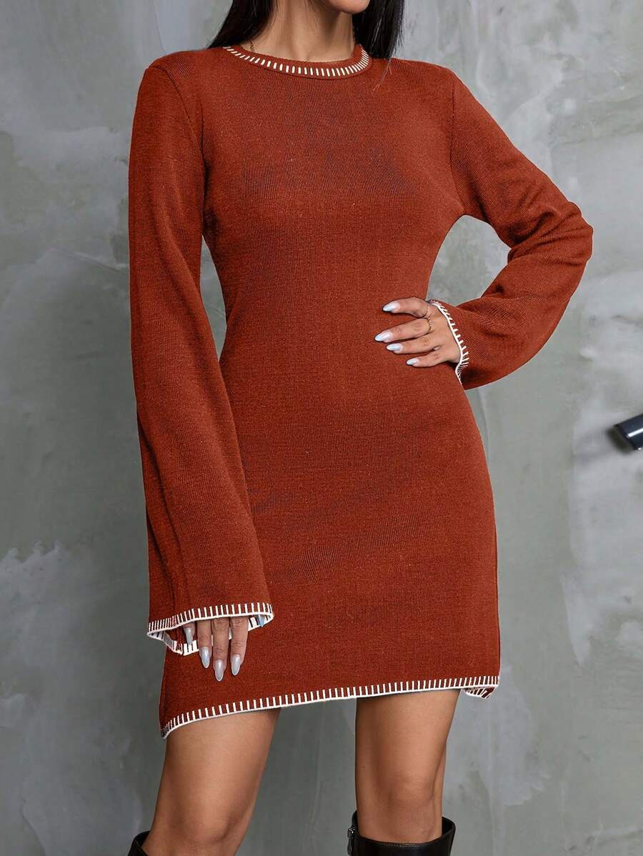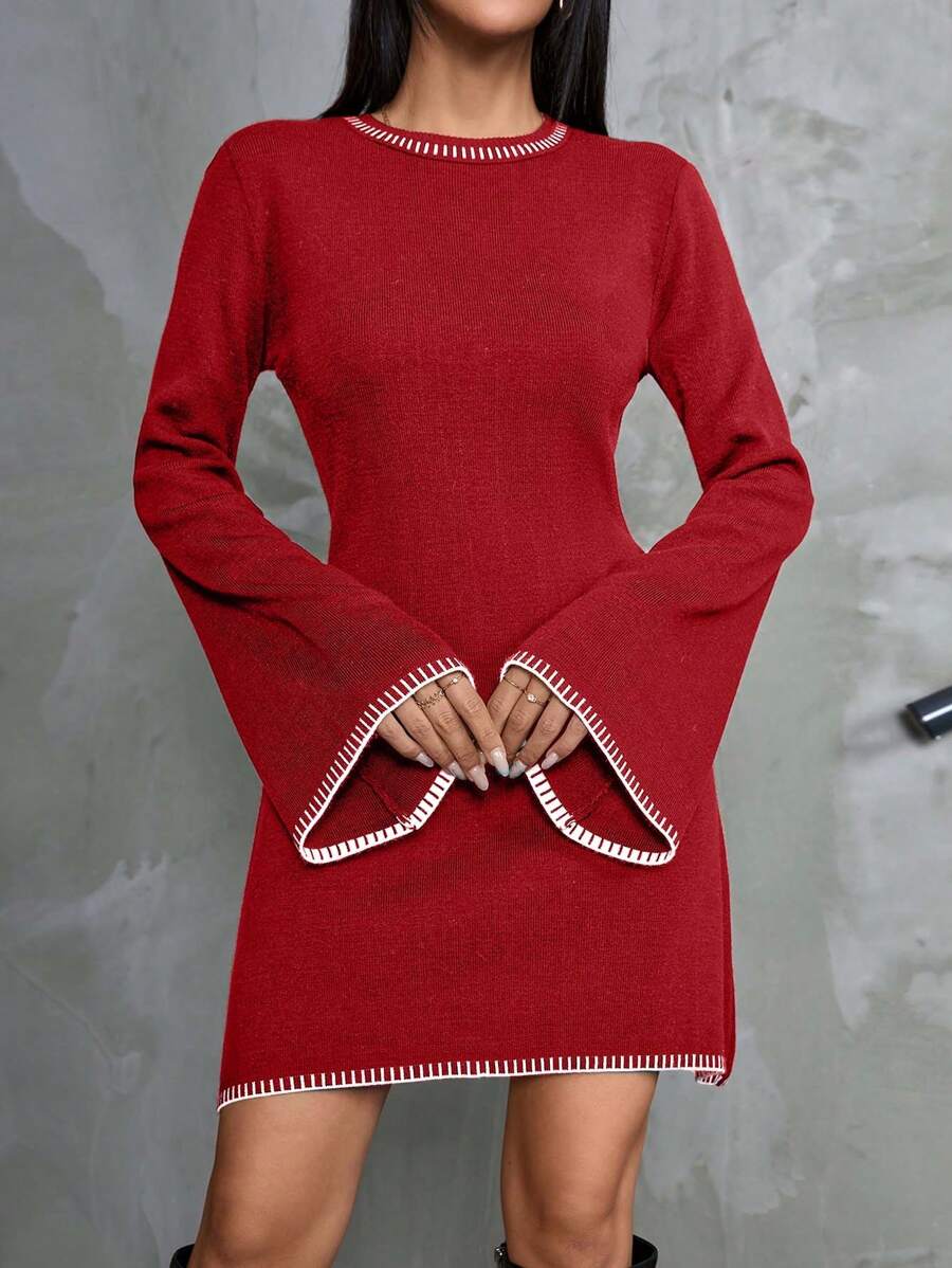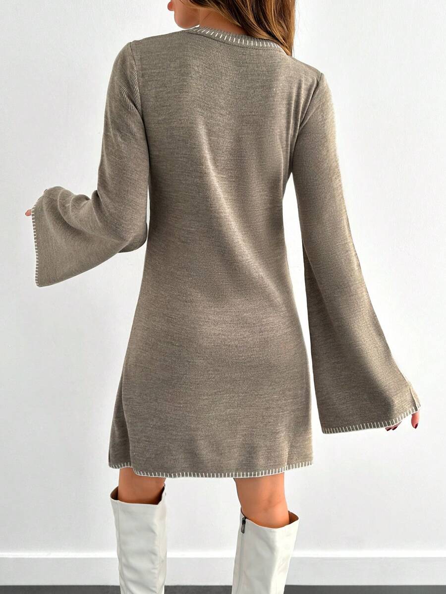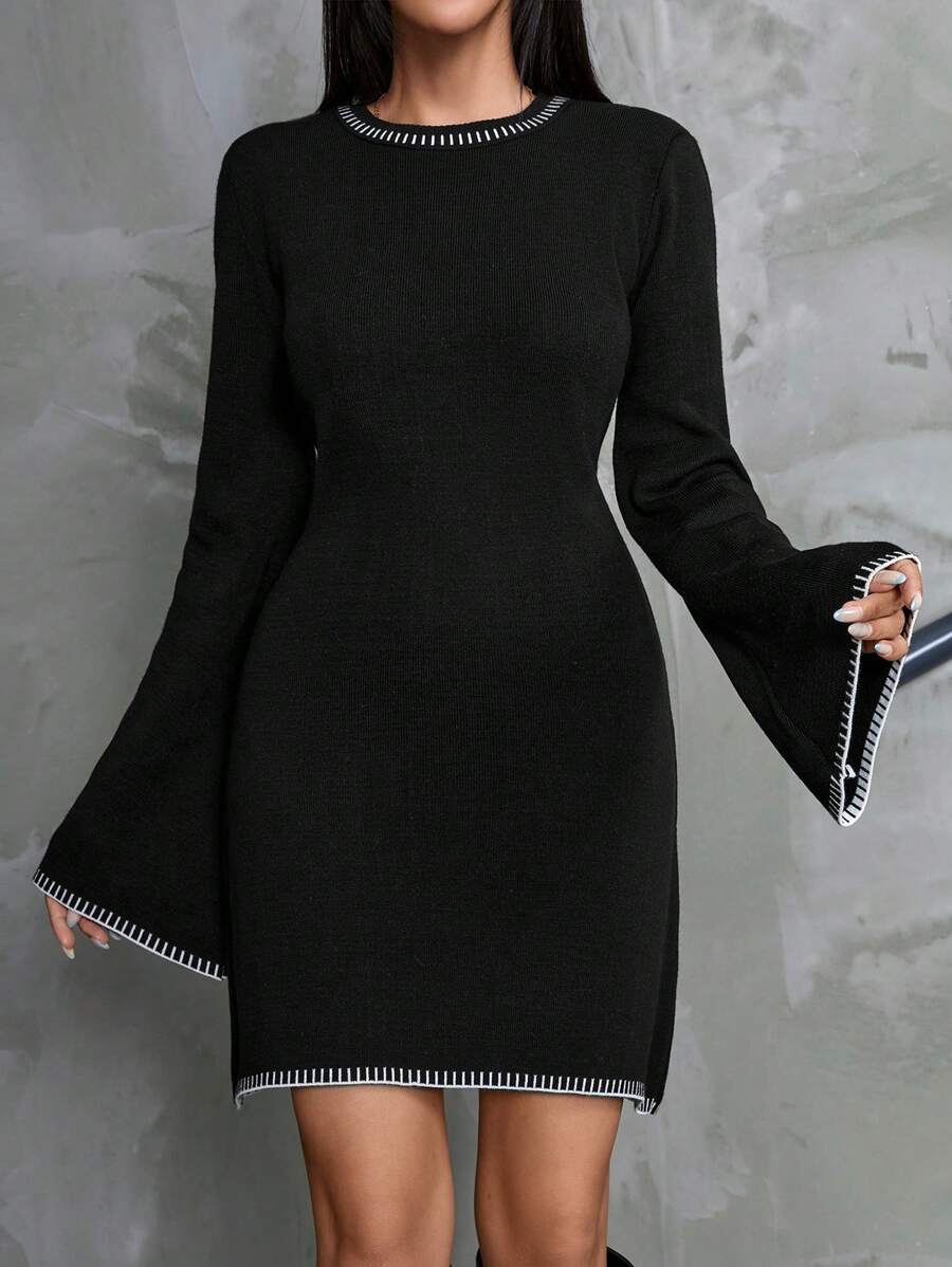 Abito mini in maglia a costine con scollo quadrato e dettagli a punto, tinta unita