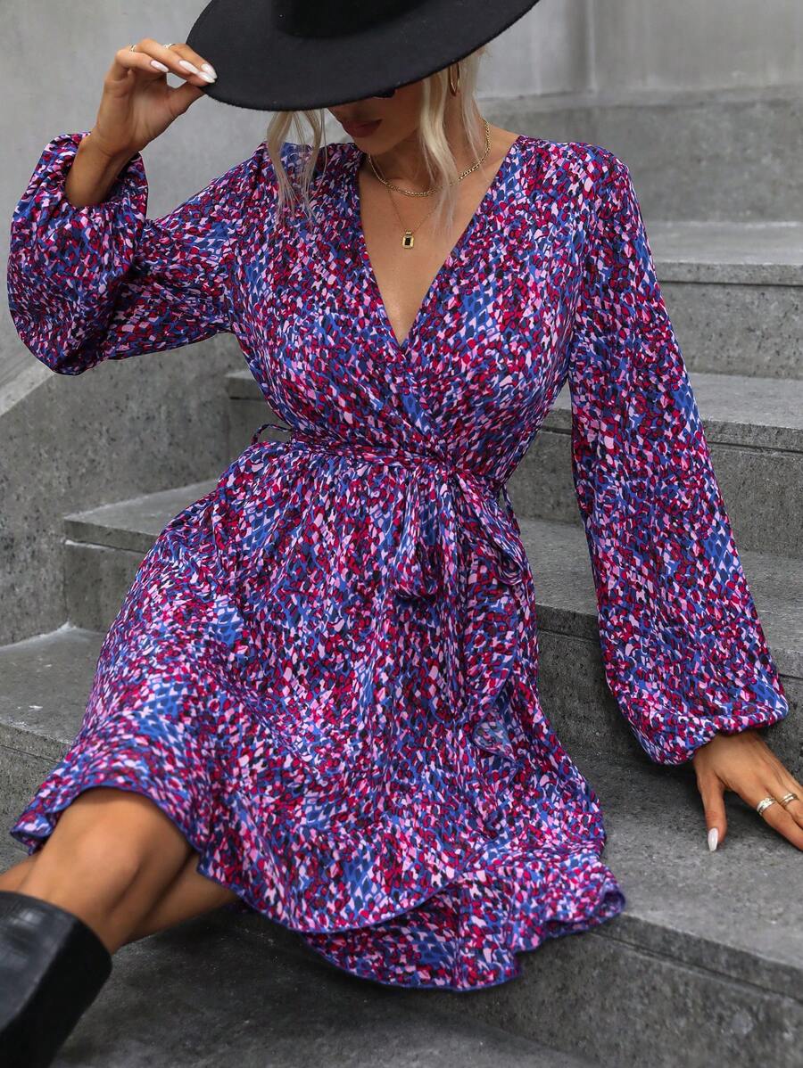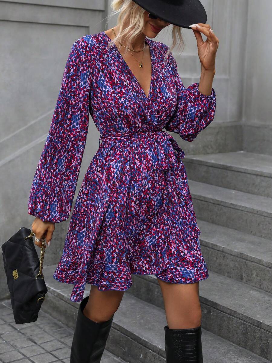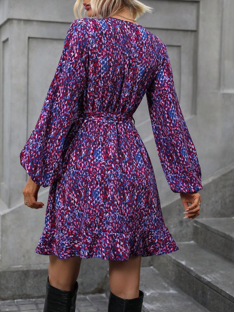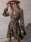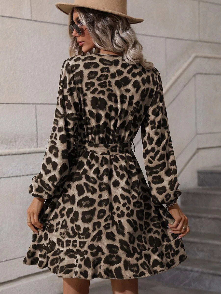 Abito con cintura con stampa leopardo scollo sovrapposto manica a sbuffo con volant