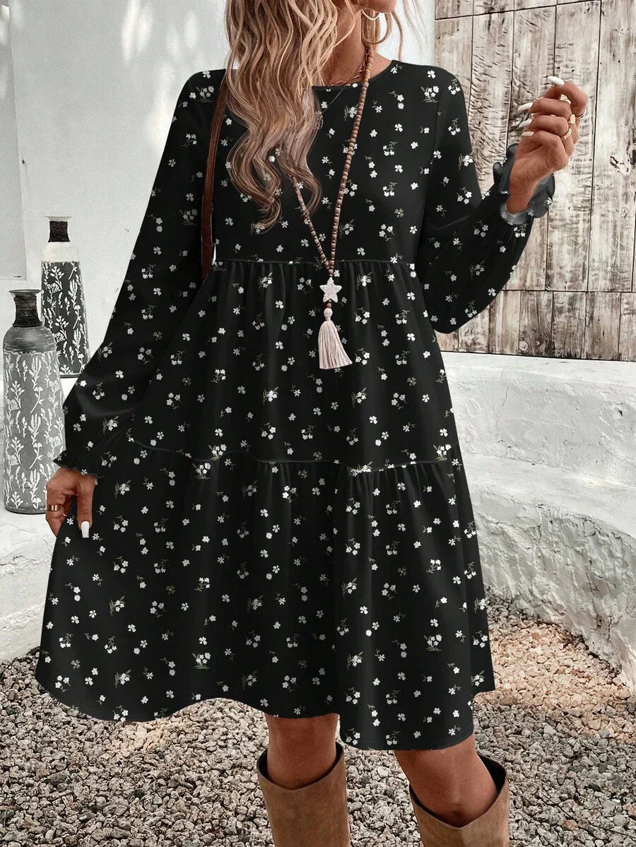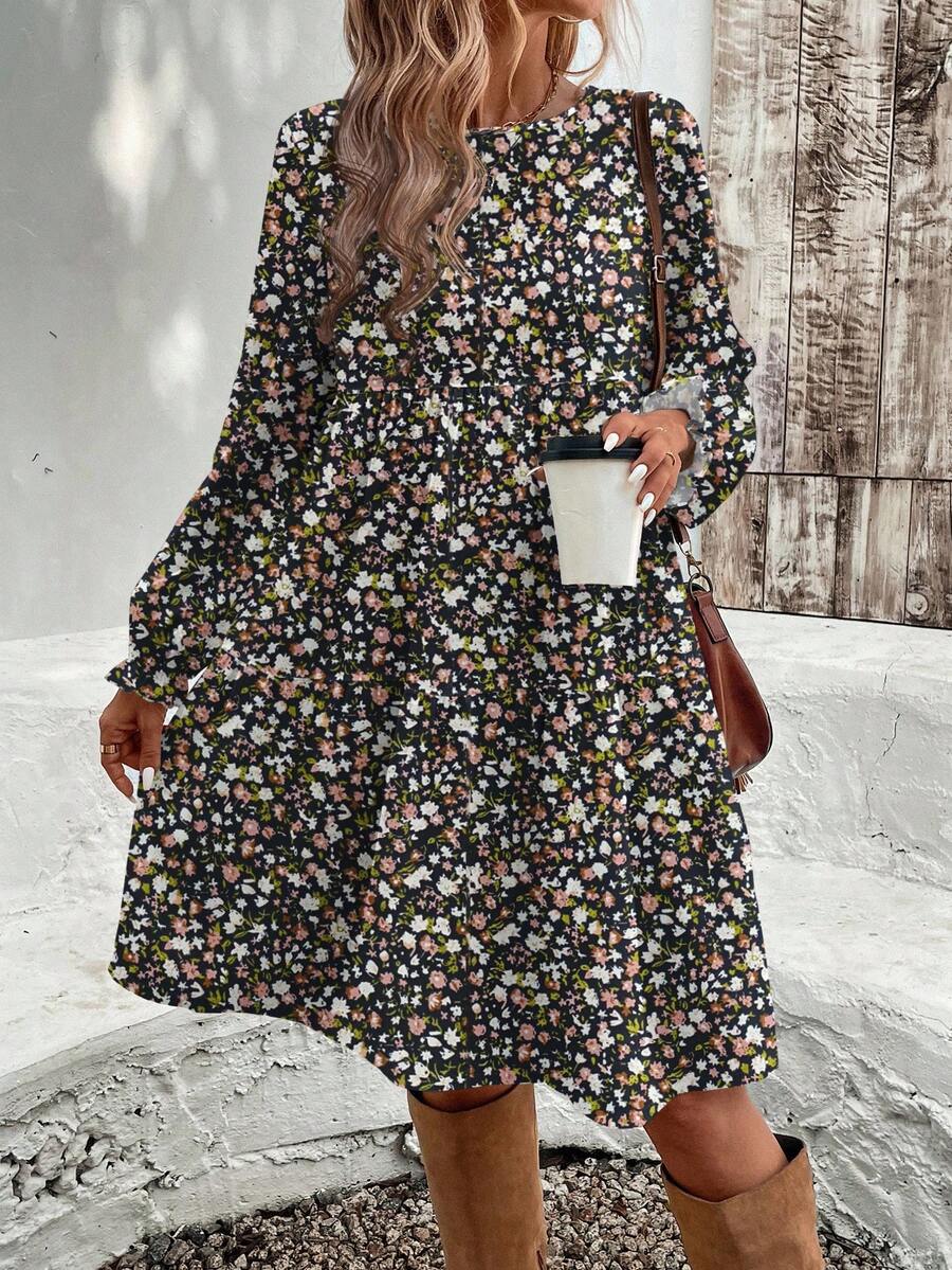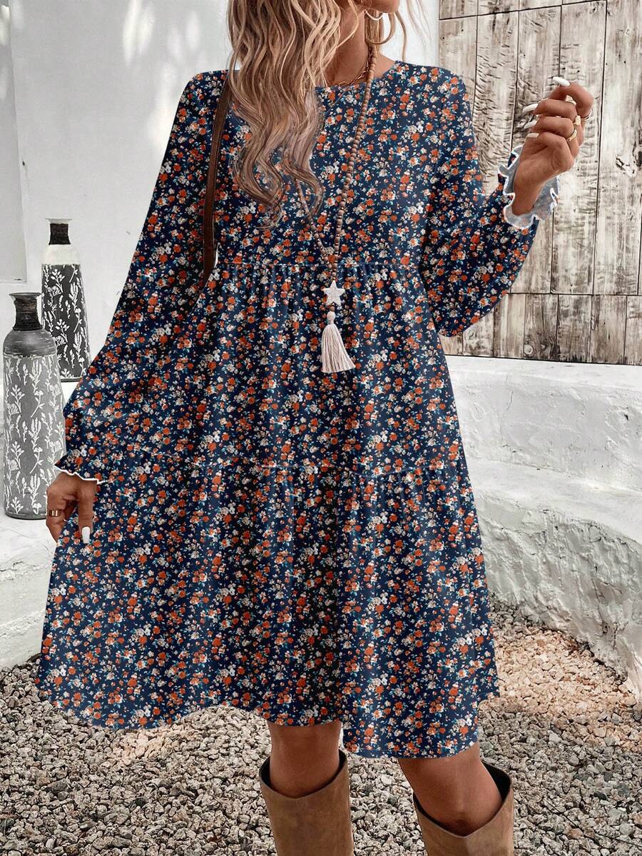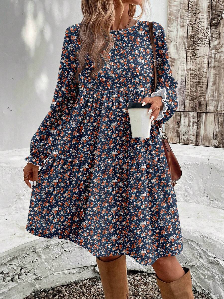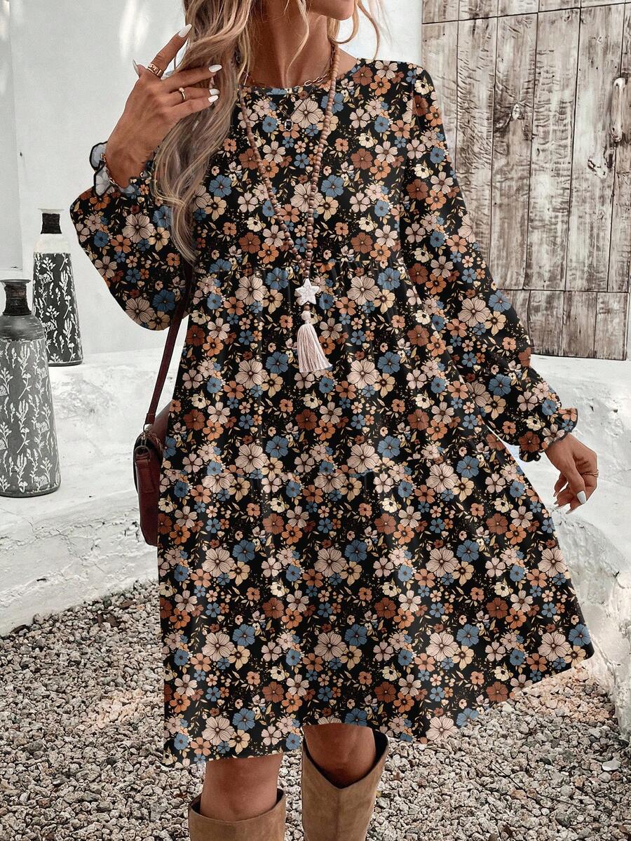 Abito corto da donna con scollo rotondo, maniche e orlo con volant, stampa retr˜