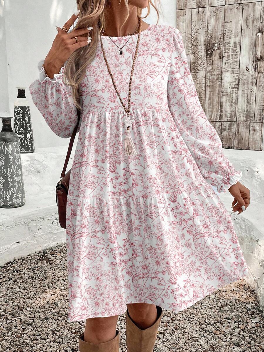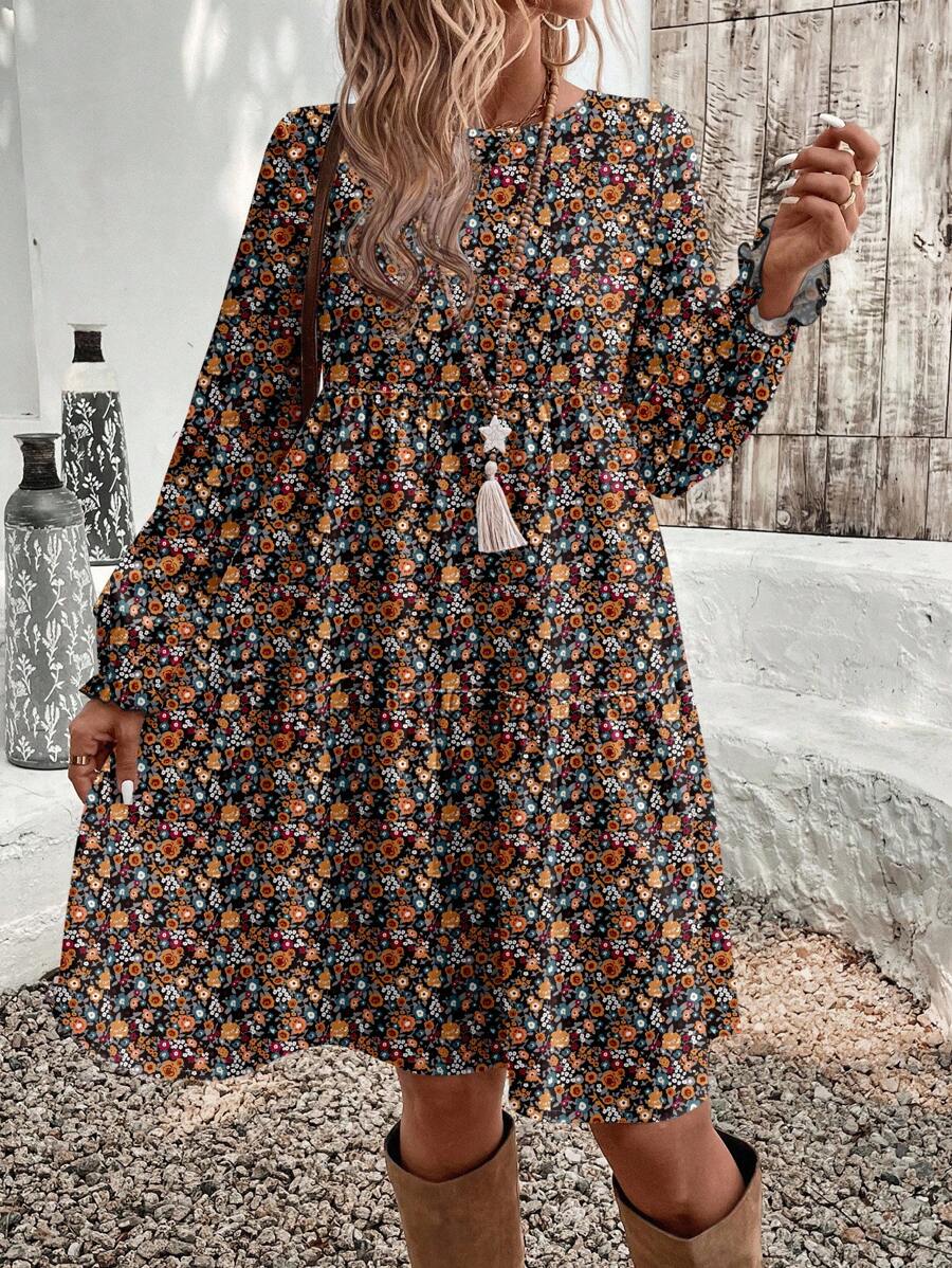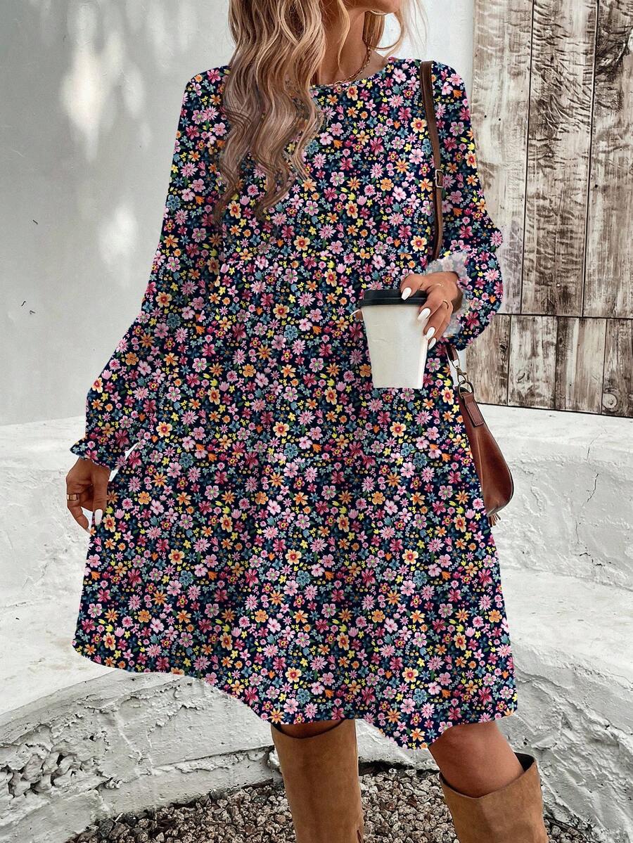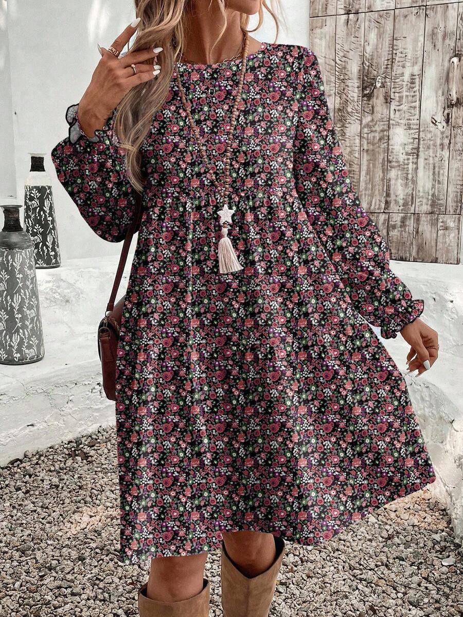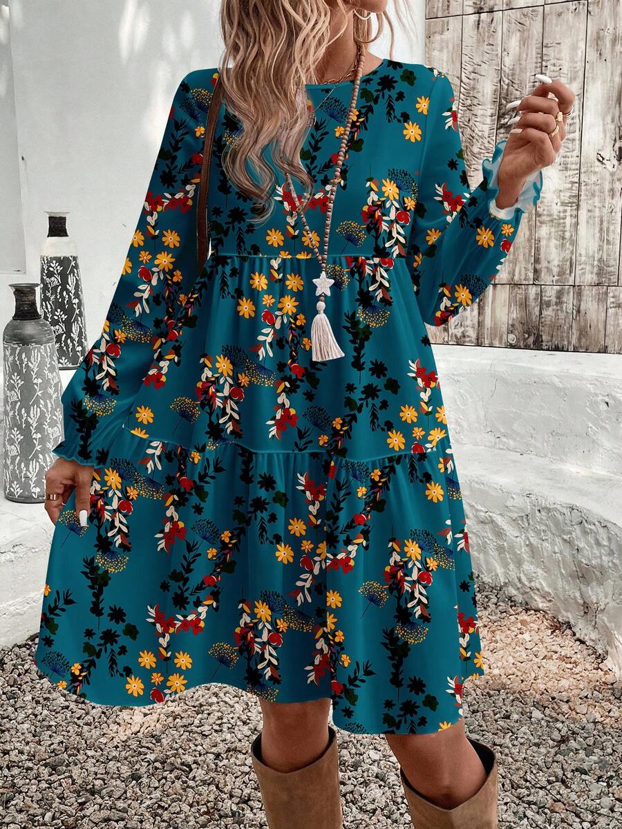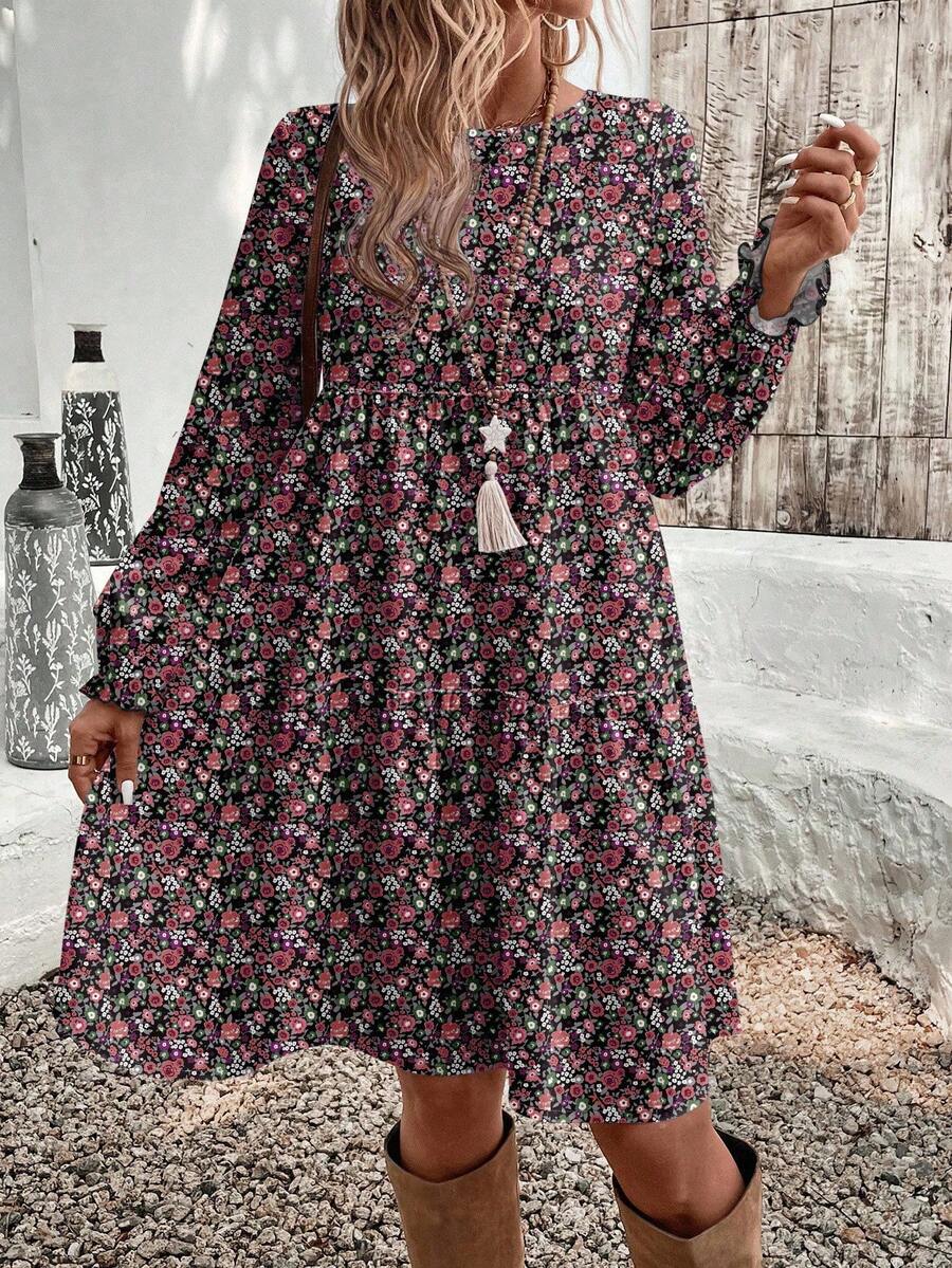 Abito corto da donna con scollo rotondo, maniche e orlo con volant, stampa retr˜