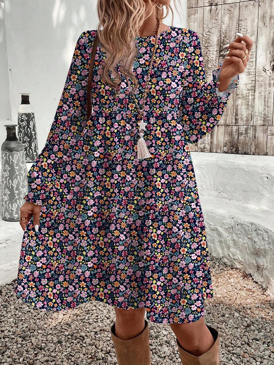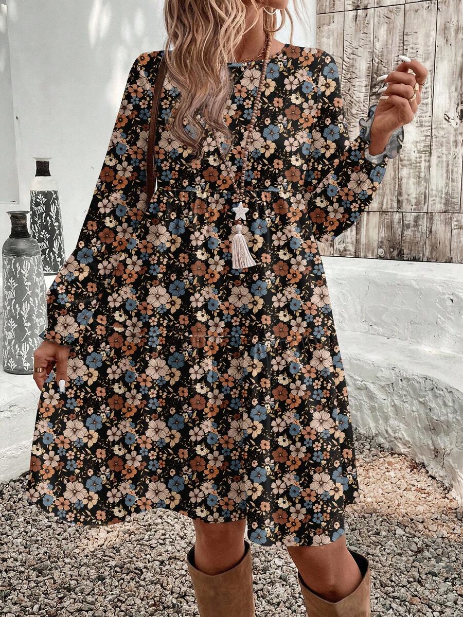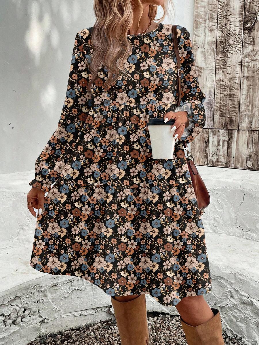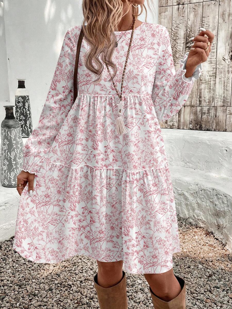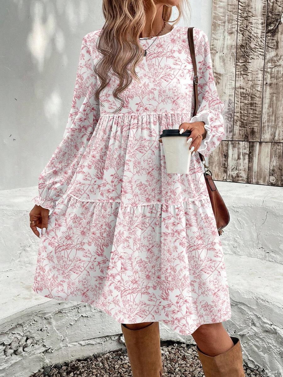 Abito corto da donna con scollo rotondo, maniche e orlo con volant, stampa retr˜