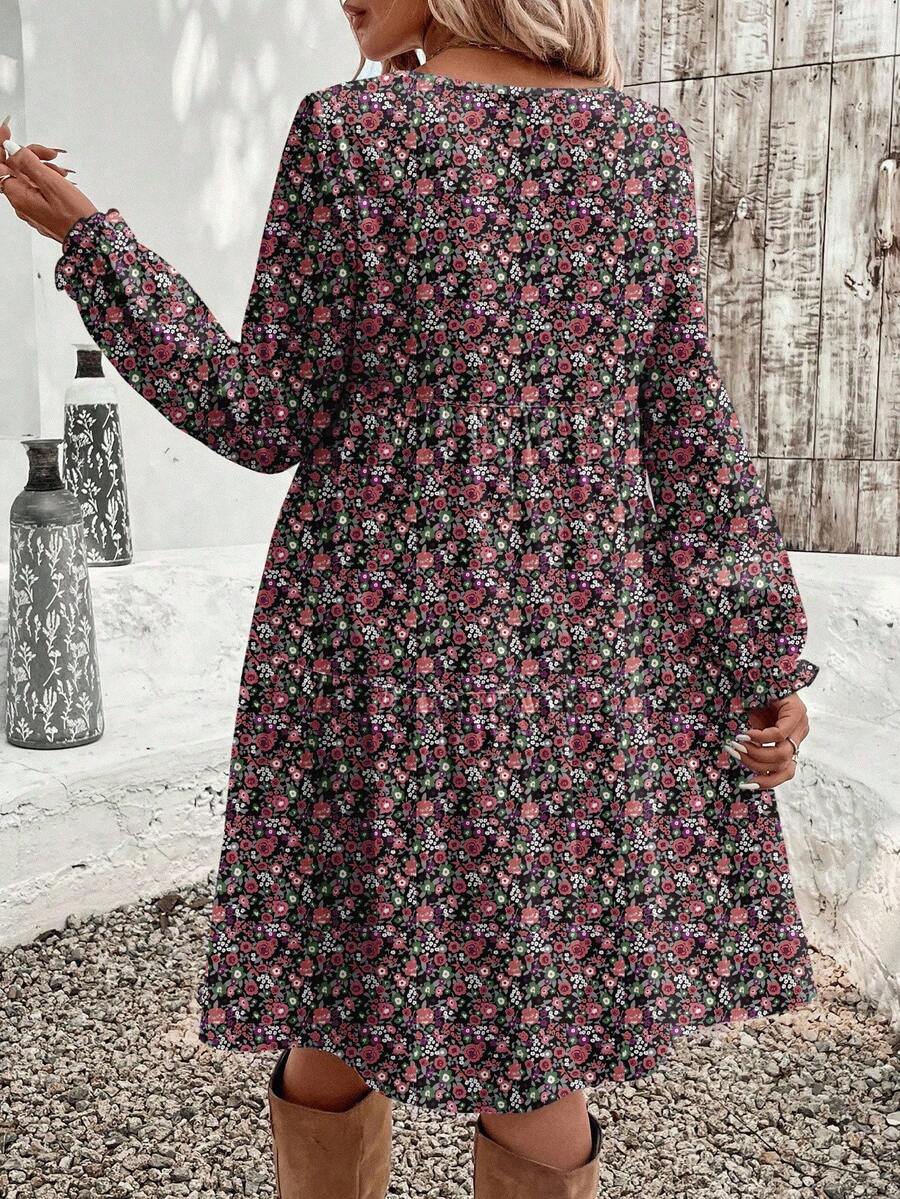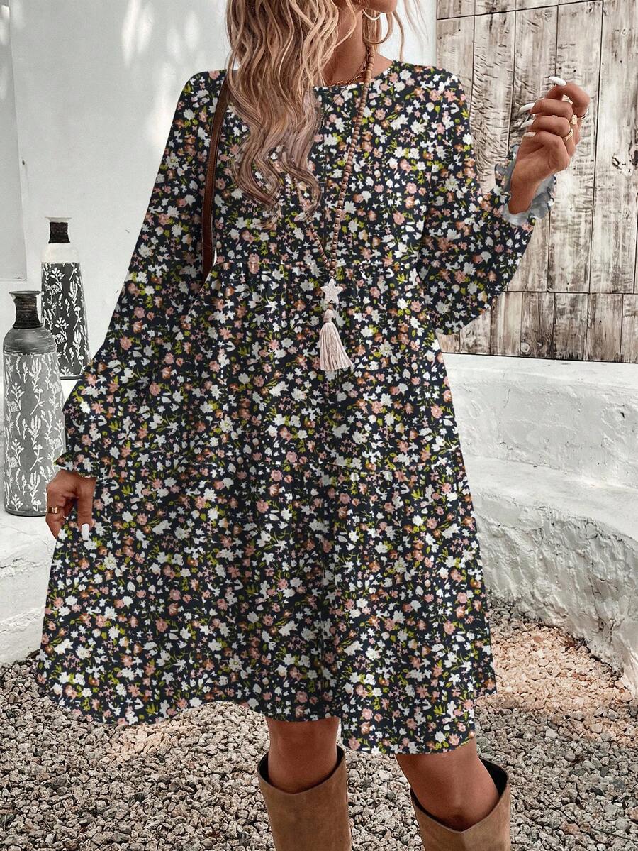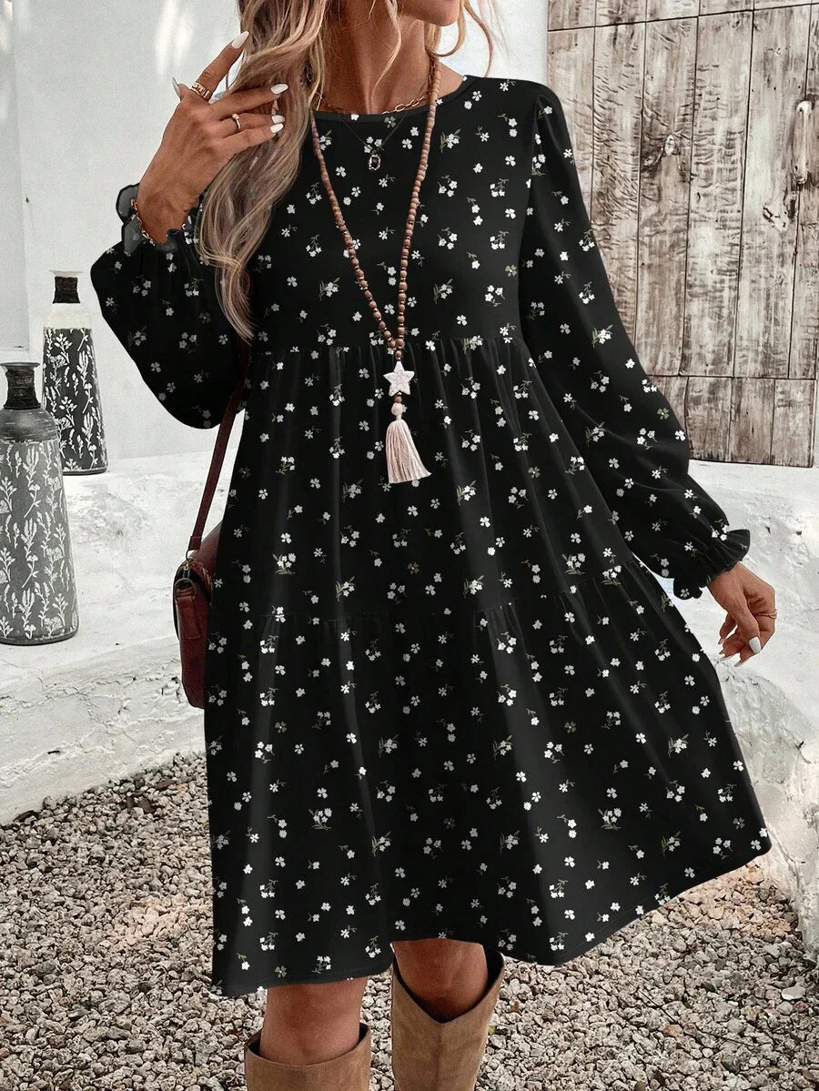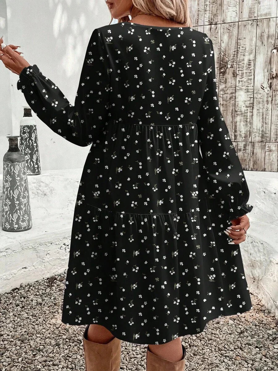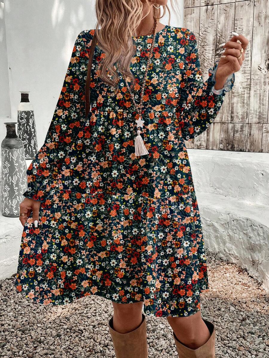 Abito corto da donna con scollo rotondo, maniche e orlo con volant, stampa retr˜
