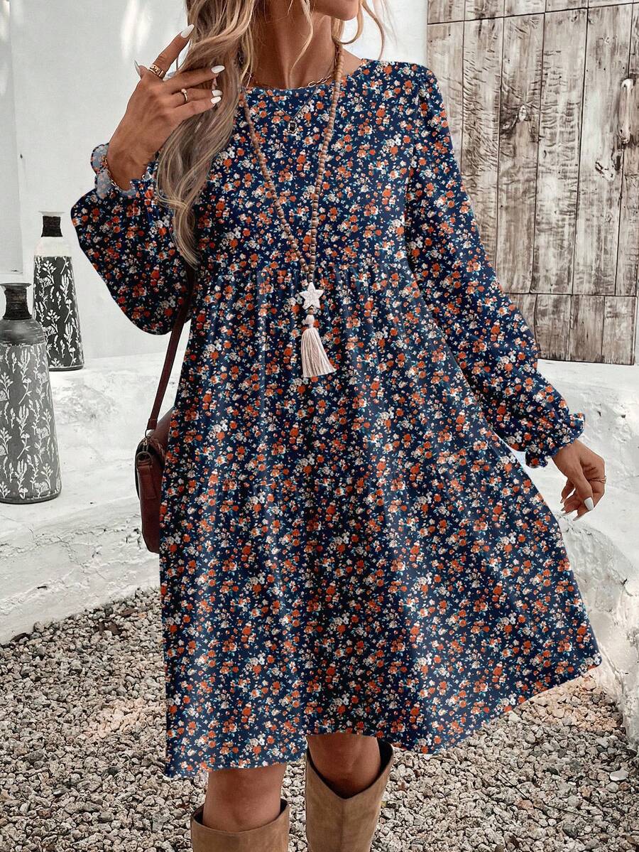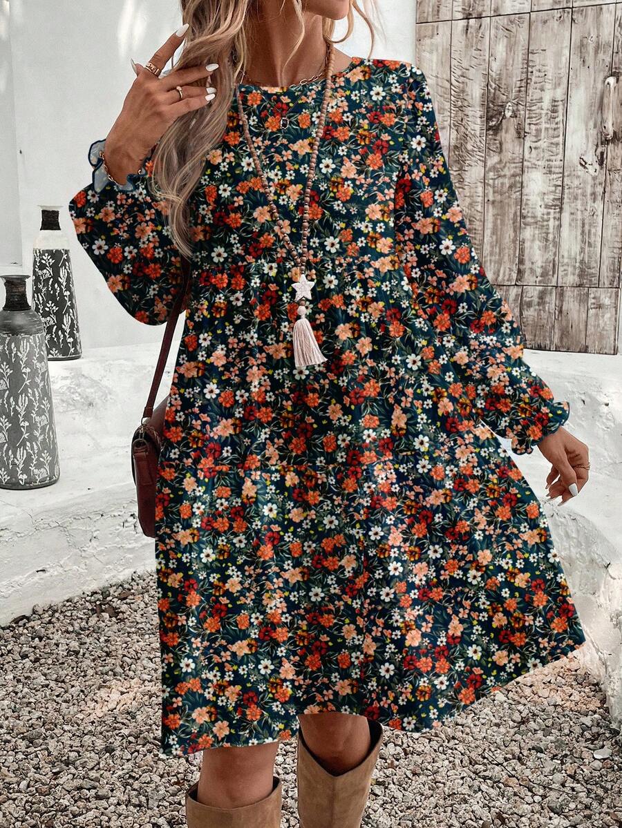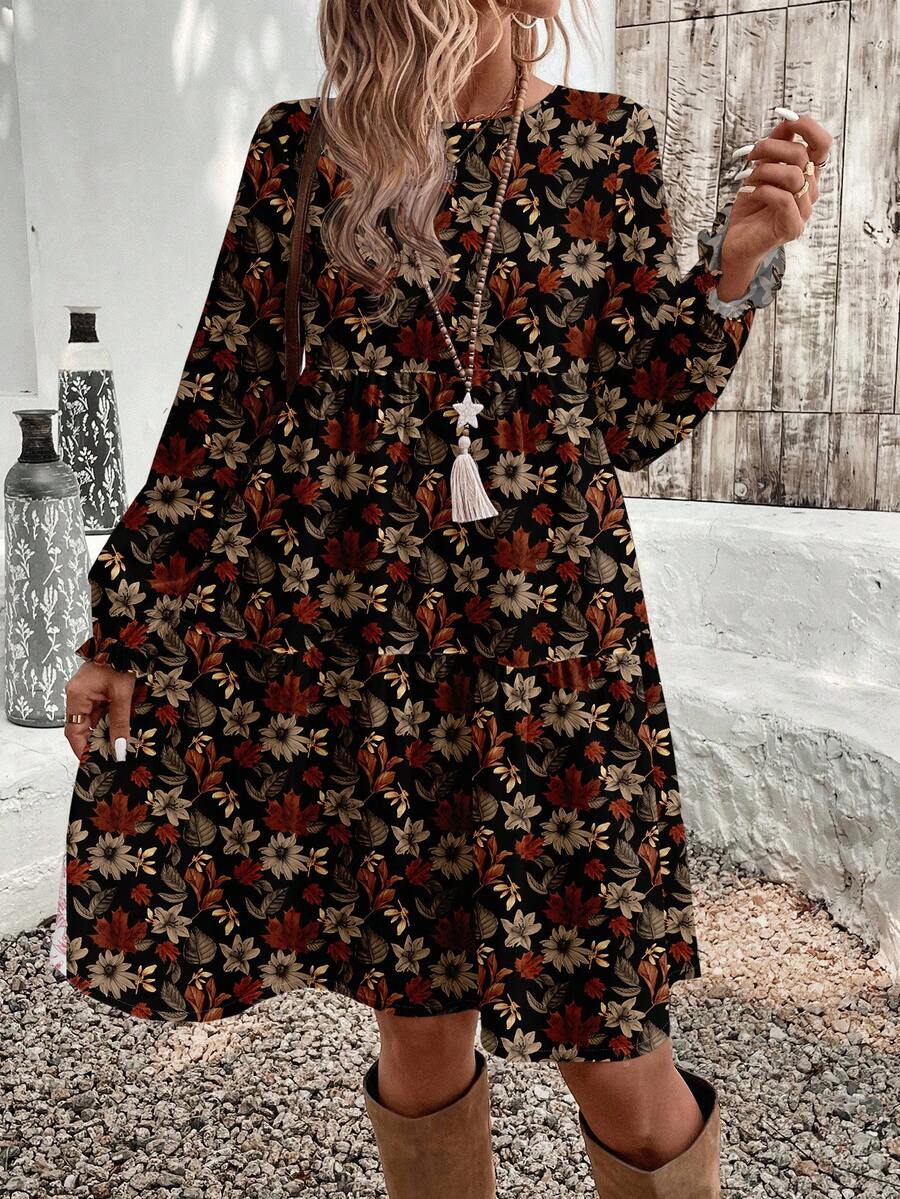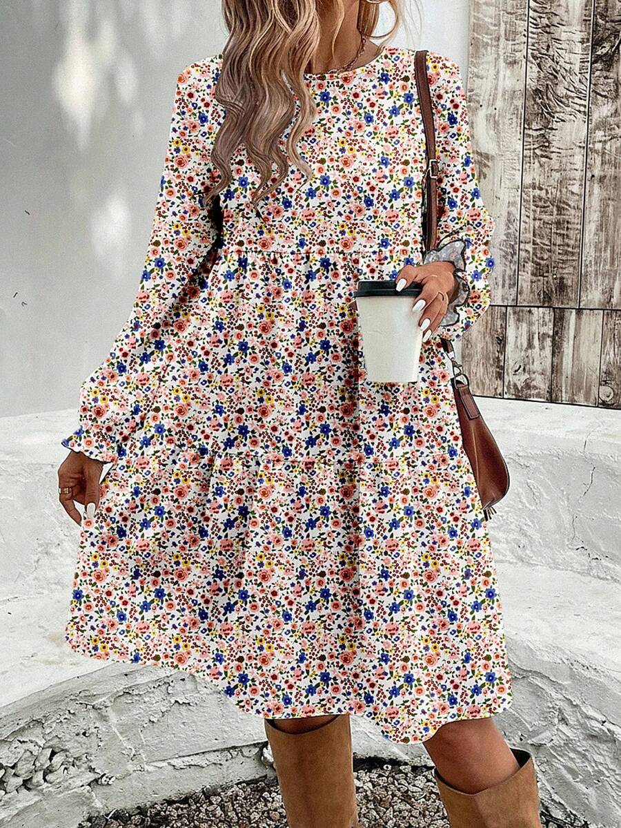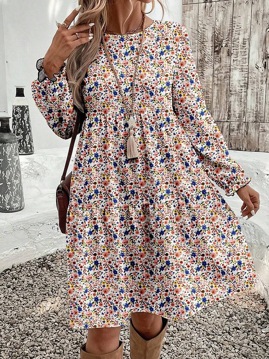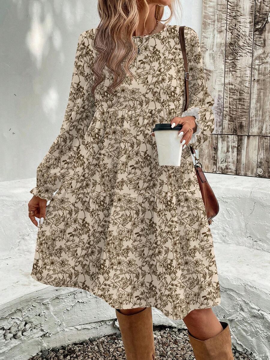 Abito corto da donna con scollo rotondo, maniche e orlo con volant, stampa retr˜