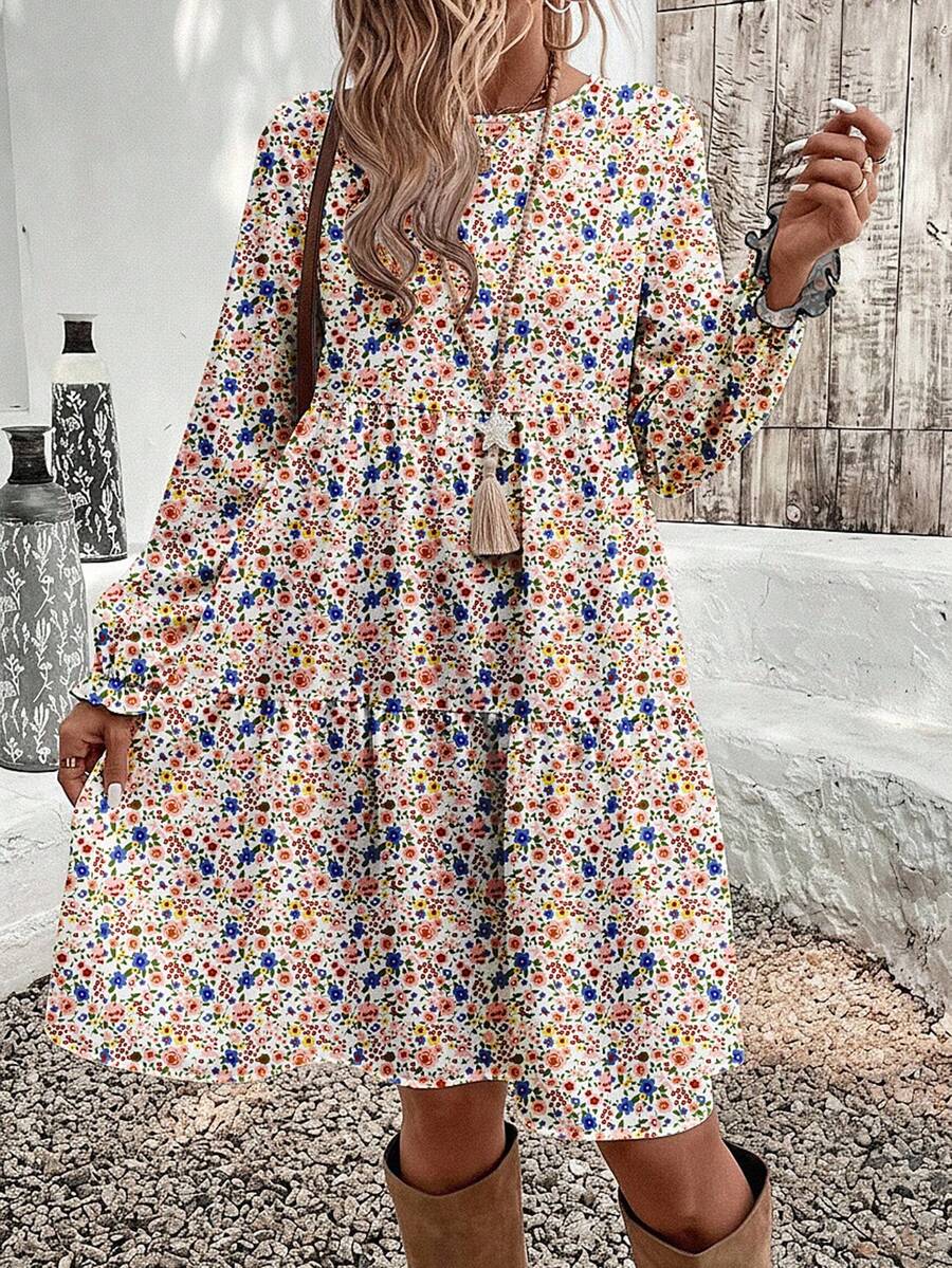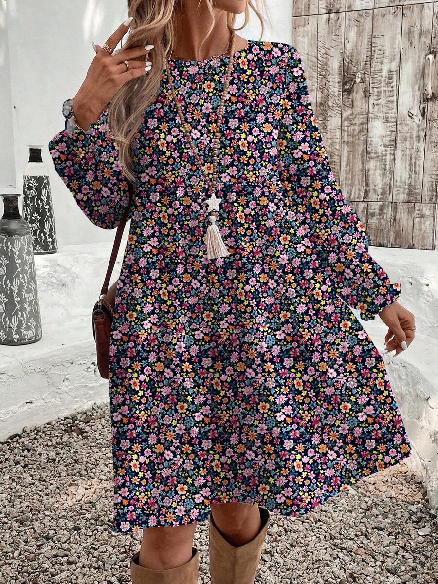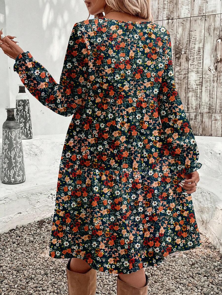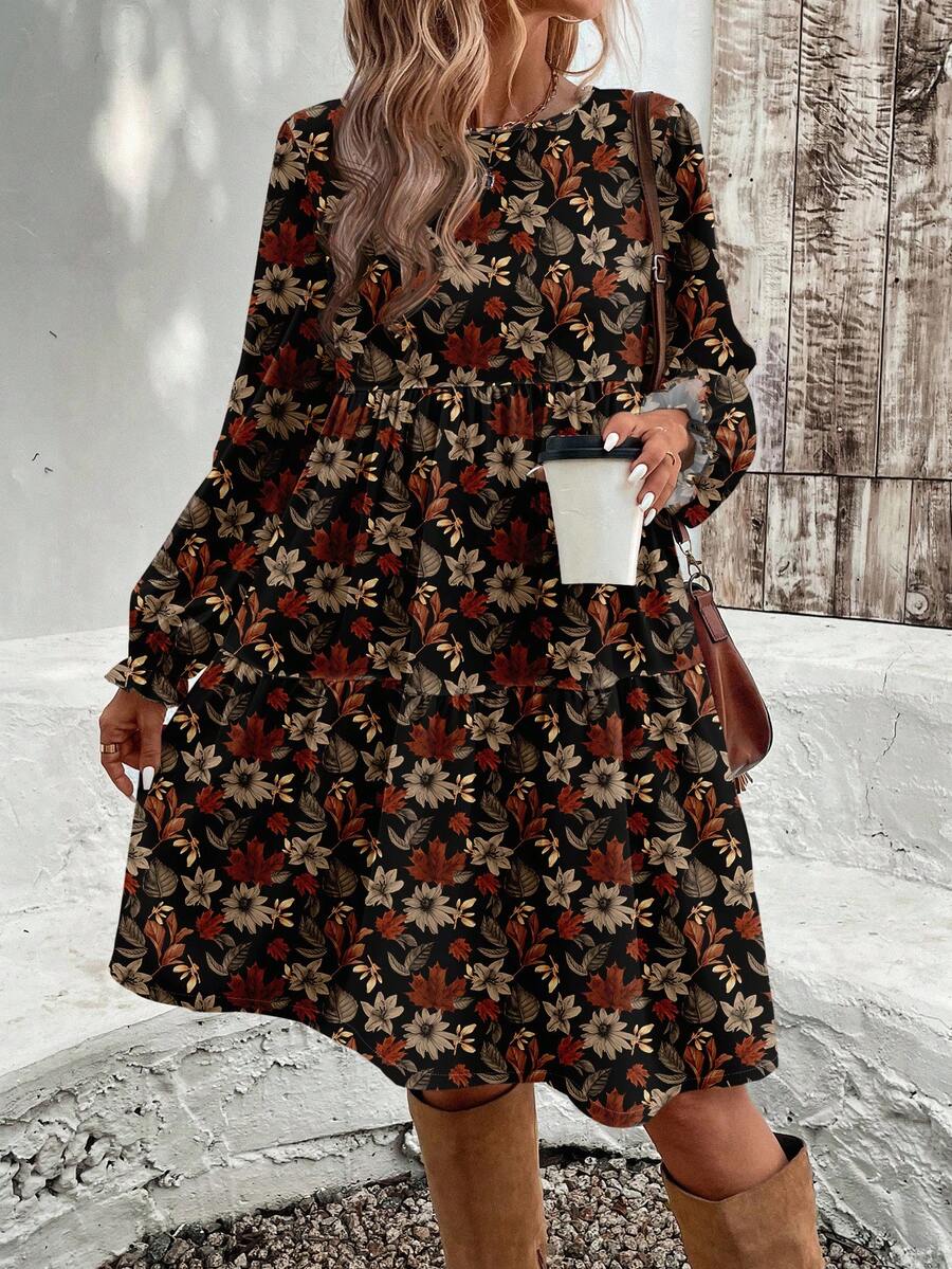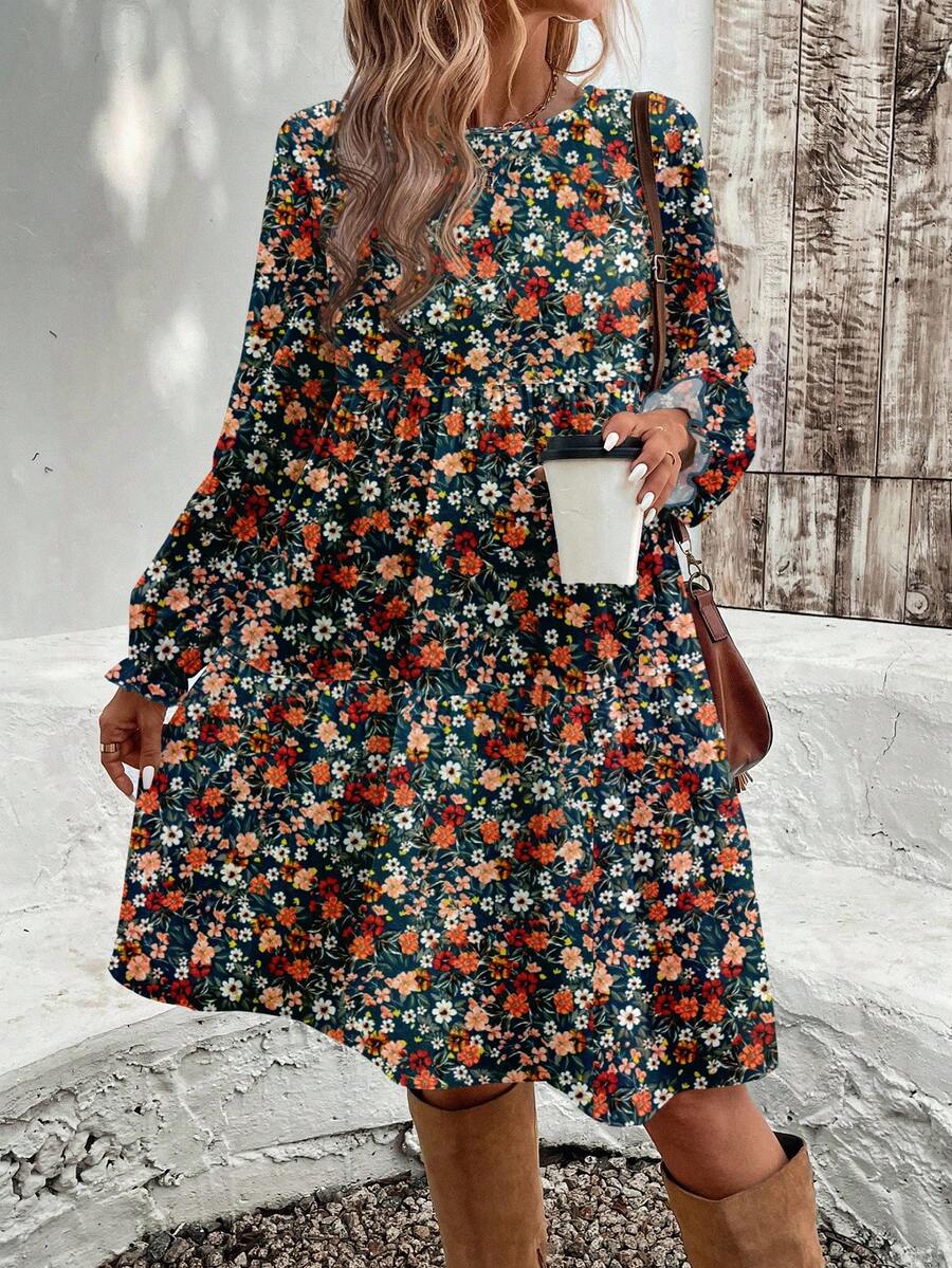 Abito corto da donna con scollo rotondo, maniche e orlo con volant, stampa retr˜