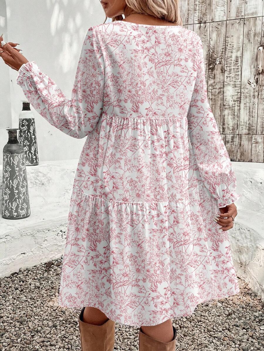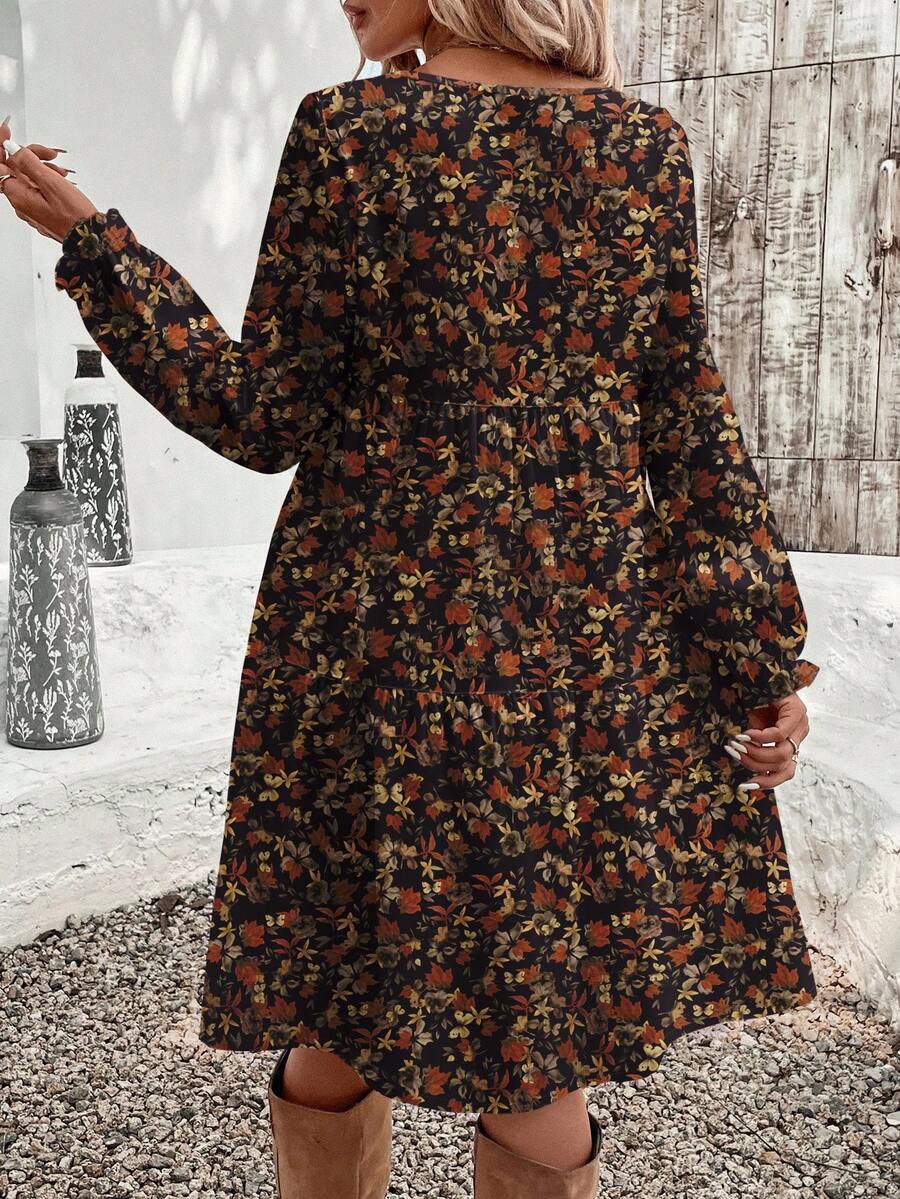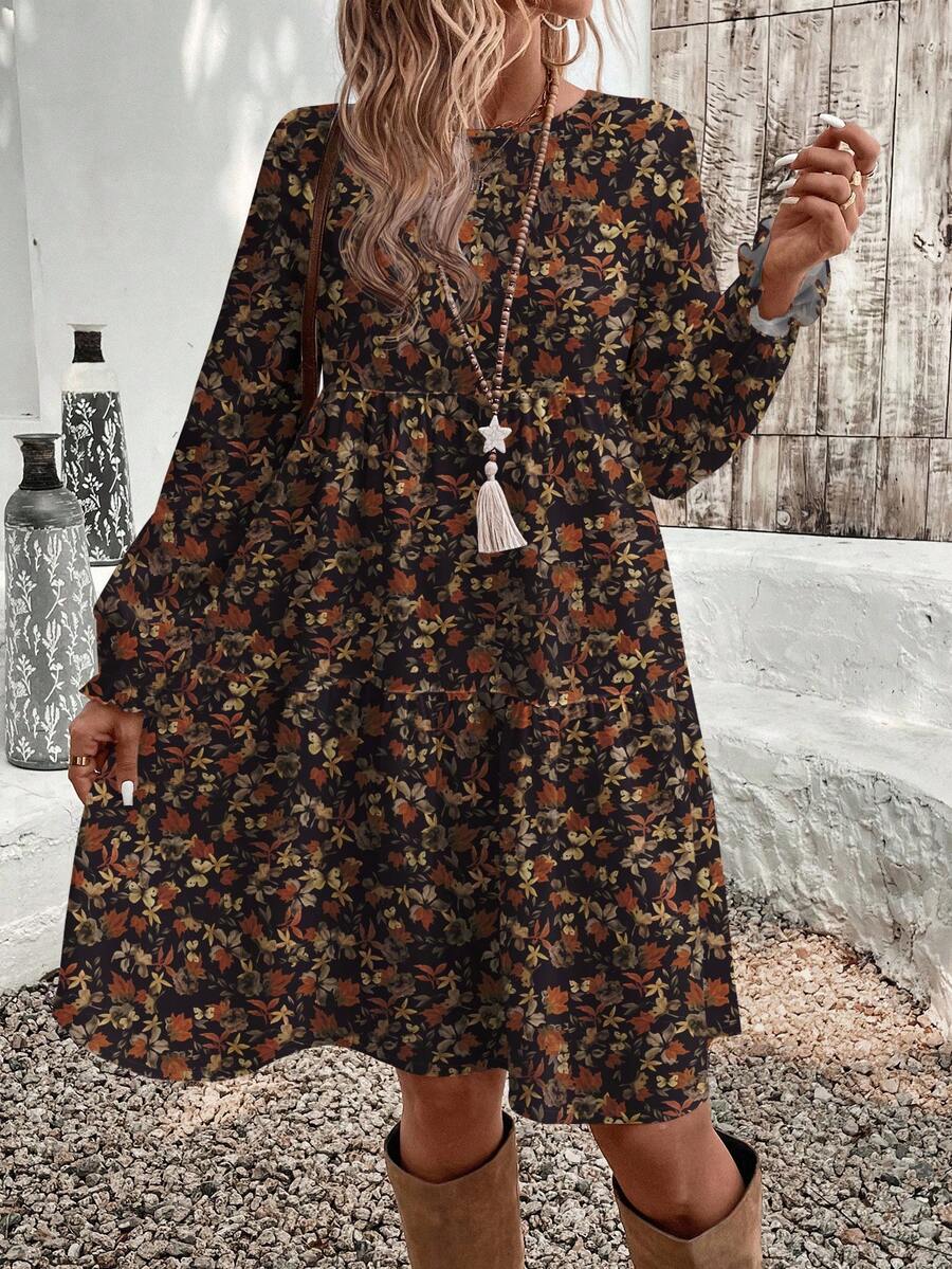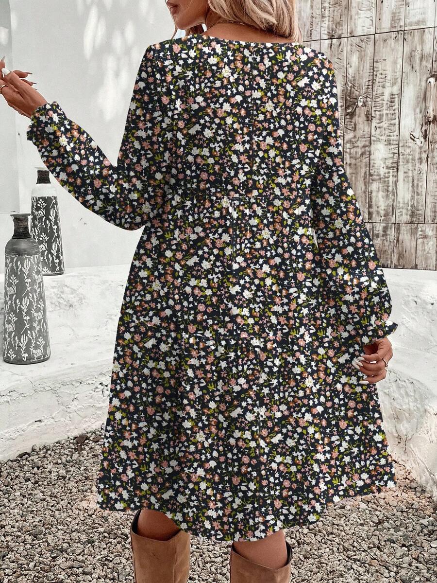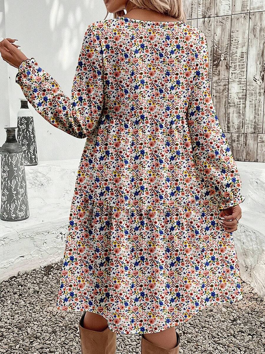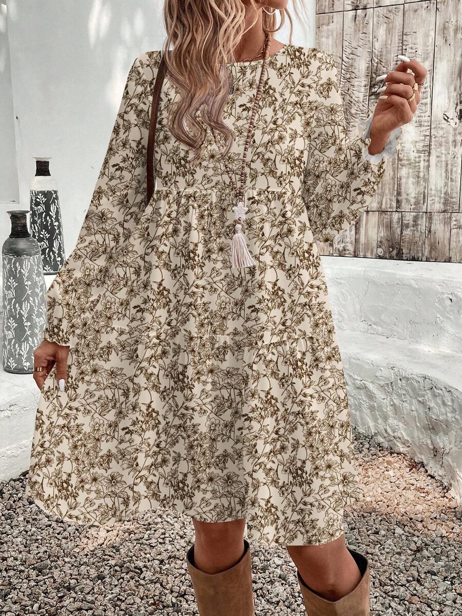 Abito corto da donna con scollo rotondo, maniche e orlo con volant, stampa retr˜
