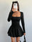 Abito mini da donna con schiena aperta, design a fiore bocciolo cavo, collo quadrato e maniche lunghe