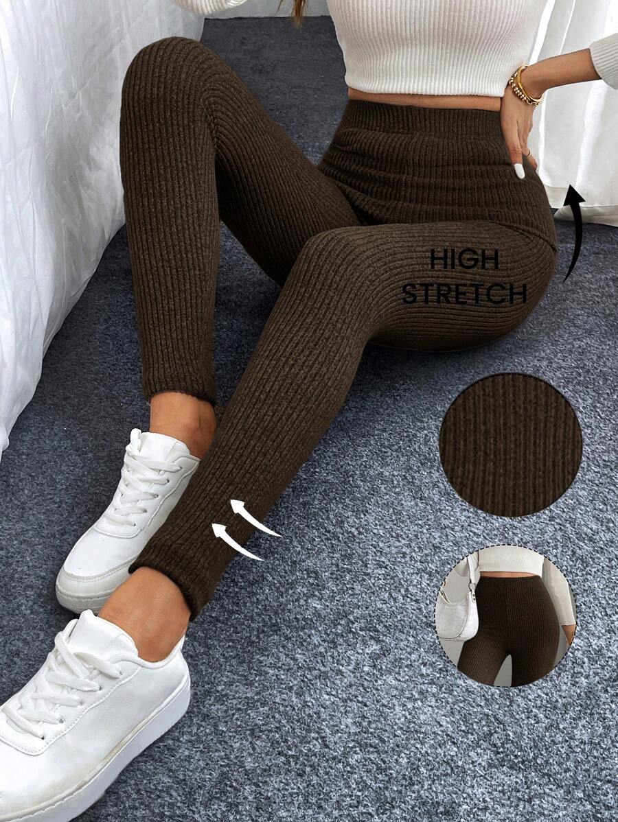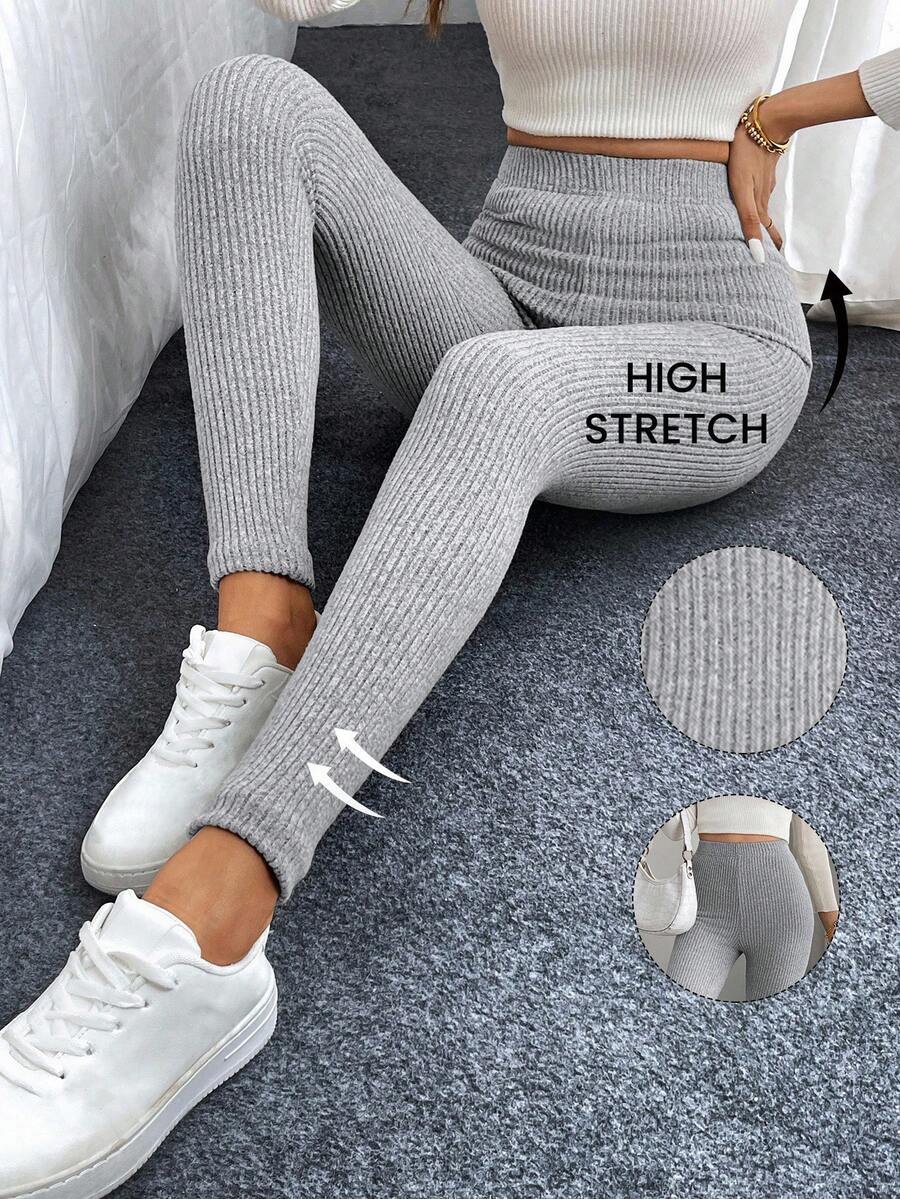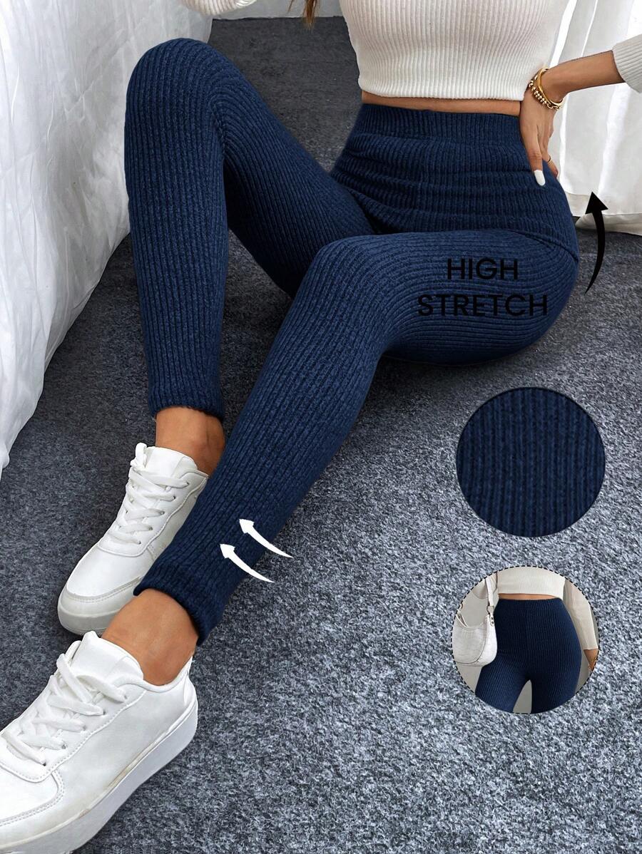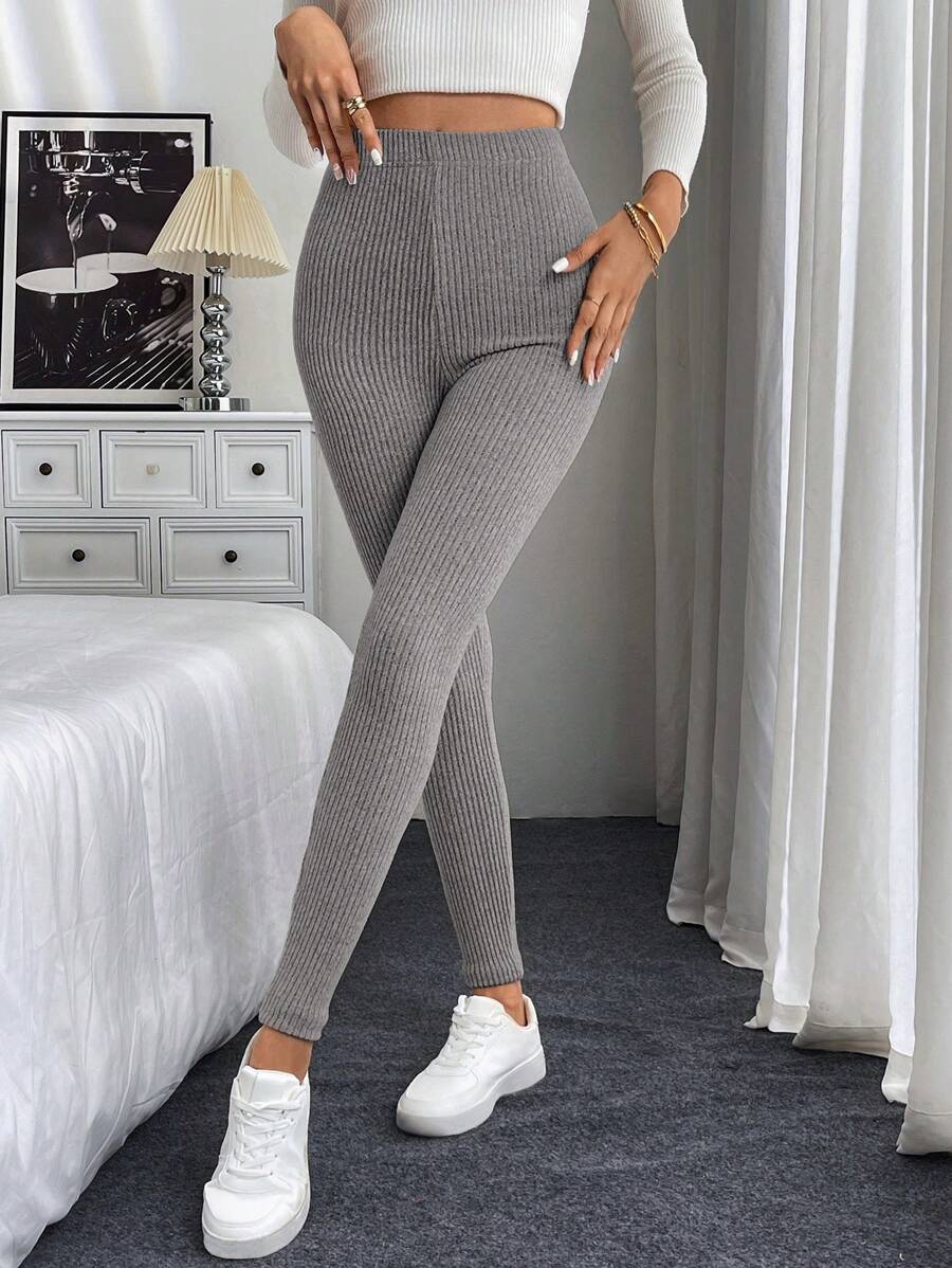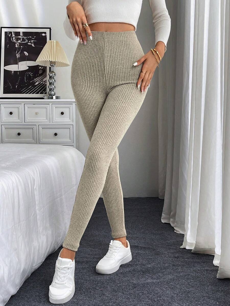 Leggings casual da donna in vita alta con costine e fodera in pile