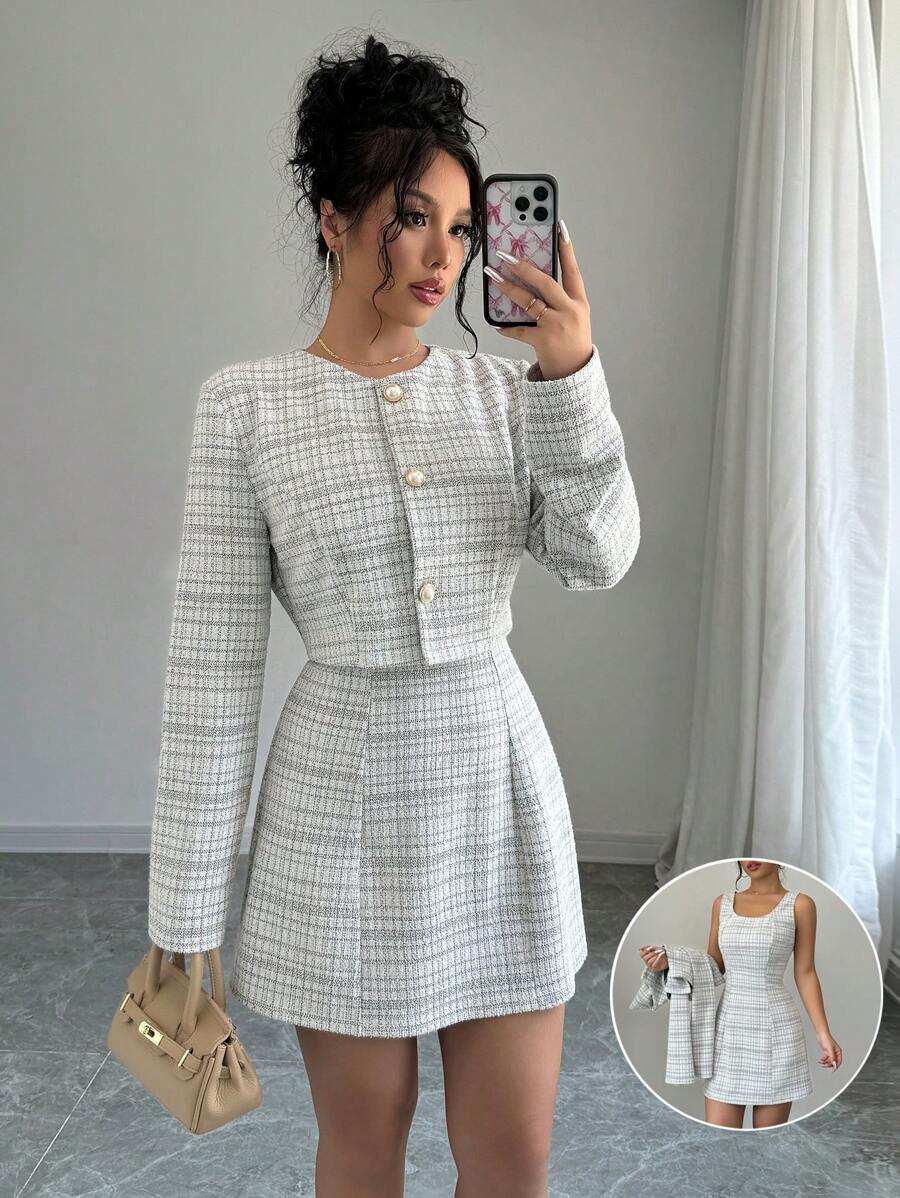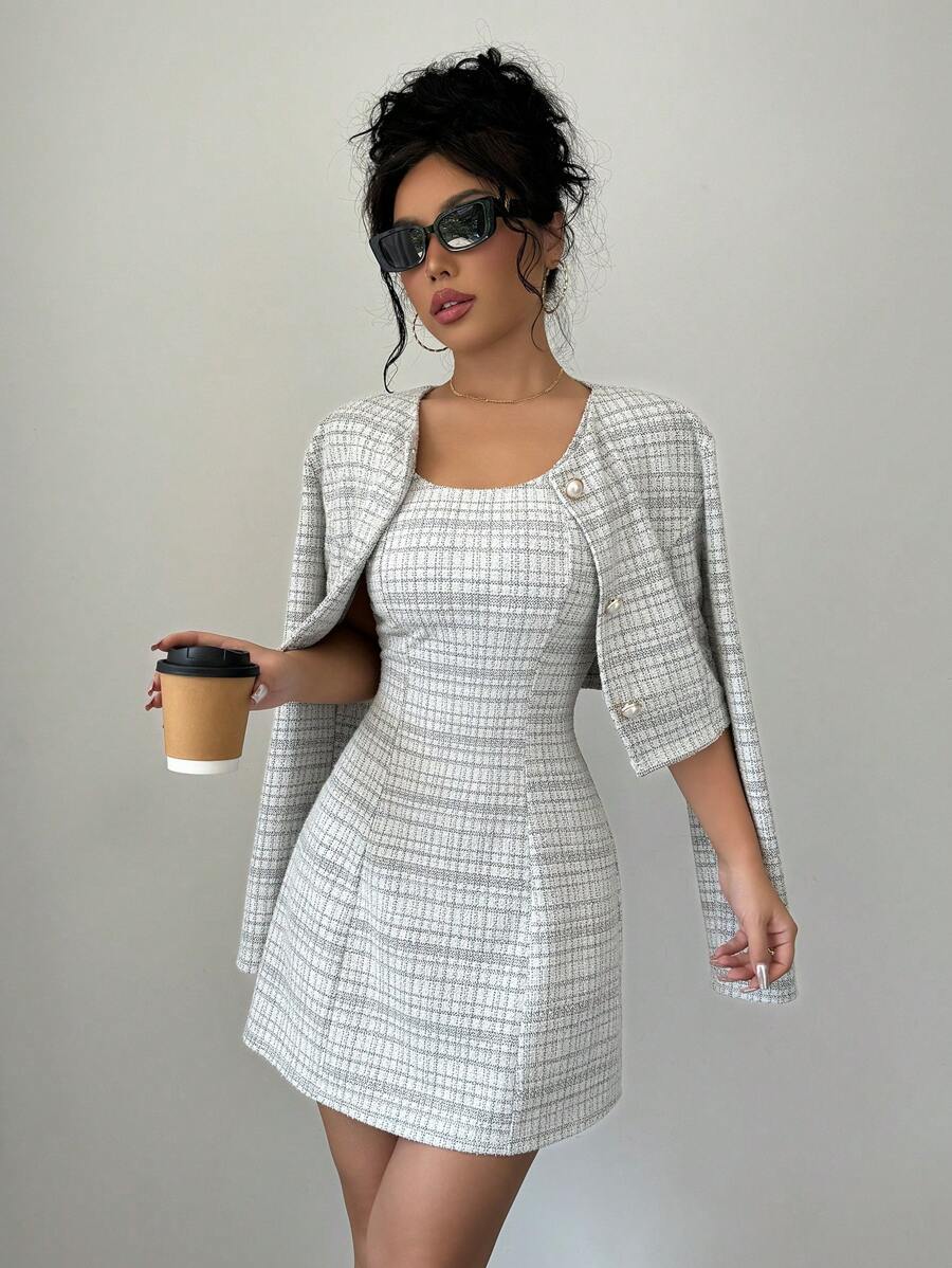 Completo da donna elegante e alla moda con giacca corta e vestito senza maniche