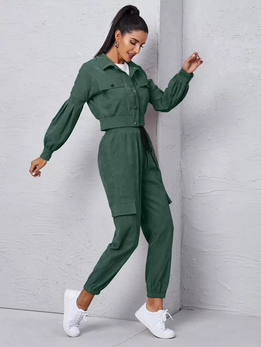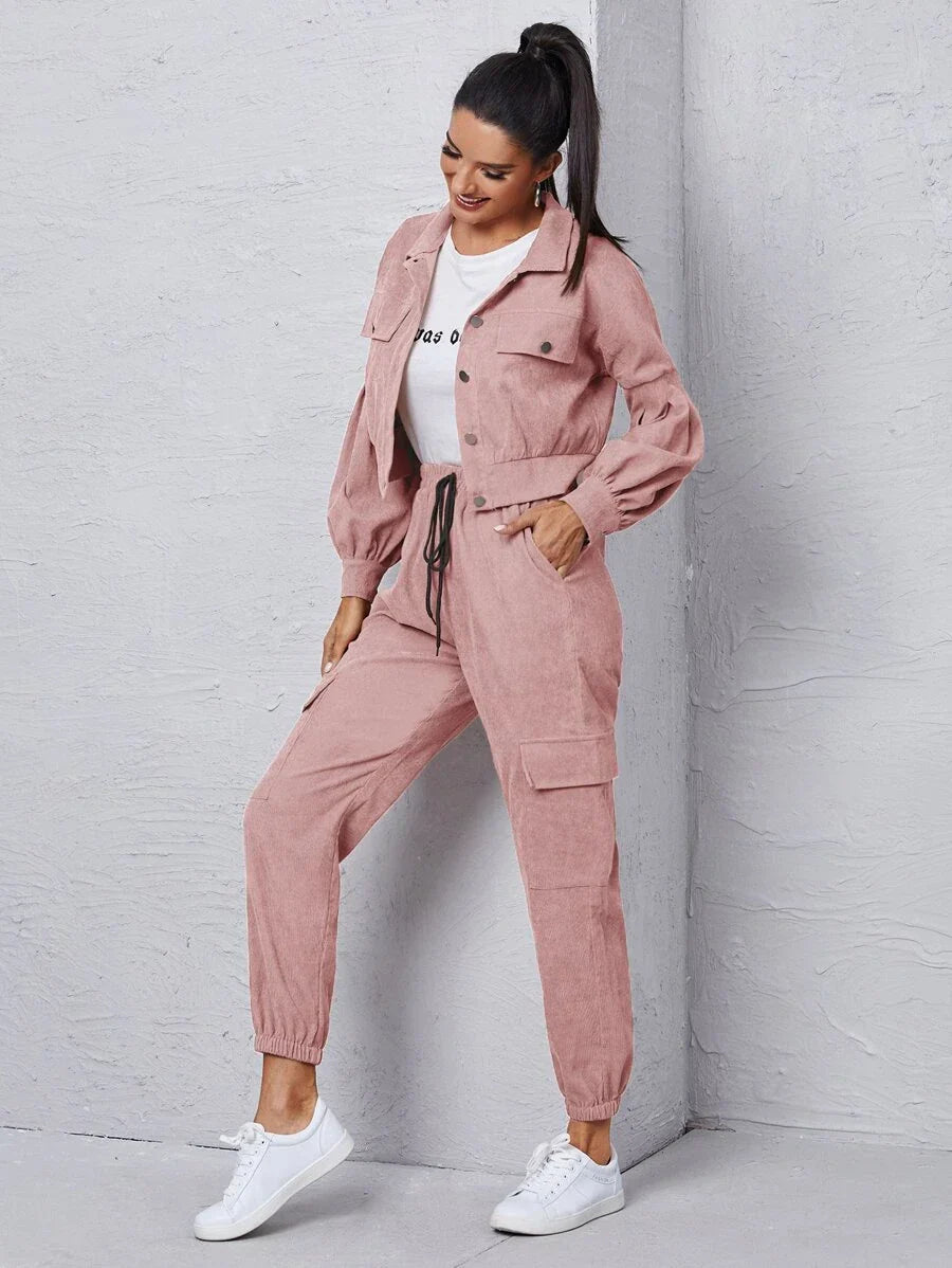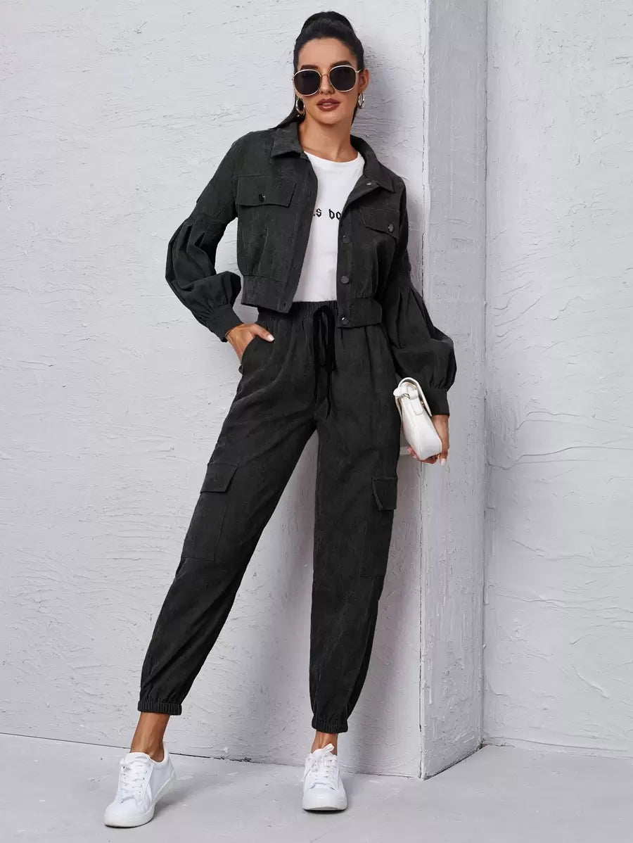 Coordinato 2 pezzi Pantaloni cargo con nodo e giacca con patta in velluto a coste