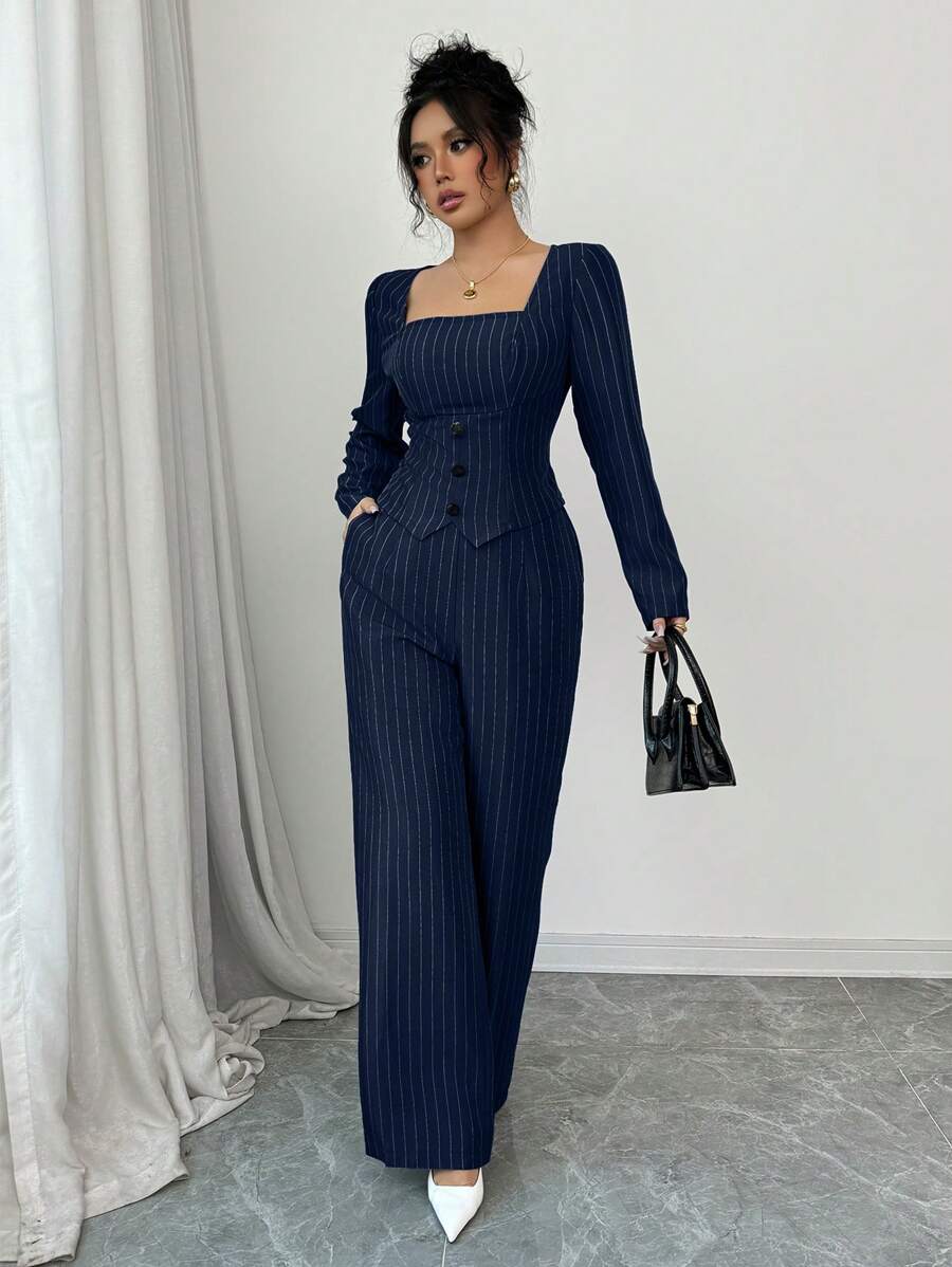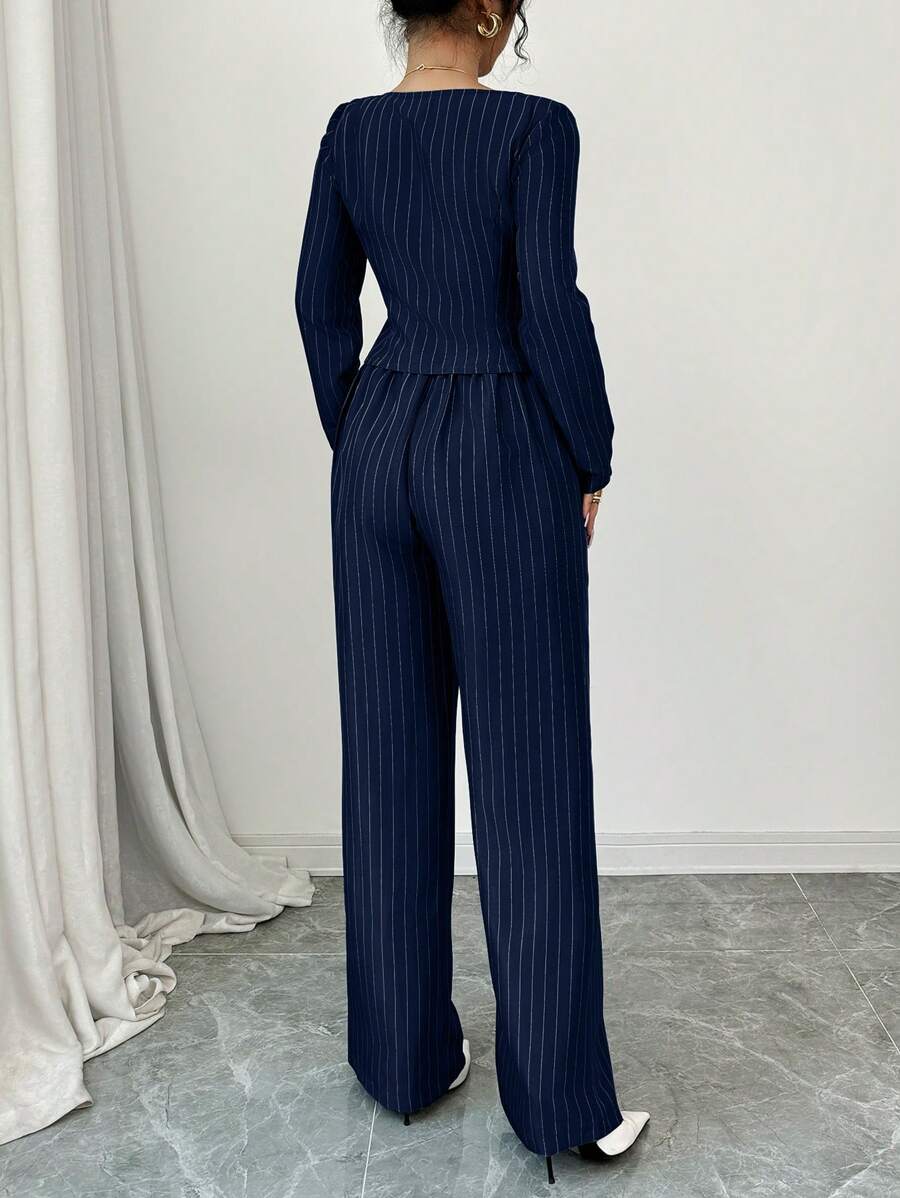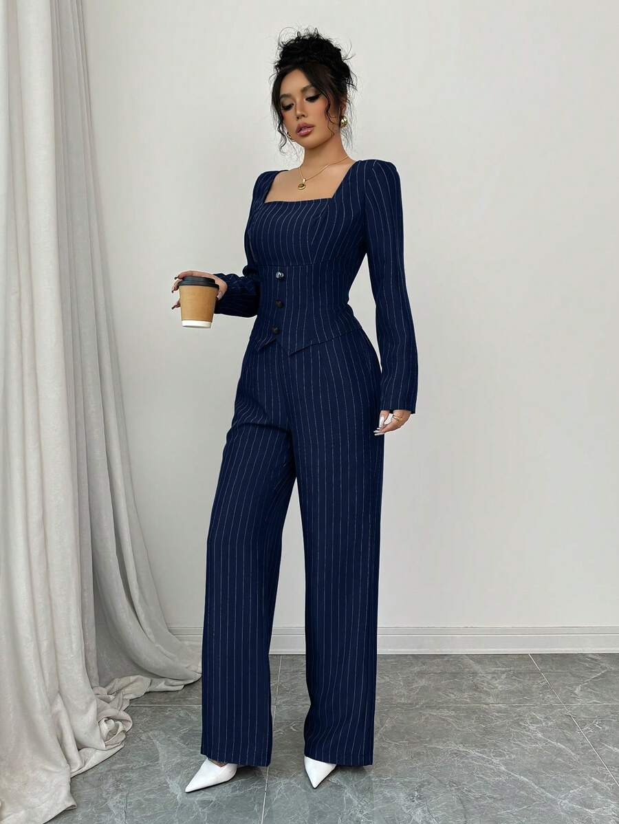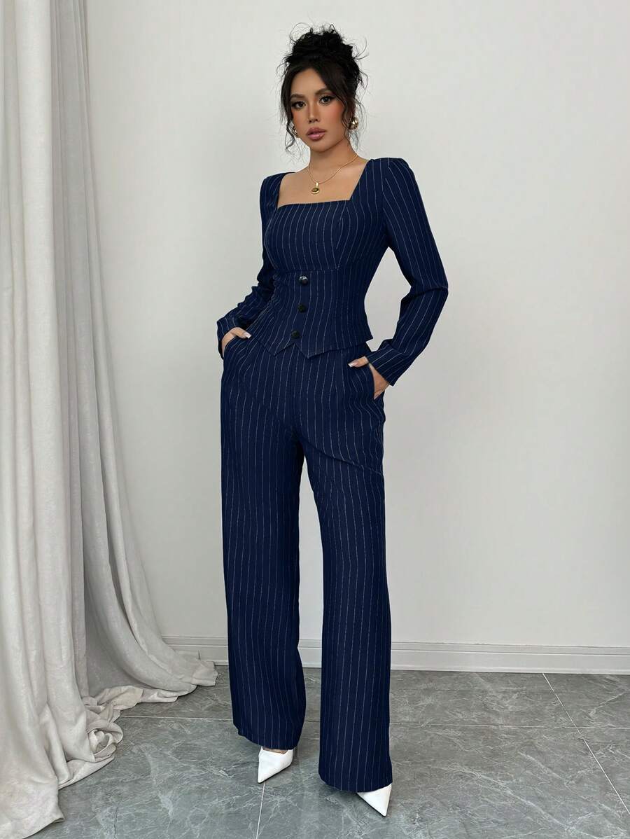 Set: Blazer da donna con colletto quadrato a righe Pantaloni da tailleur a righe da donna