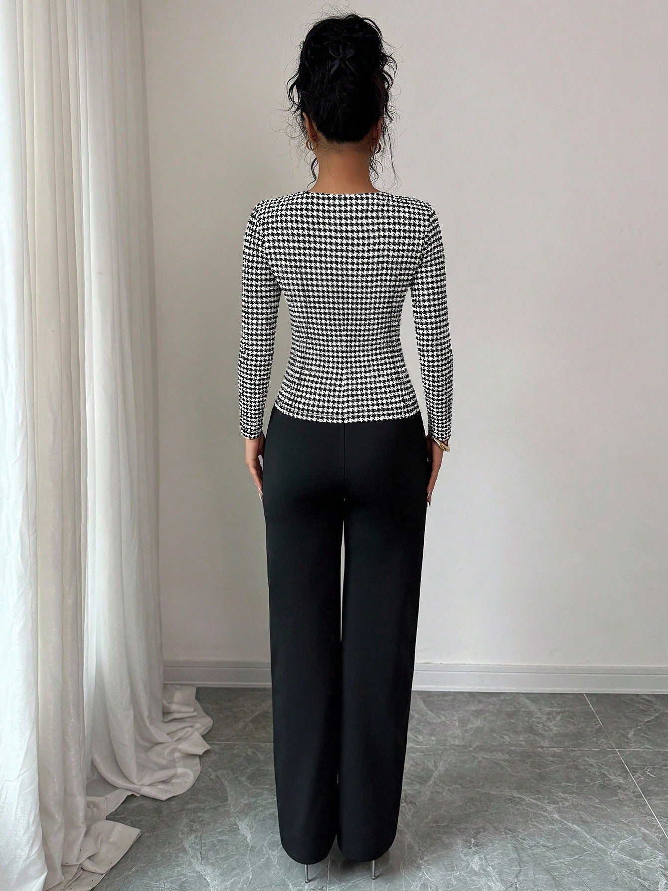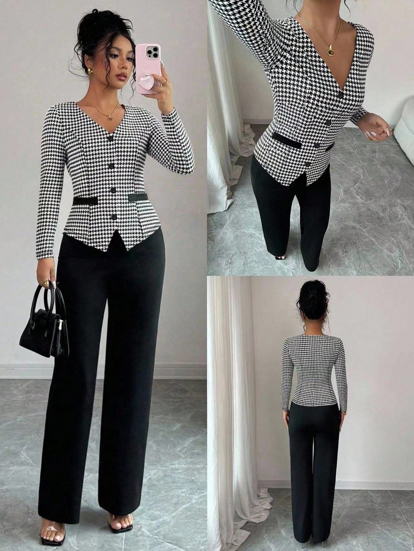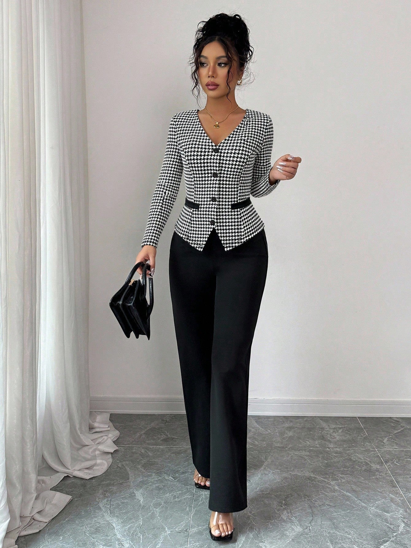 Set da 2 pezzi composto da top a scollo a V con motivo pied-de-poule e pantaloni a gamba dritta da donna