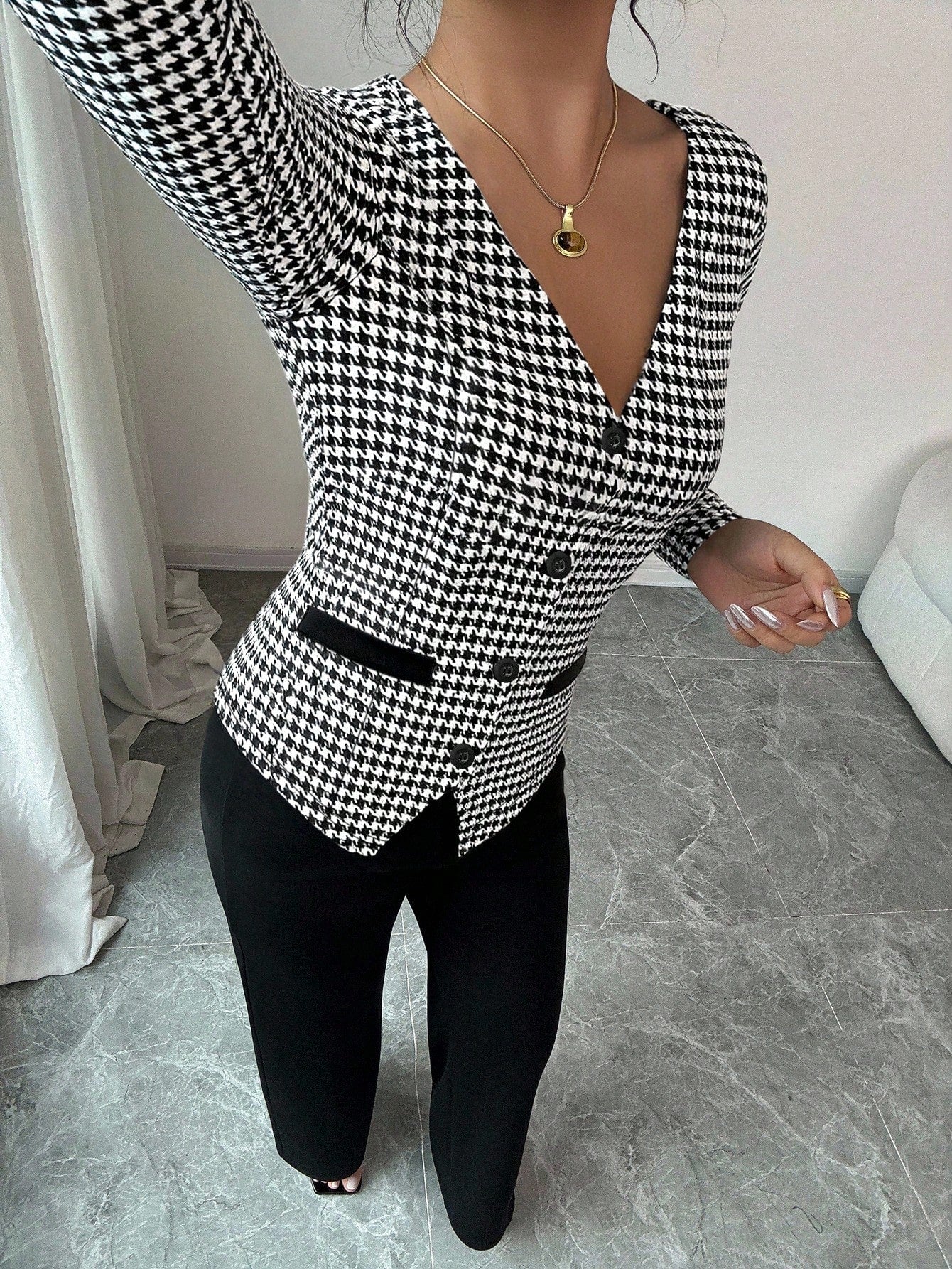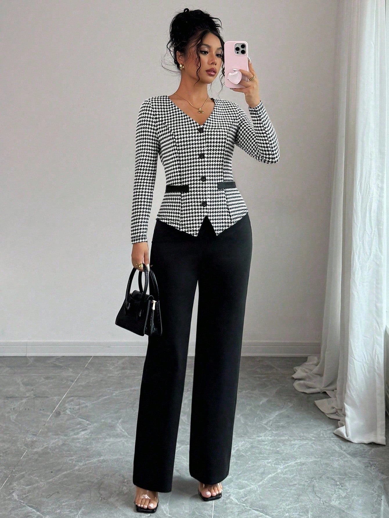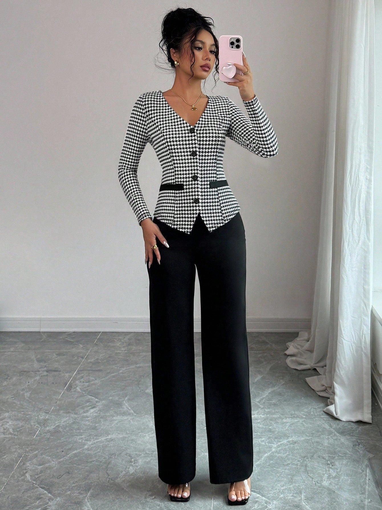 Set da 2 pezzi composto da top a scollo a V con motivo pied-de-poule e pantaloni a gamba dritta da donna