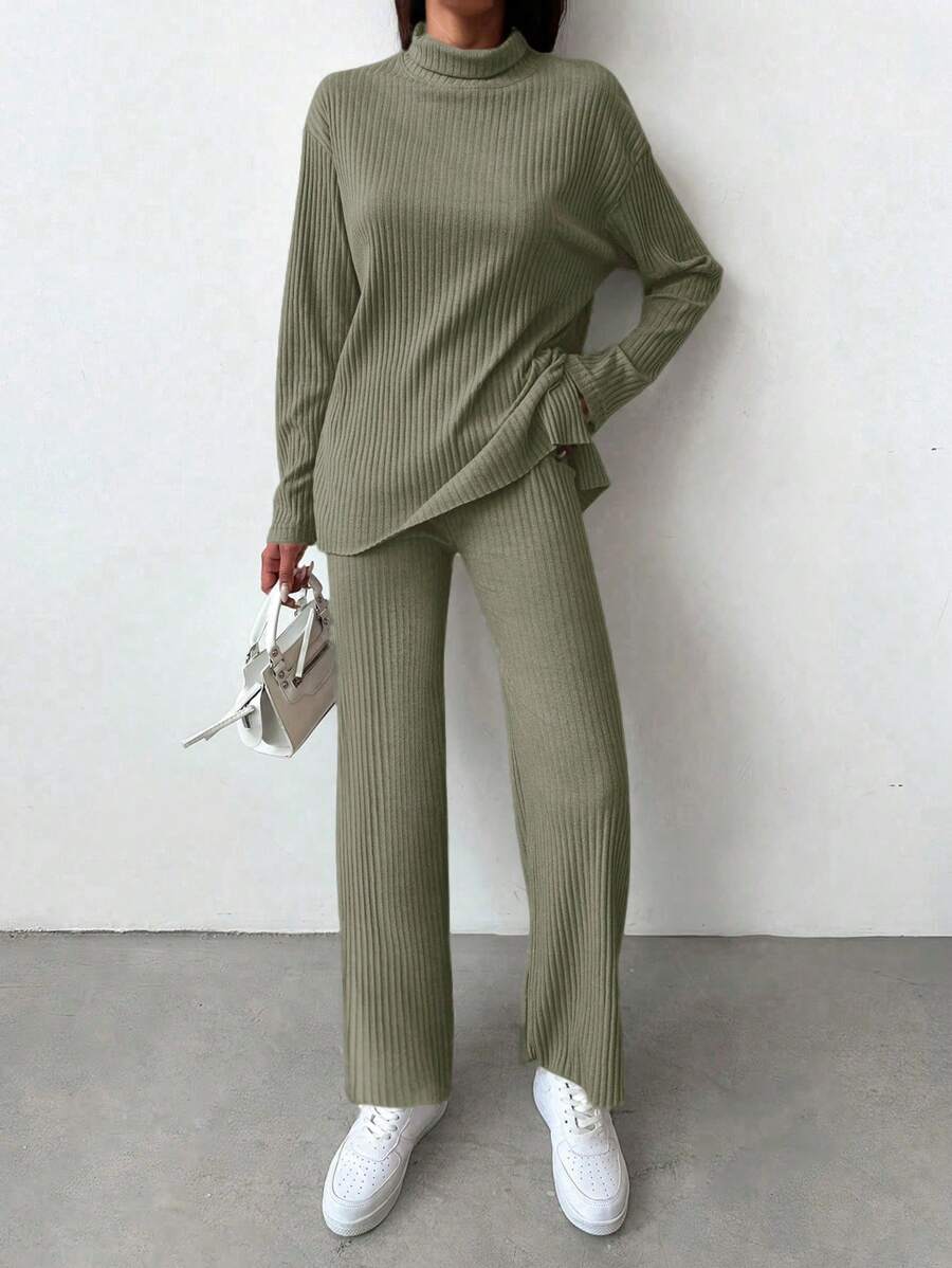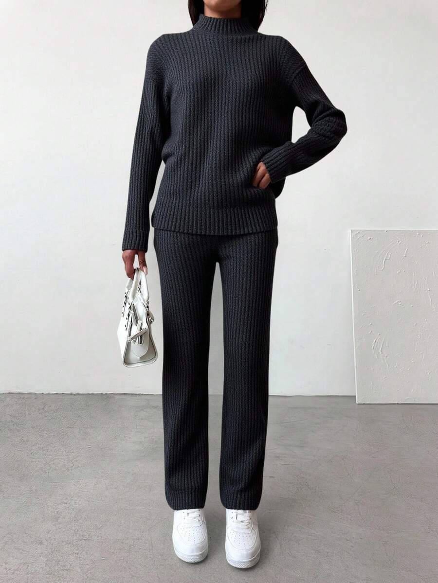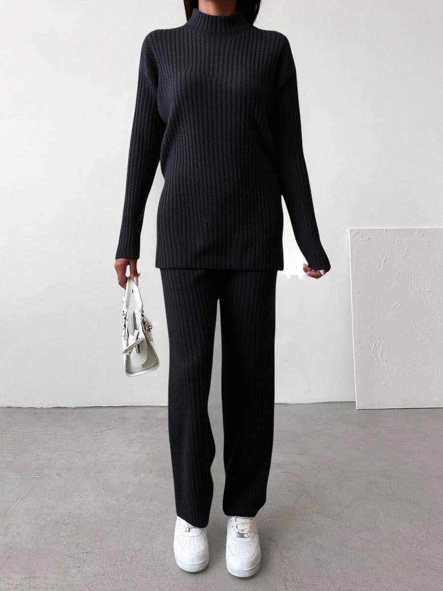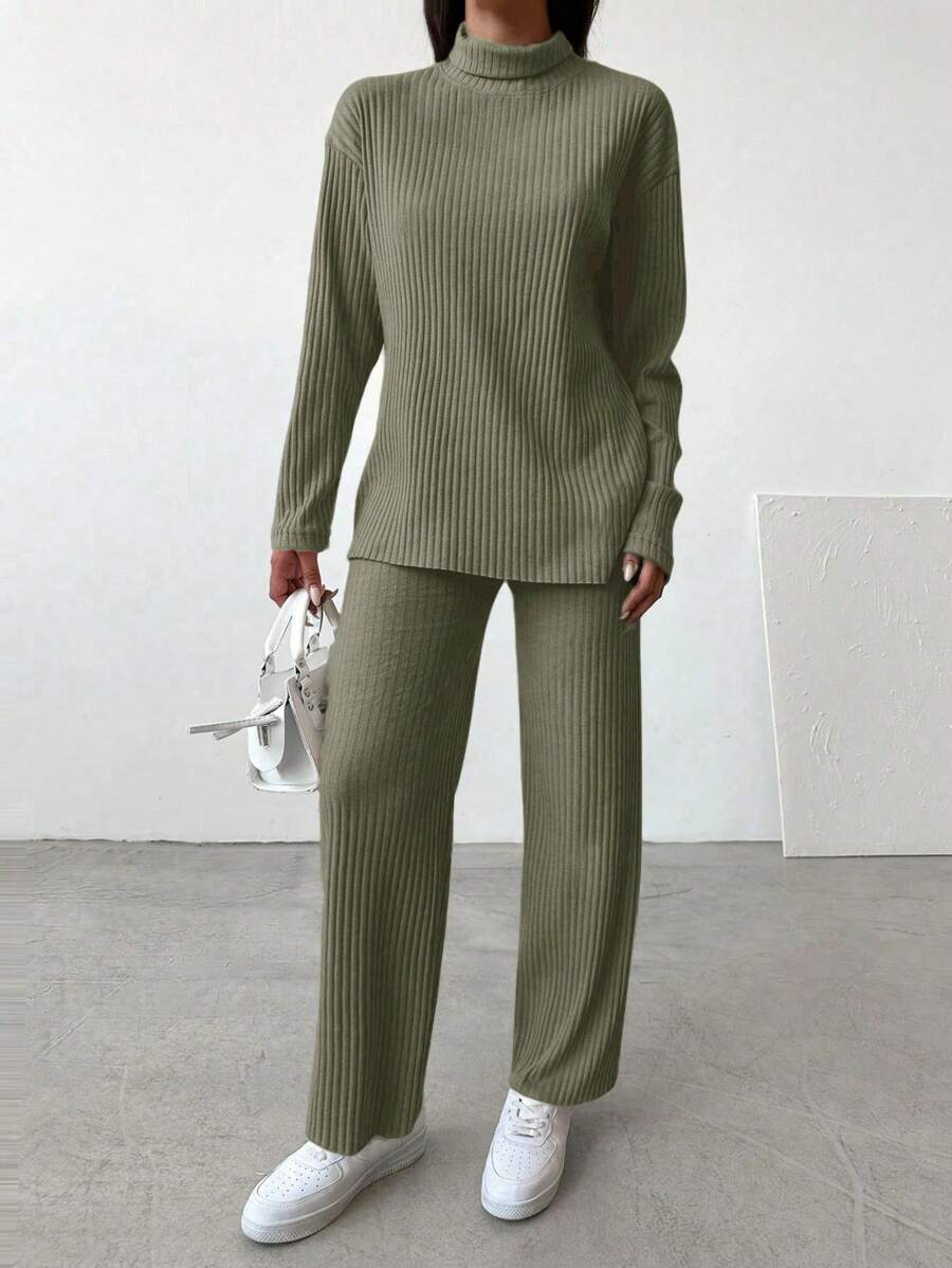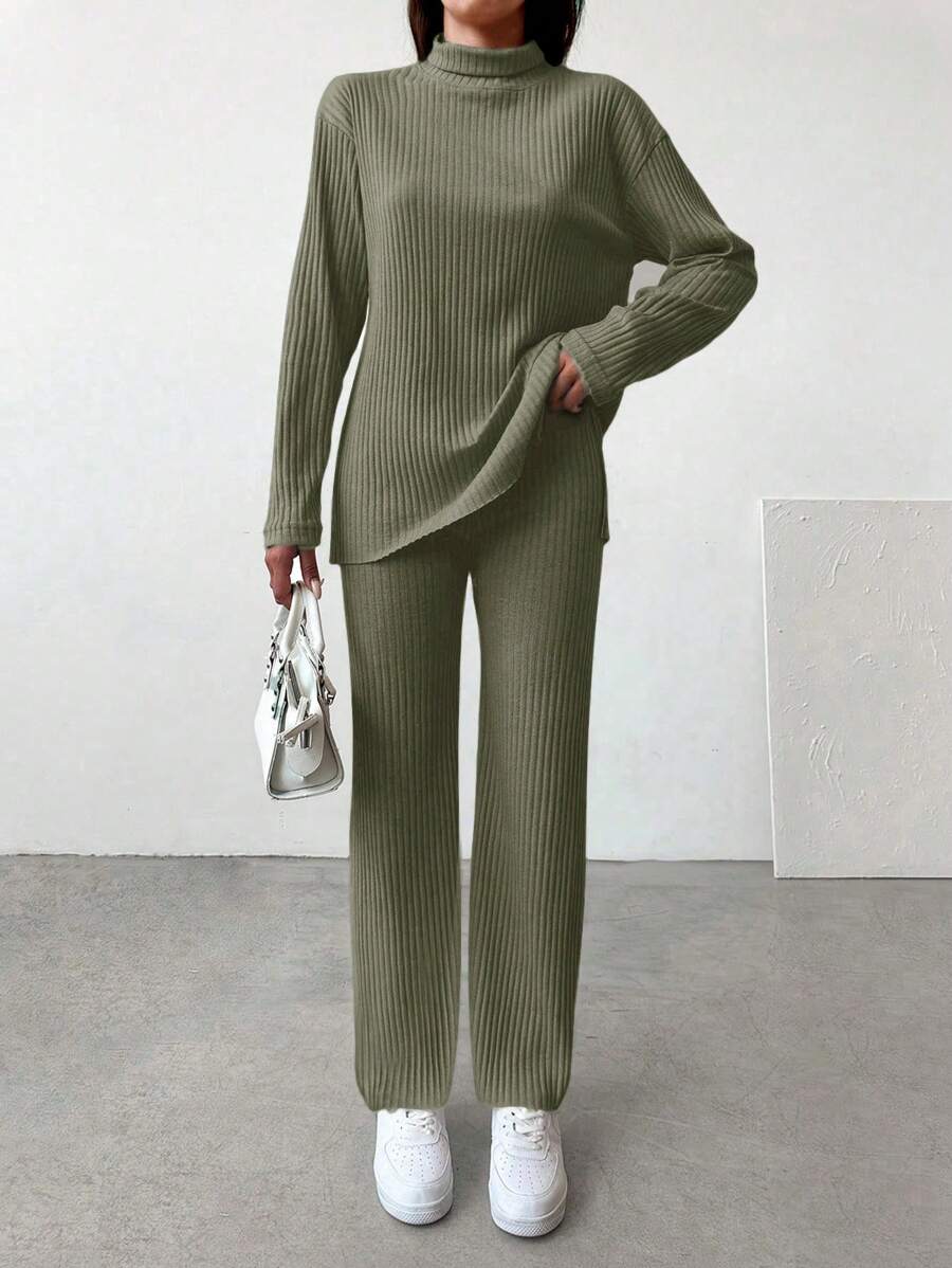 Set Due Pezzi Di Maglia A Collo Alto A Coste Con Tinta Unita Per Le Donne (maglia A Collo Alto E Pantaloni)