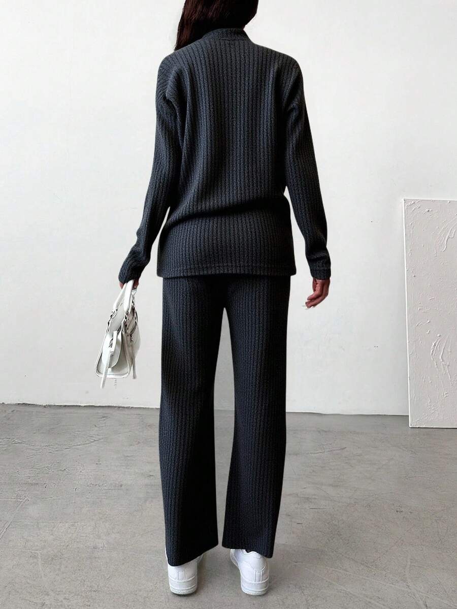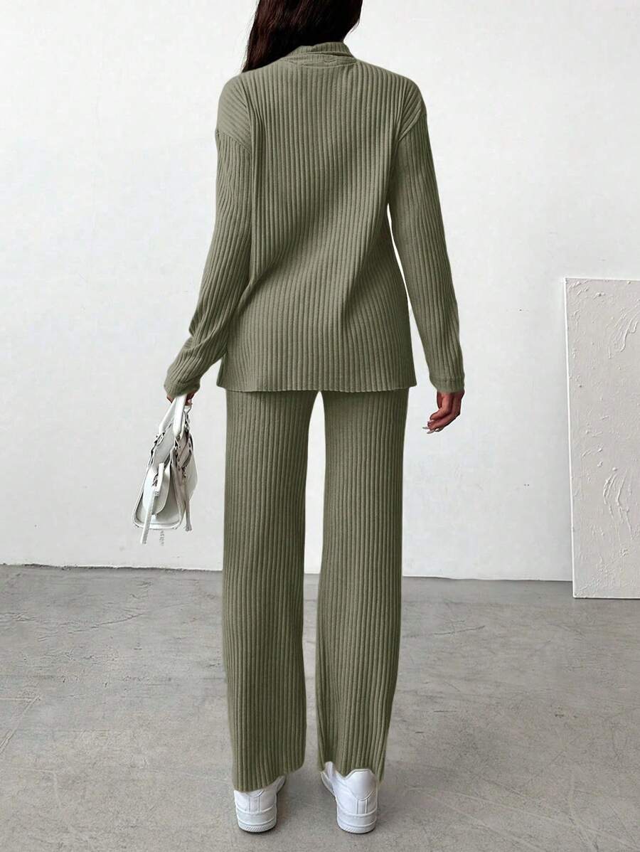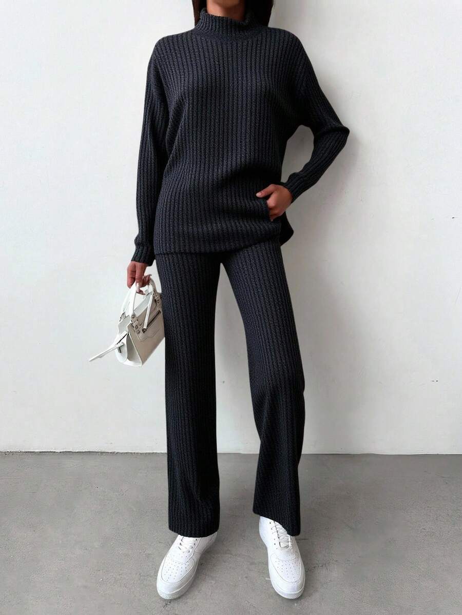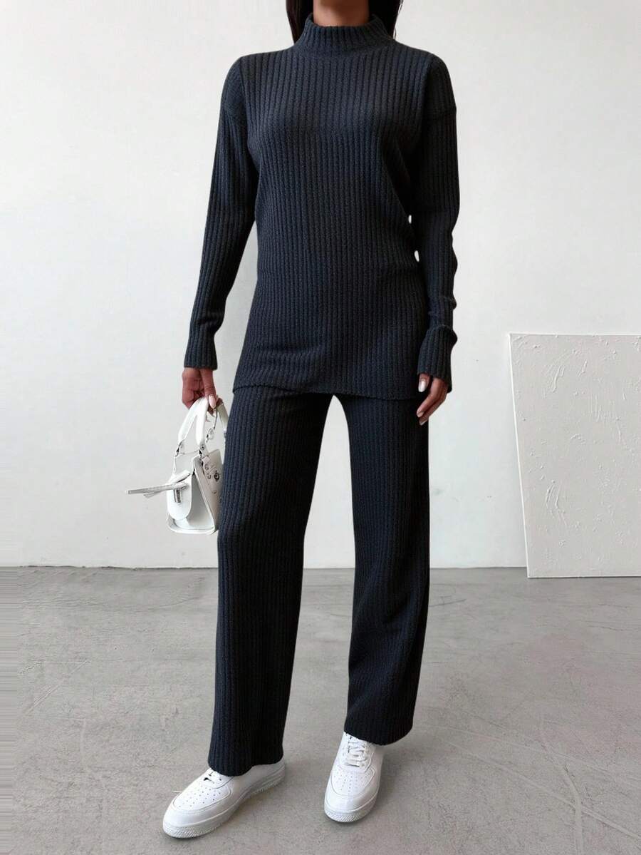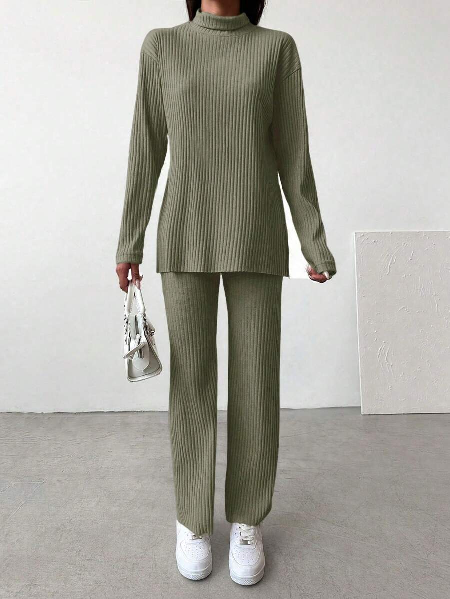 Set Due Pezzi Di Maglia A Collo Alto A Coste Con Tinta Unita Per Le Donne (maglia A Collo Alto E Pantaloni)