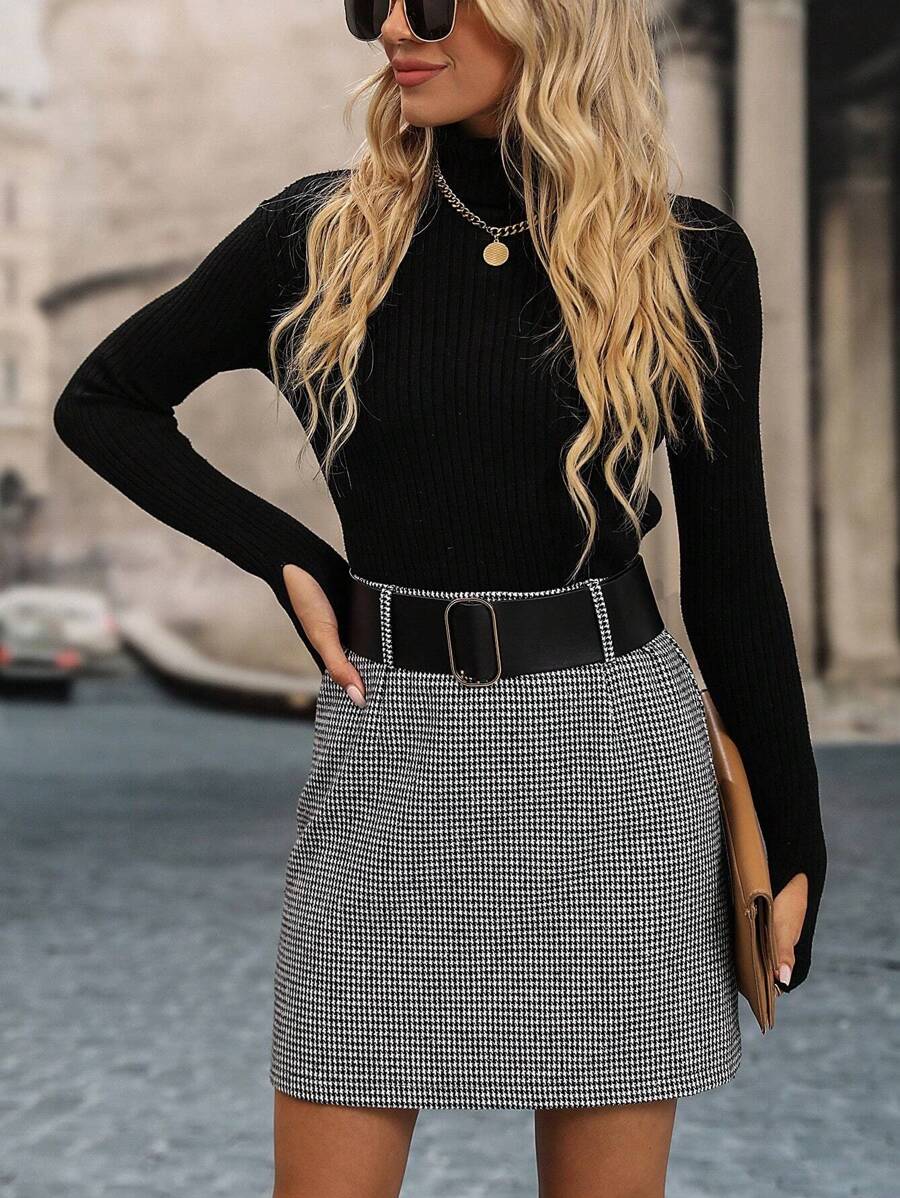 Gonna corta dritta ed elegante a vita alta con motivo pied-de-poule per donne