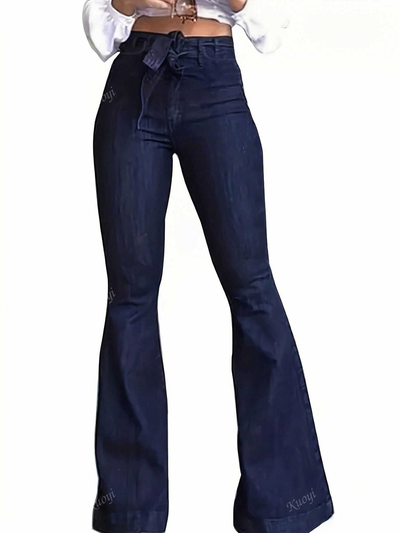 Jeans a vita alta con cintura, a gamba larga, con elastico, di colore unito