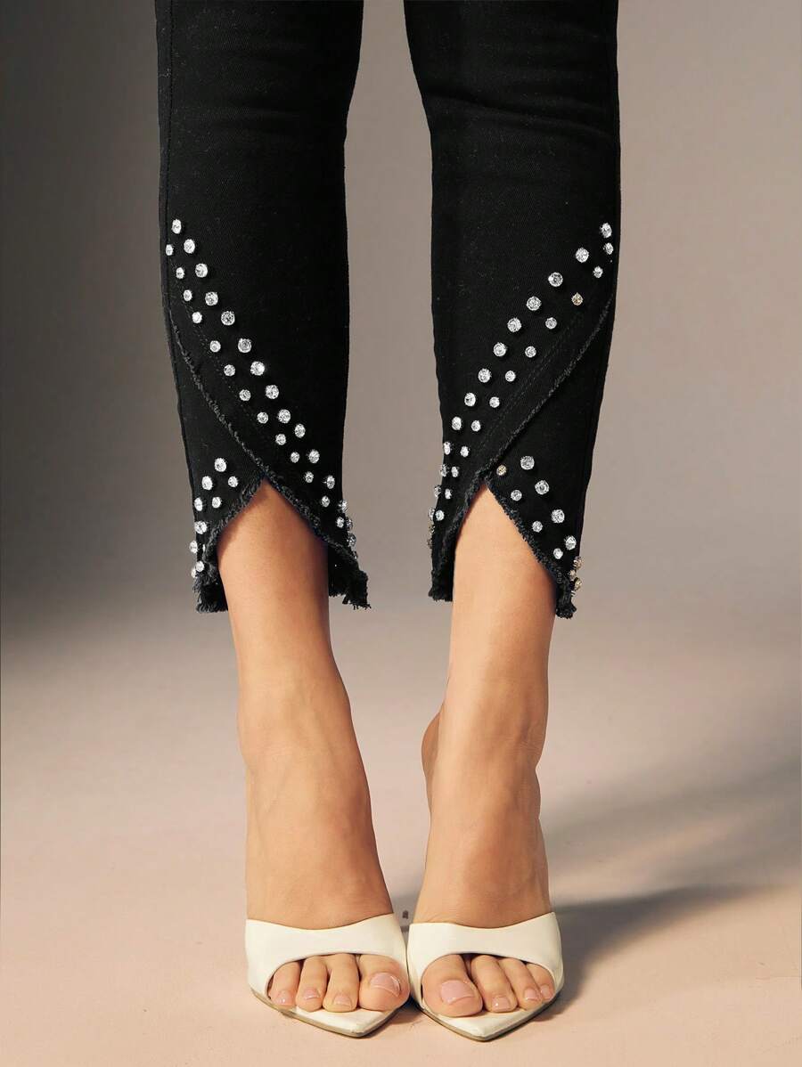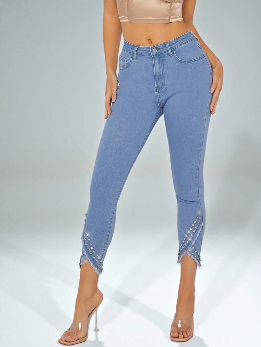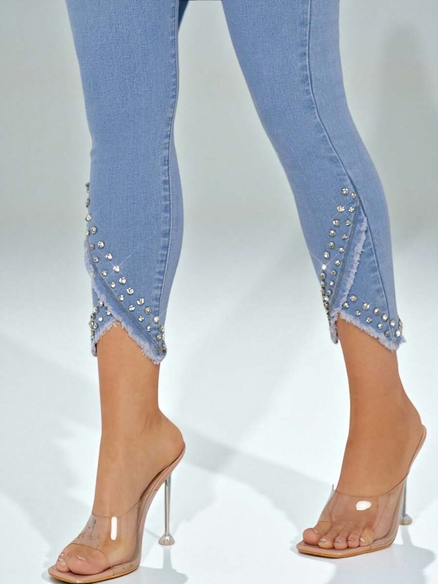 Jeans aderenti blu con strass asimmetrici e orlo grezzo