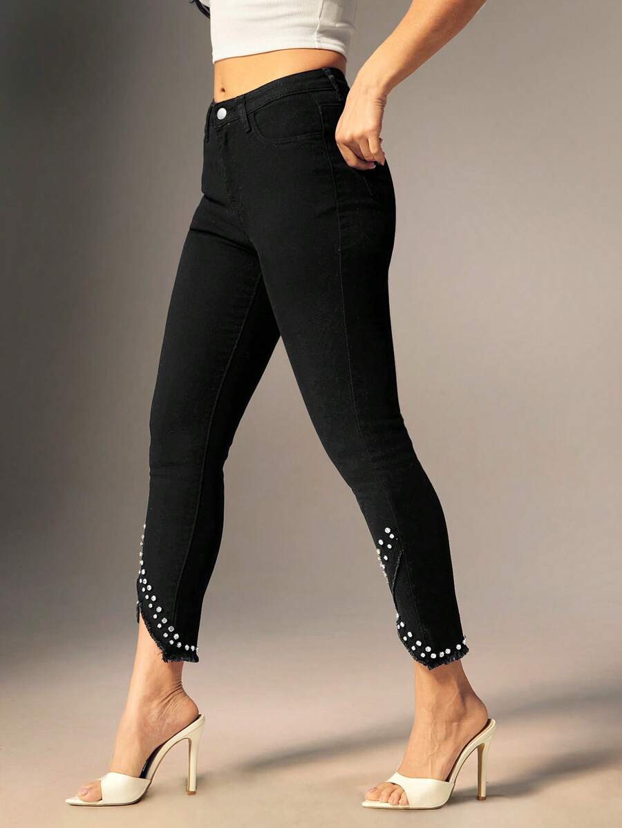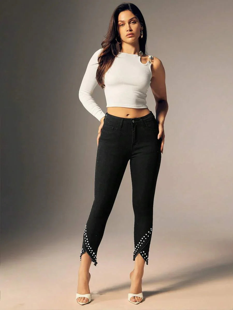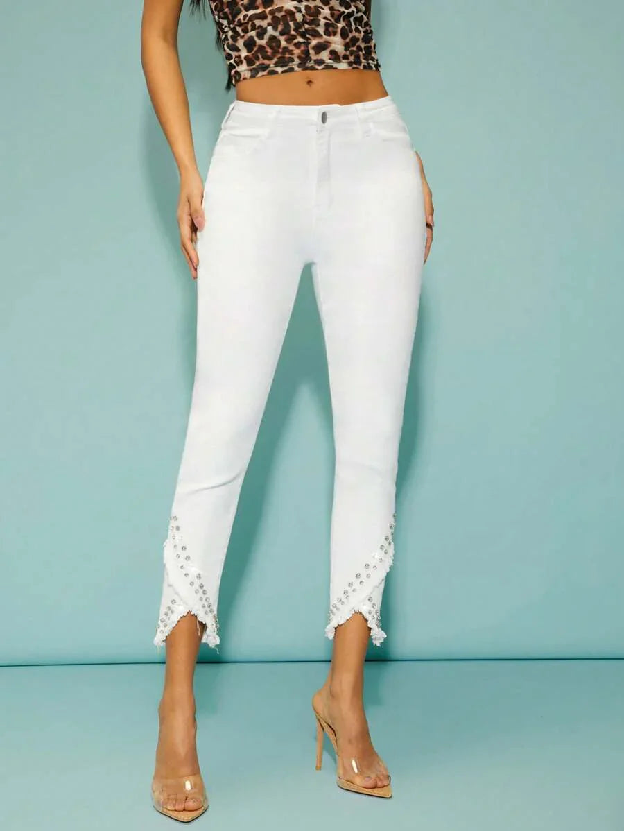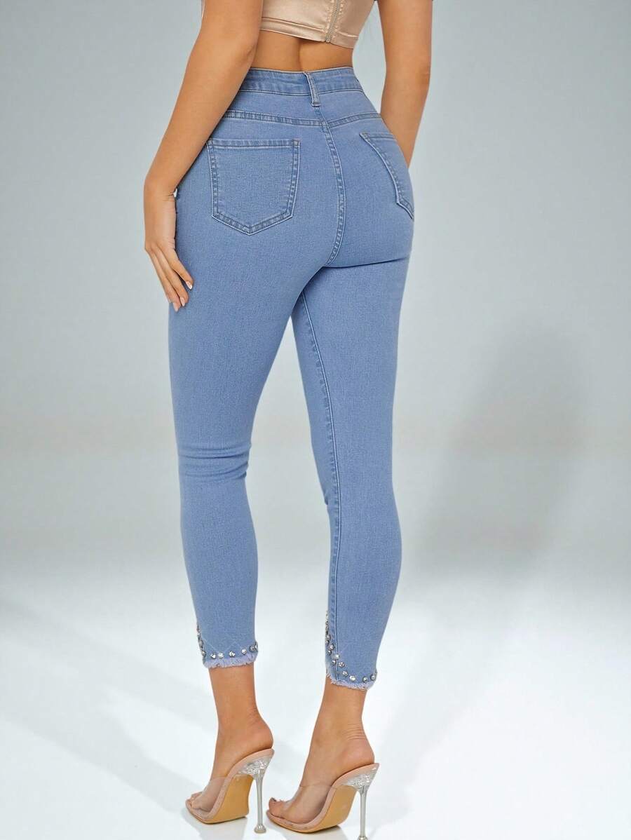 Jeans aderenti blu con strass asimmetrici e orlo grezzo
